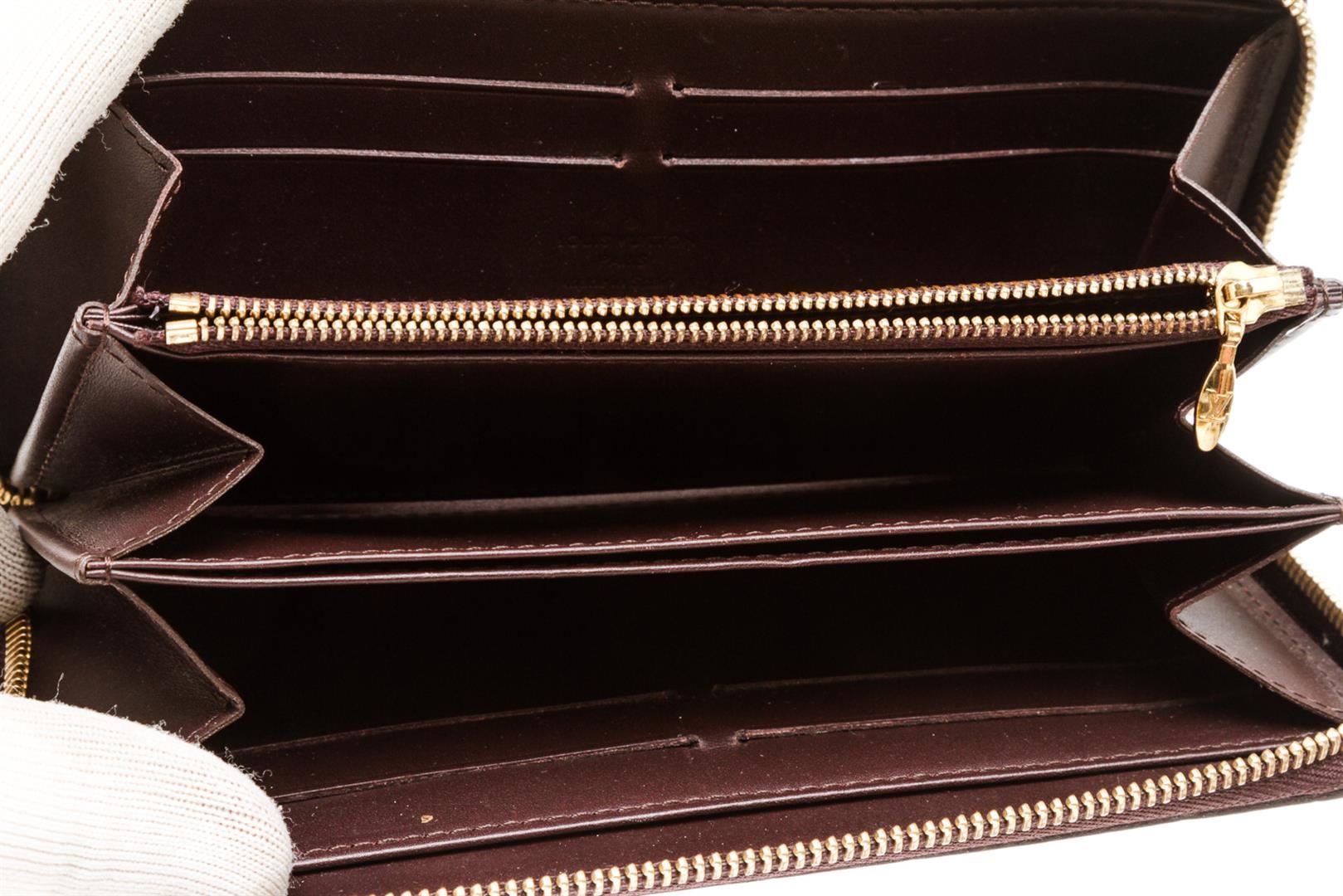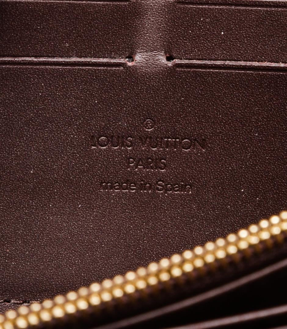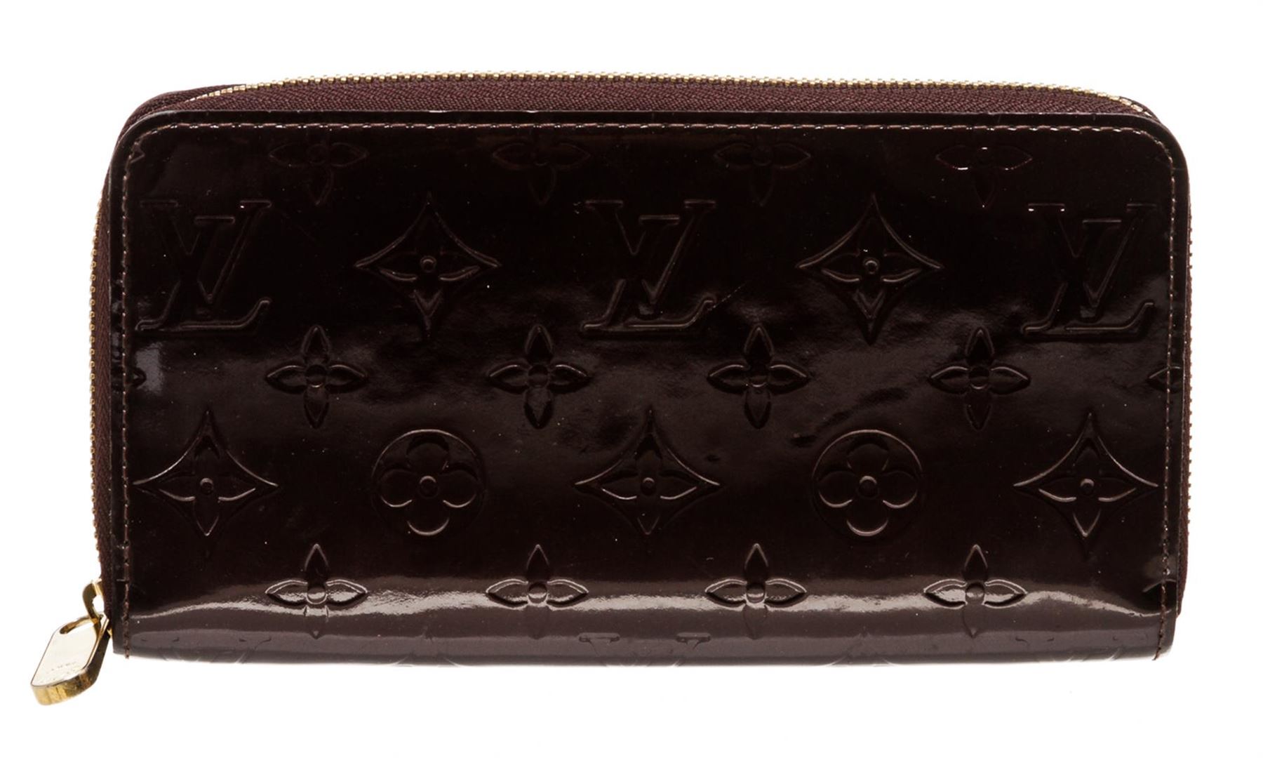 Monogram Vernis leather Louis Vuitton Zippy wallet with brass hardware, tonal leather lining, four interior compartments; one with zip closure, three bill compartments, eight card slots and zip-around closure.