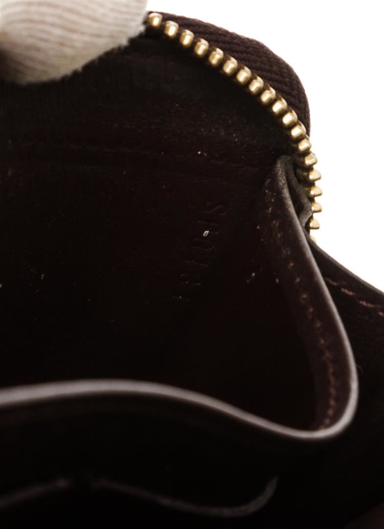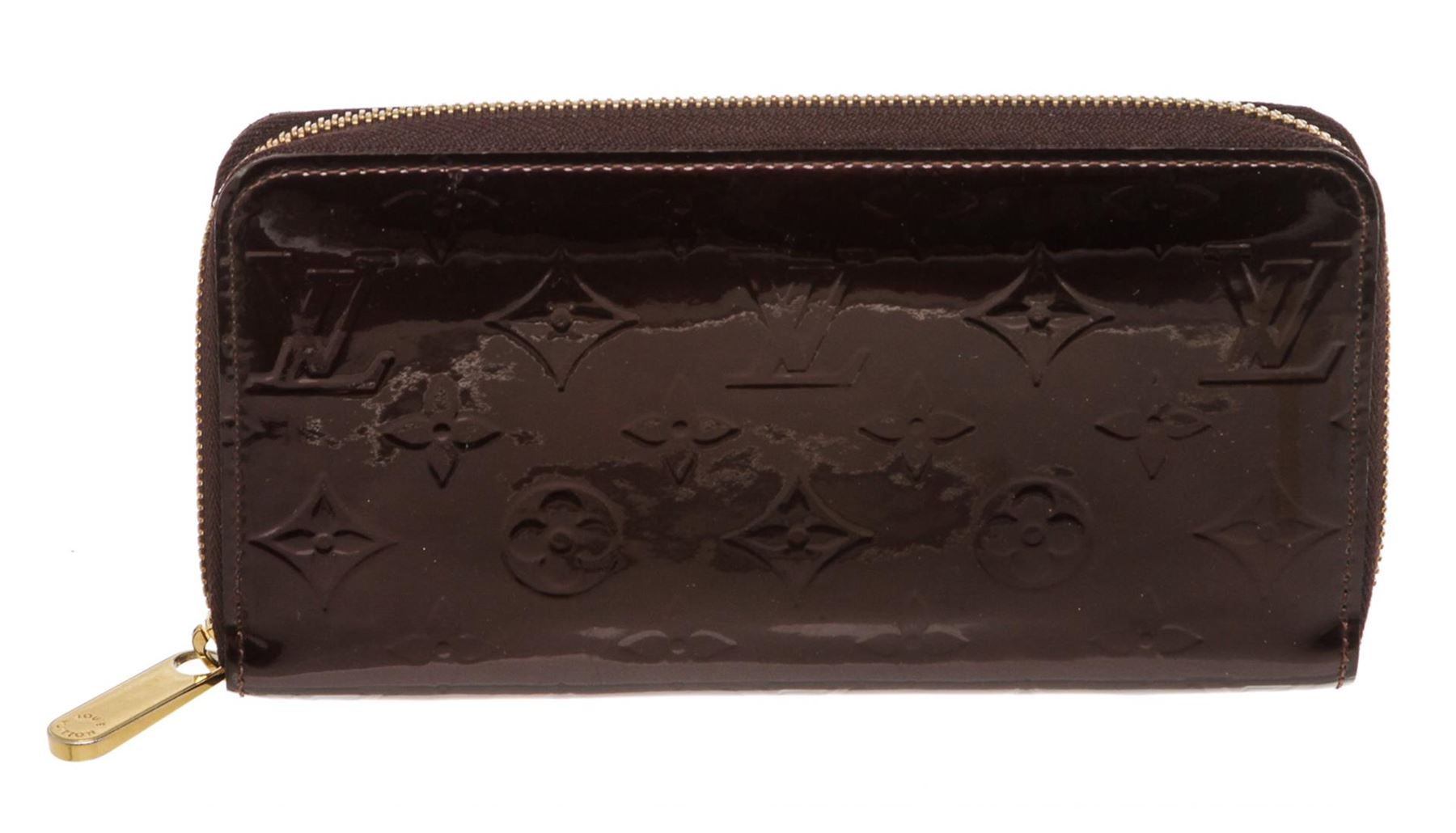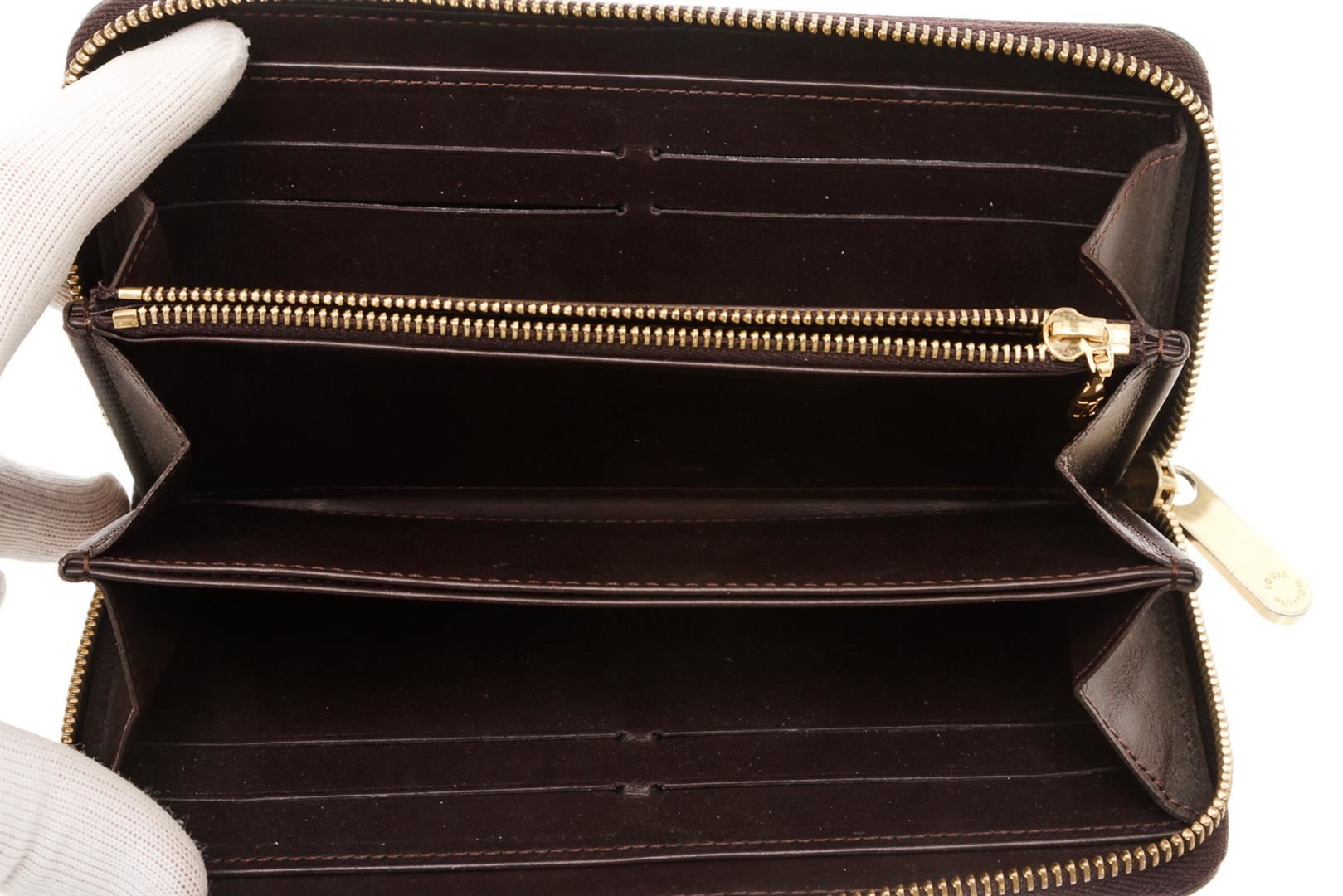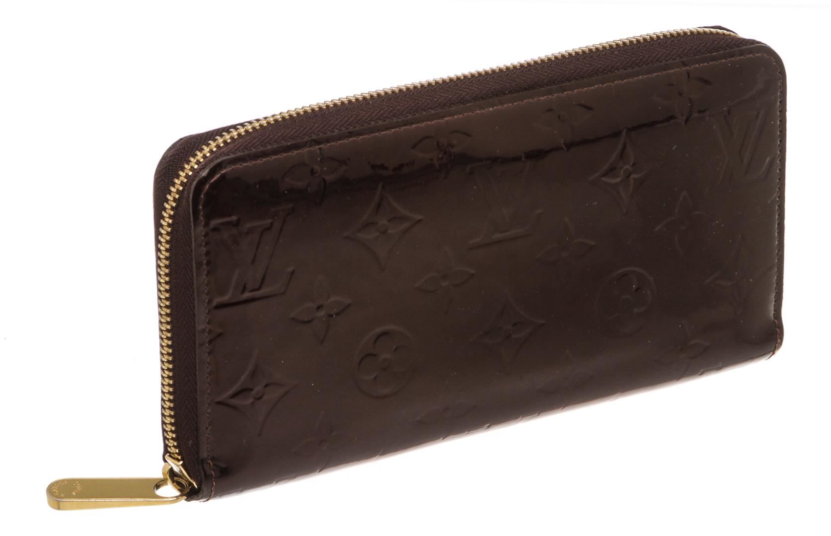 Monogram Vernis leather Louis Vuitton Zippy wallet with brass hardware, tonal leather lining, four interior compartments; one with zip closure, three bill compartments, eight card slots and zip-around closure.