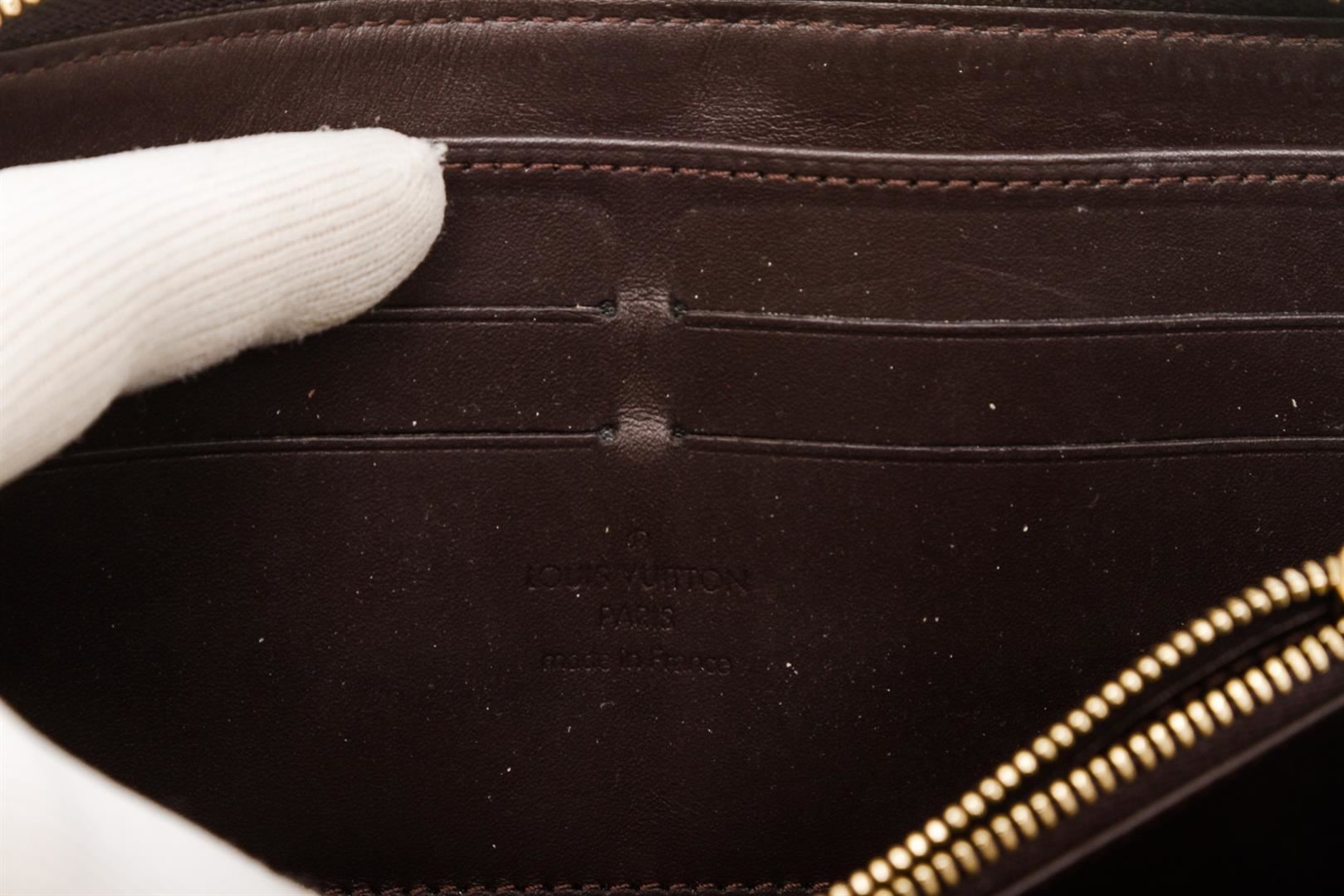 Monogram Vernis leather Louis Vuitton Zippy wallet with brass hardware, tonal leather lining, four interior compartments; one with zip closure, three bill compartments, eight card slots and zip-around closure.