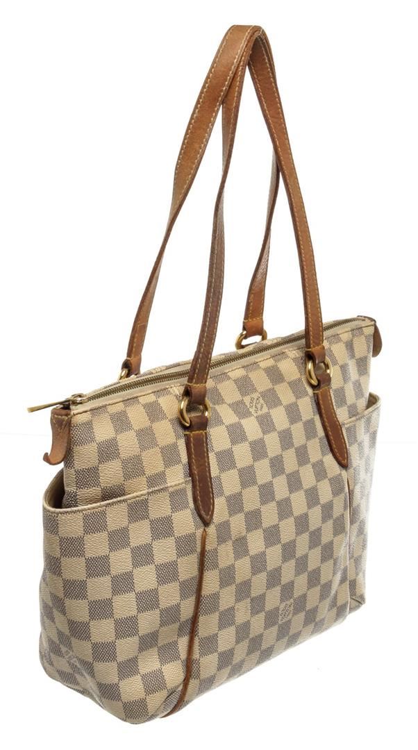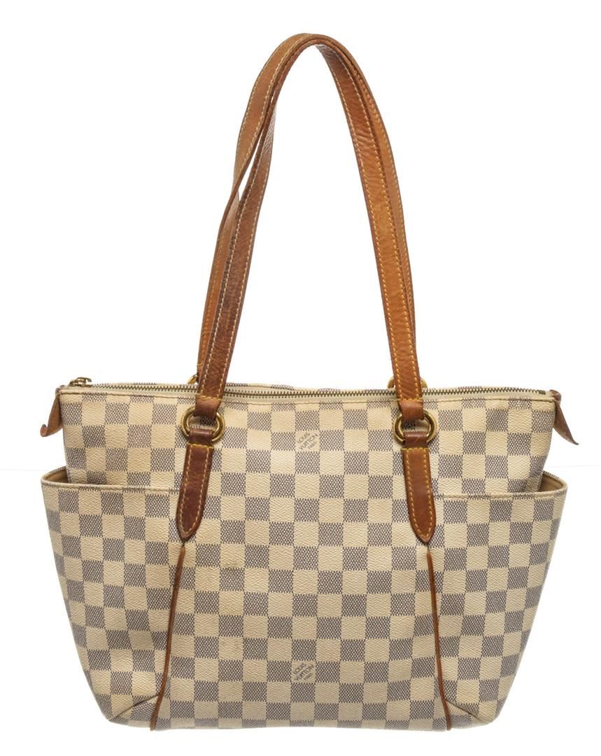 Louis Vuitton Beige Damier Canvas Totally PM Tote Bag with damier canvas, monogram gold-tone hardware, trim tan vachetta leather, exterior slip pockets, interior slip pocket, shoulder strap and zipper closure.