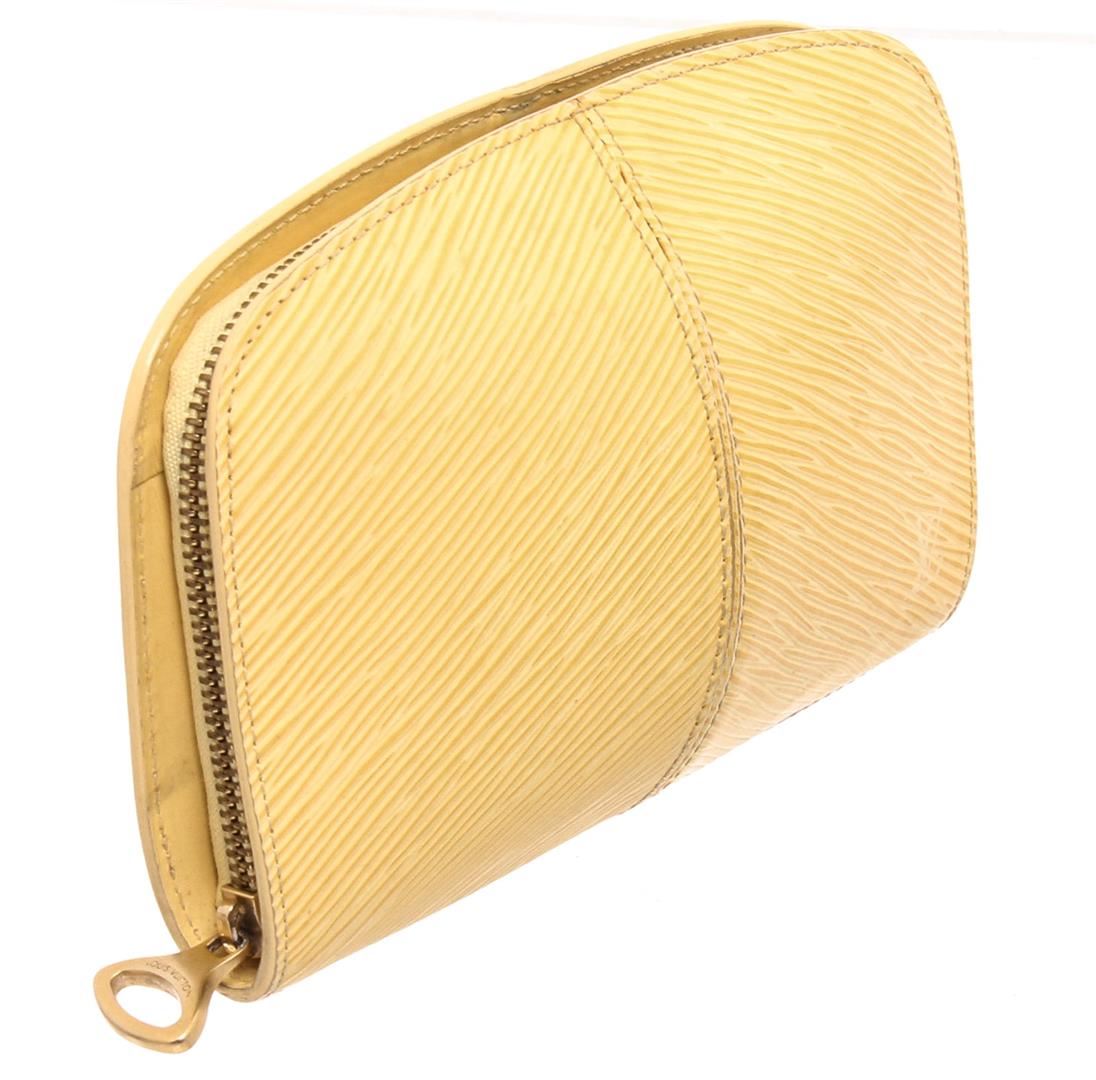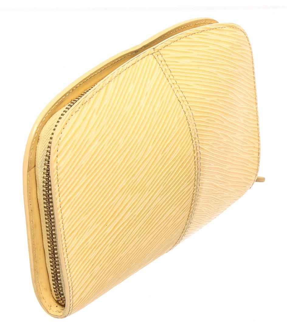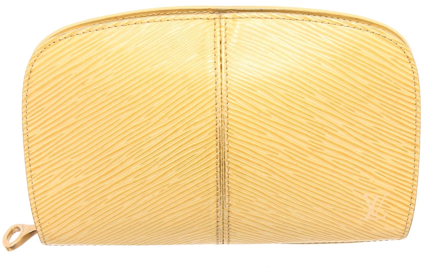 Louis Vuitton beige mini Dauphine case with gold-tone hardware, embossed logo at front face, tan leather interior lining and overall zip closure.