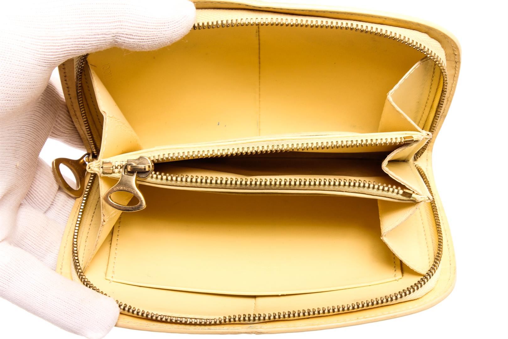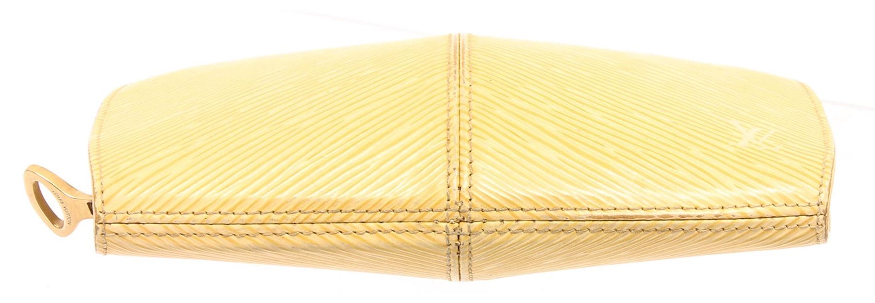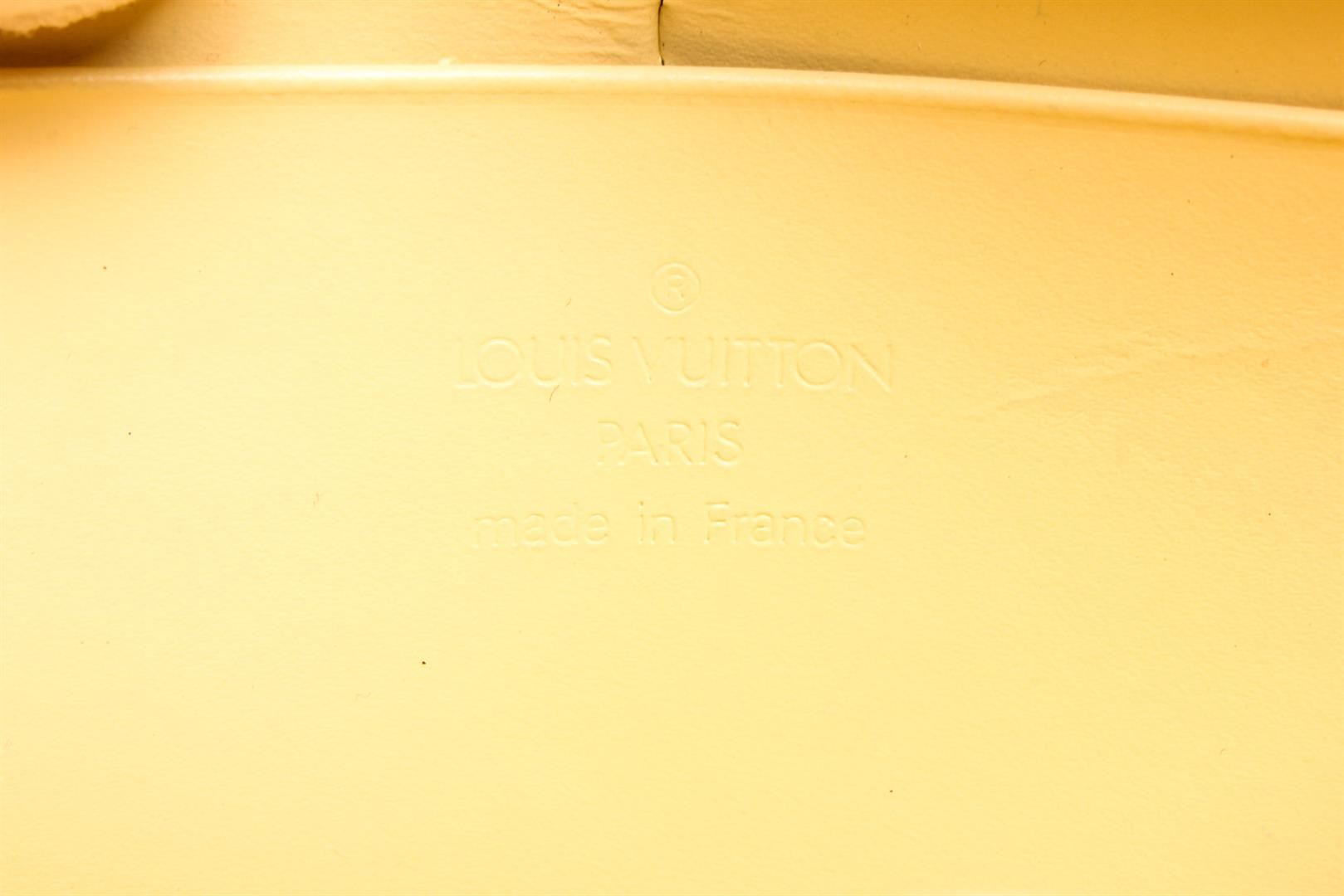 Louis Vuitton beige mini Dauphine case with gold-tone hardware, embossed logo at front face, tan leather interior lining and overall zip closure.