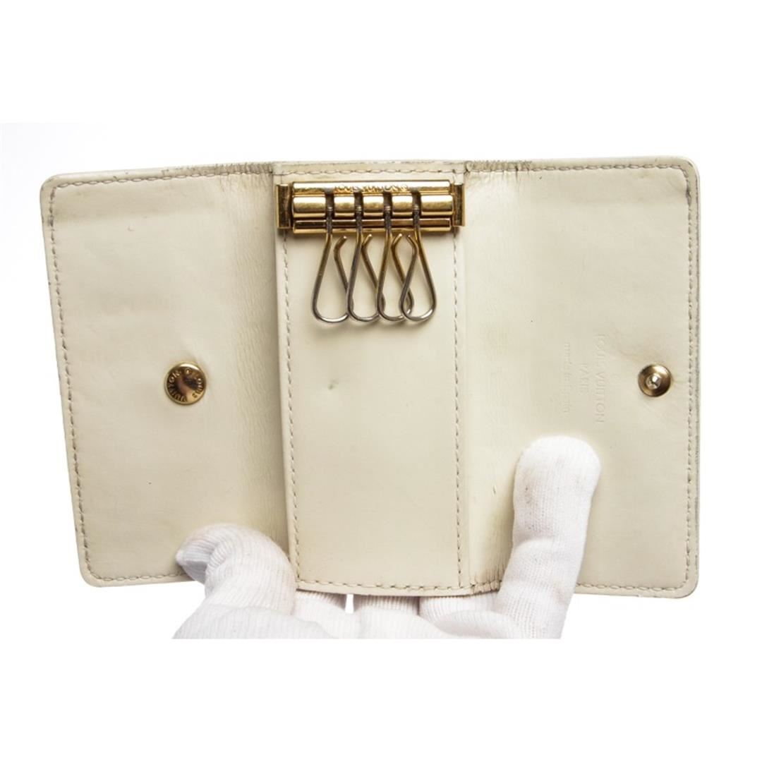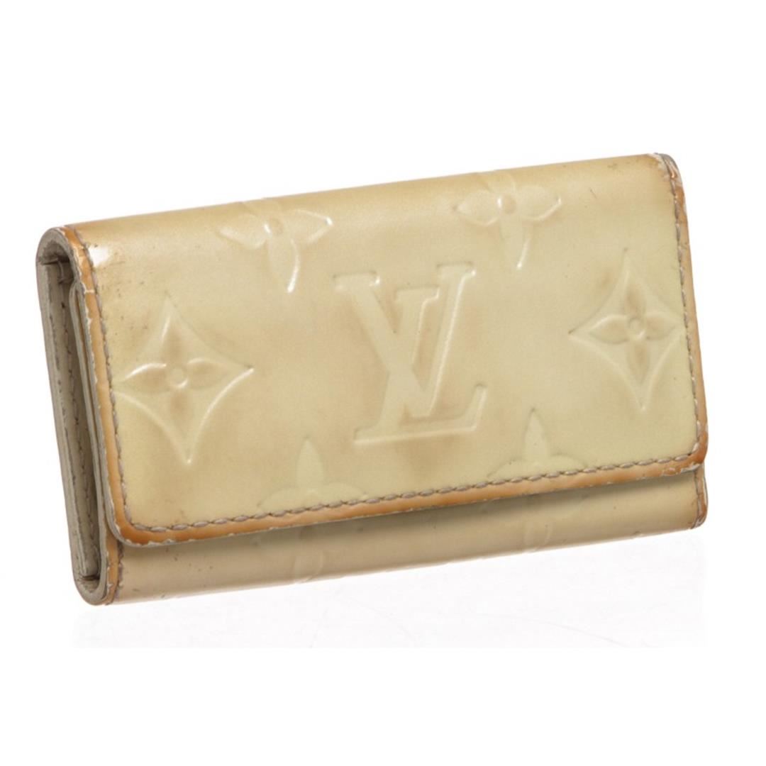 Beige monogram Vernis leather Louis Vuitton key holder with antiqued silver-tone hardware, tonal smooth leather lining, four key hooks at interior wall and snap closure at front flap. Item is pre-owned.
