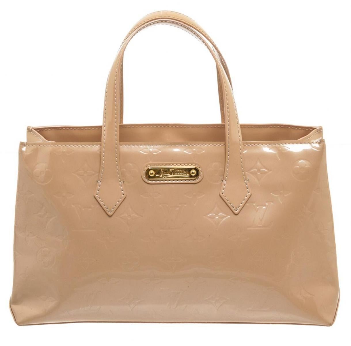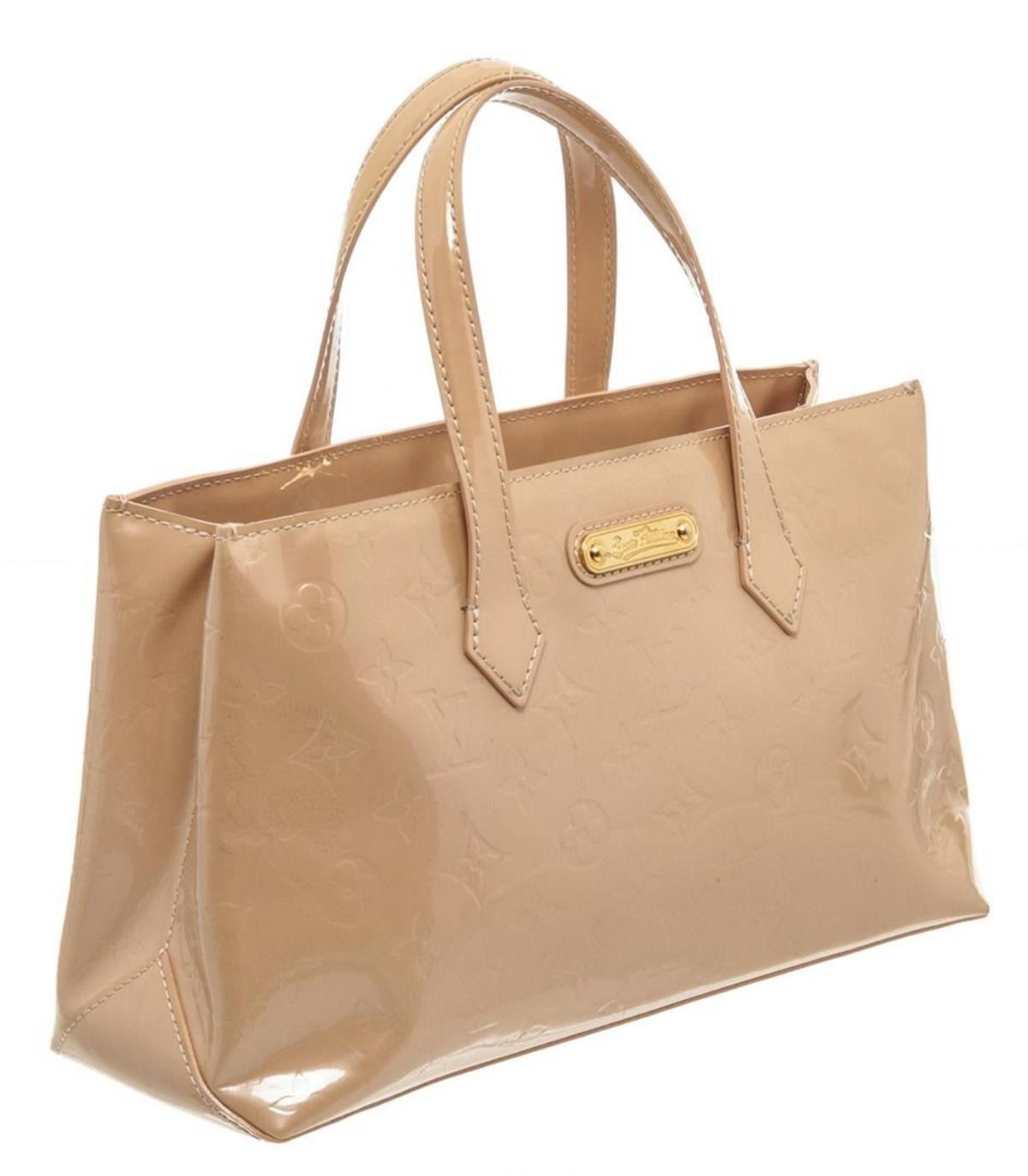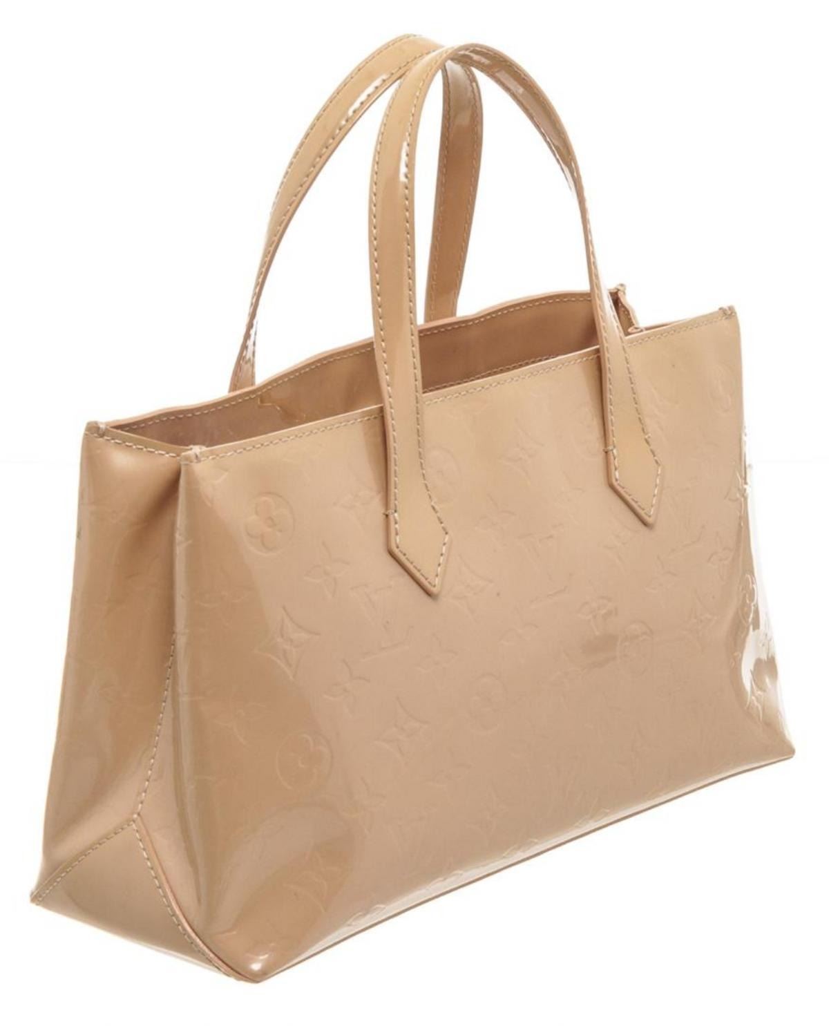 One Louis Vuitton Beige Monogram Vernis Leather Wilshire PM Bag. Beige Monogram Vernis leather Louis Vuitton Wilshire PM with brass hardware, dual flat top handles, logo placard at front face, tonal canvas lining, single zip pocket at interior wall and clasp closure at top. MKX