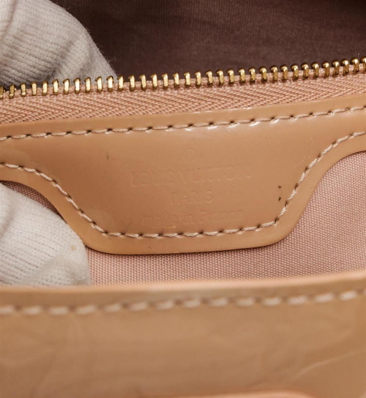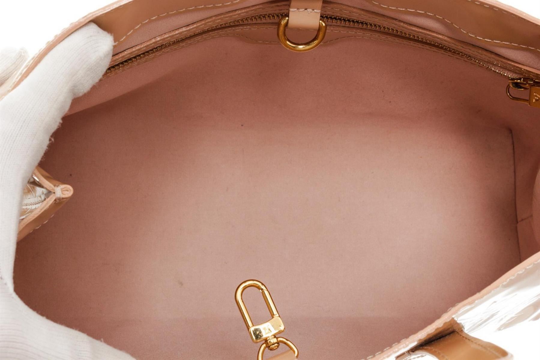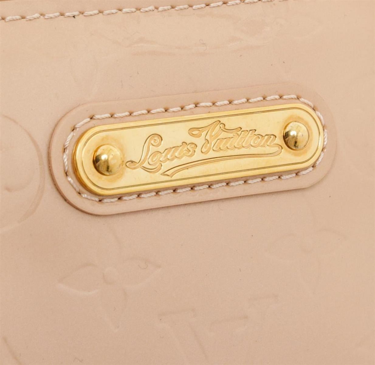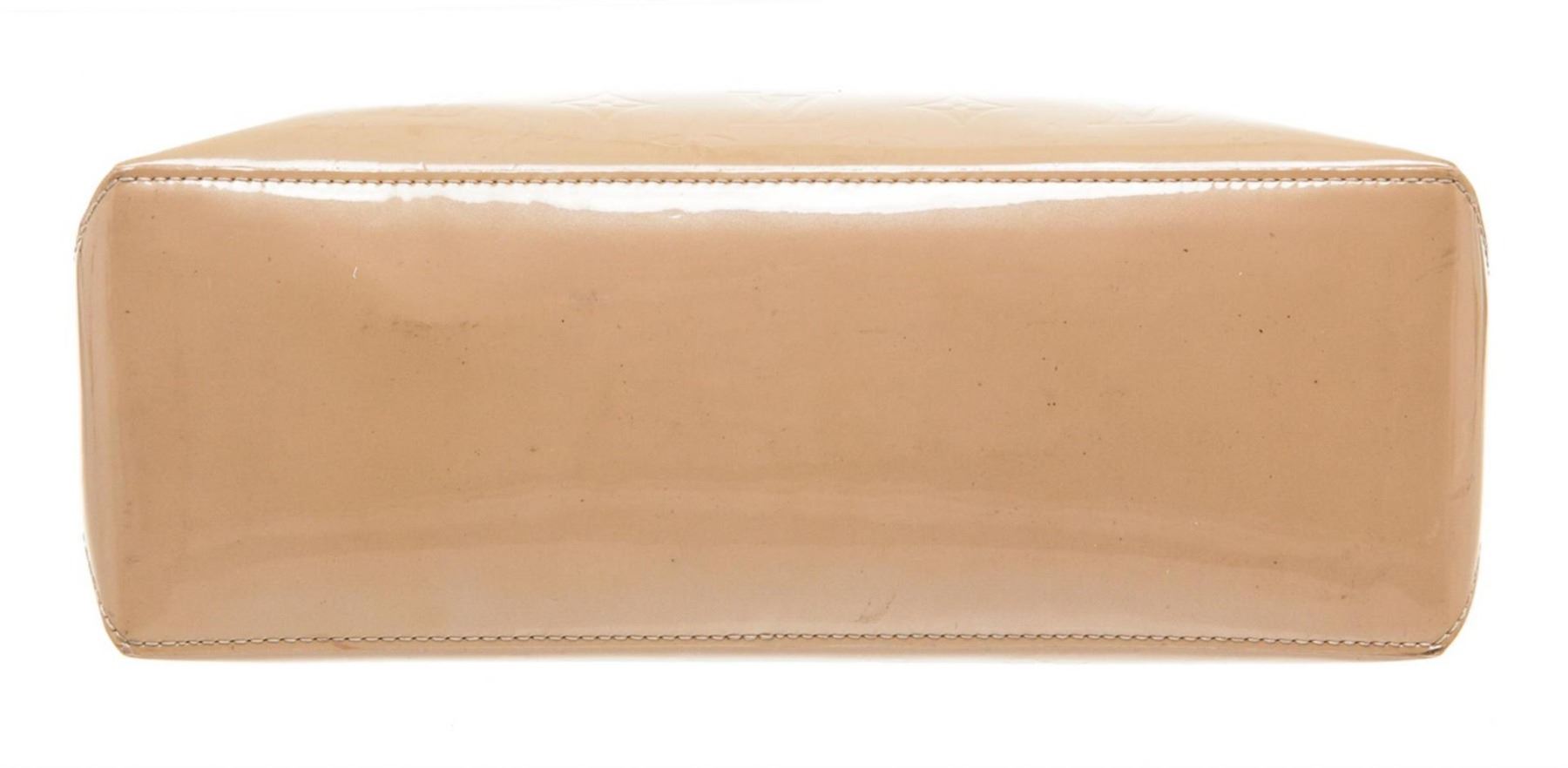 One Louis Vuitton Beige Monogram Vernis Leather Wilshire PM Bag. Beige Monogram Vernis leather Louis Vuitton Wilshire PM with brass hardware, dual flat top handles, logo placard at front face, tonal canvas lining, single zip pocket at interior wall and clasp closure at top. MKX