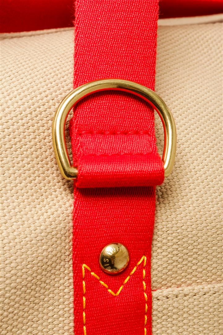 Louis Vuitton Beige Pink Canvas Sac Antigua Weekend Handbag. All available information is listed in the description and shown in the photos. Louis Vuitton Beige Pink Canvas Sac Antigua Weekend Handbag. Features gold hardware, red canvas straps, a red fabric interior, and a gold zipper closure.