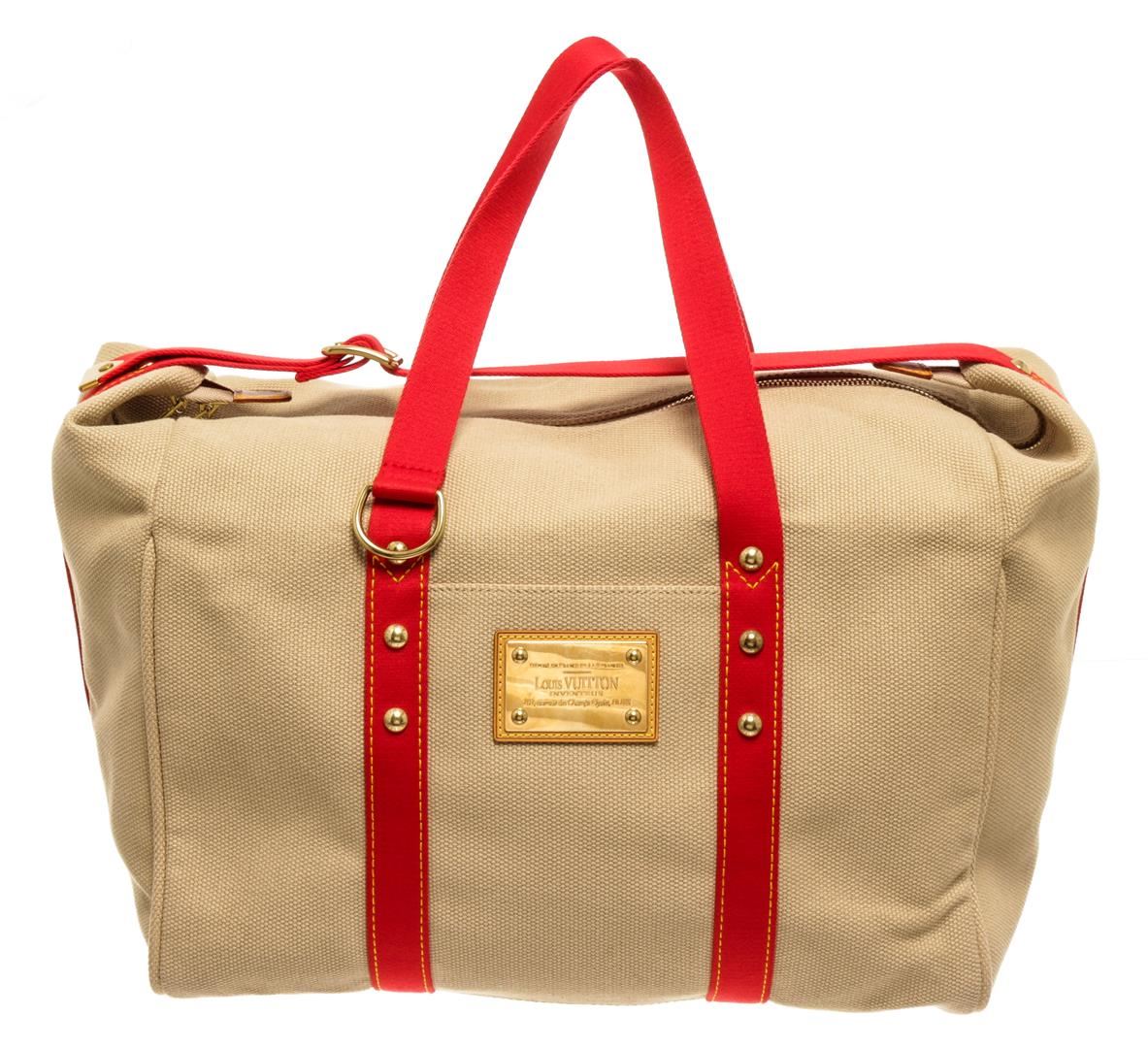 Louis Vuitton Beige Pink Canvas Sac Antigua Weekend Handbag. All available information is listed in the description and shown in the photos. Louis Vuitton Beige Pink Canvas Sac Antigua Weekend Handbag. Features gold hardware, red canvas straps, a red fabric interior, and a gold zipper closure.
