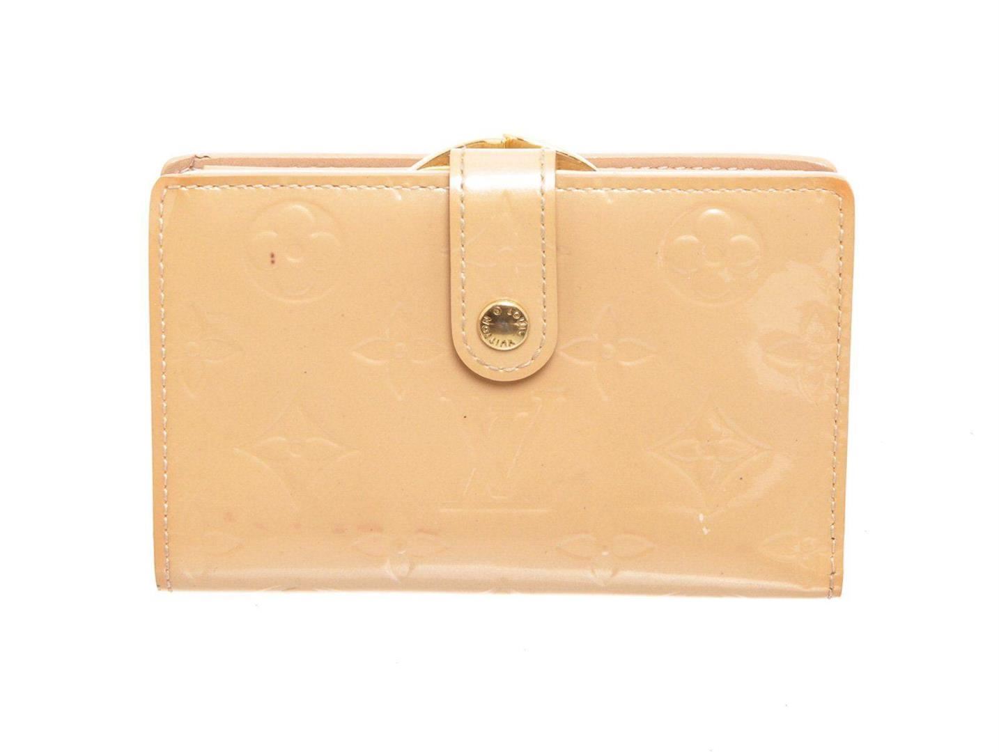 Louis Vuitton Beige Vernis Leather French Wallet with gold-tone hardware, trim tan vachetta leather, brown leather lining, interior three compartments pocket and zip snap closure. Measurements: Length: 1 in / 3 cm Width: 3.5 in / 9 cm 5.25 in / 13 cmCONDITION: Pre-Owned Good overall, please see photographs for detail.