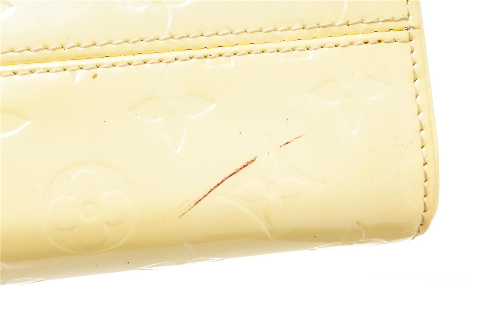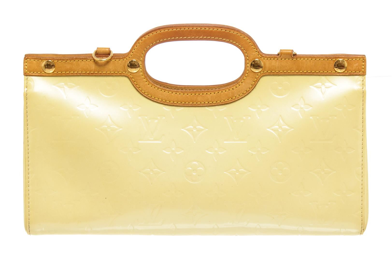 Louis Vuitton Beige Vernis Leather Roxbury Drive Handbag. All available information is listed in the description and shown in the photos. Louis Vuitton Beige Vernis Leather Roxbury Drive Handbag with gold tone hardware, tan leather trim, gray fabric lining, interior open pocket, and snap closure.