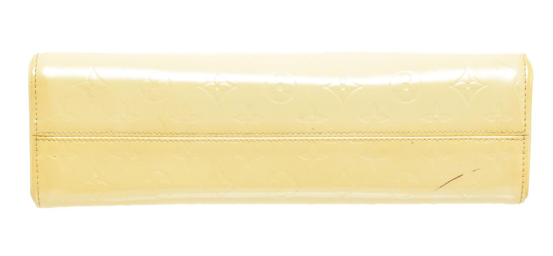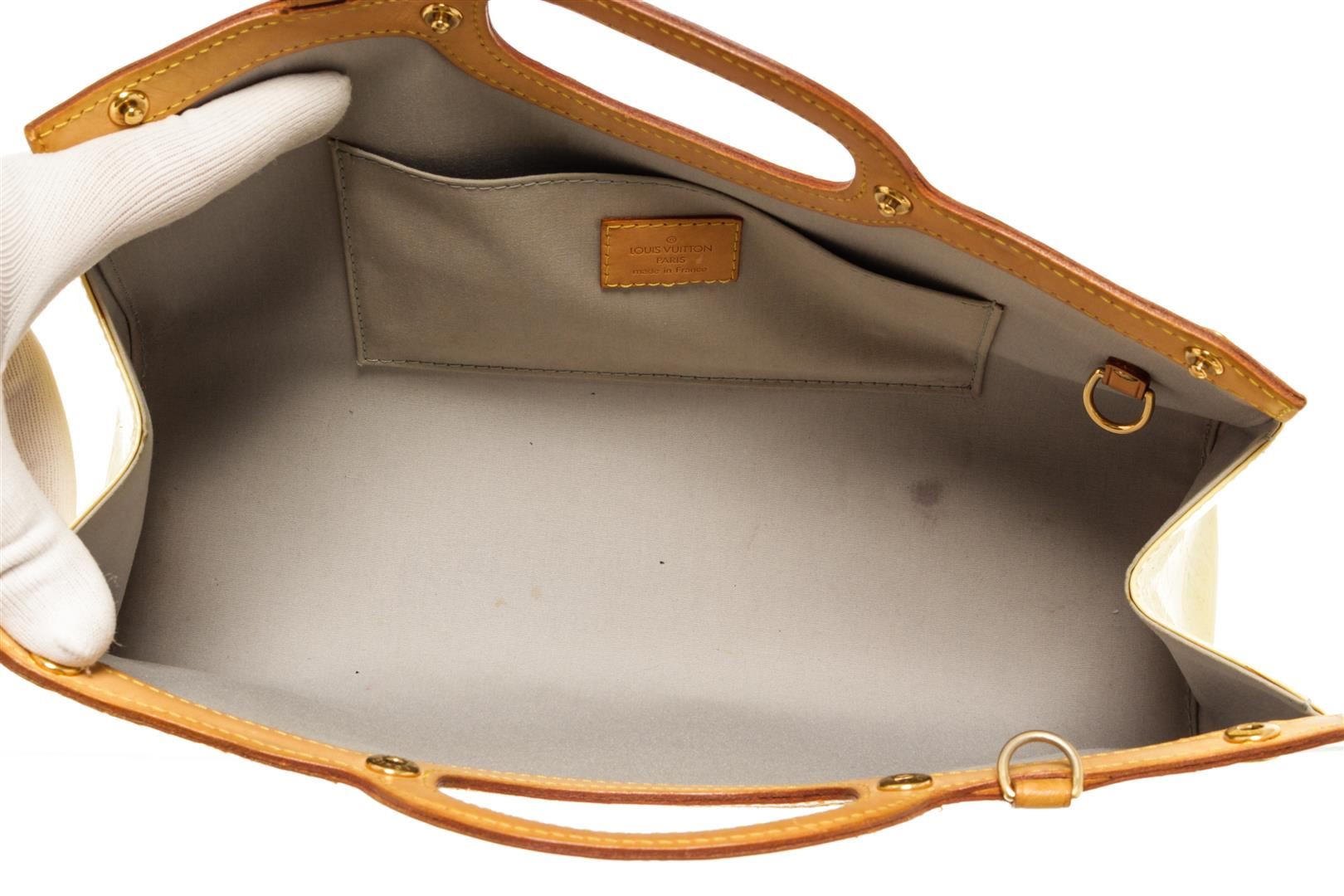 Louis Vuitton Beige Vernis Leather Roxbury Drive Handbag. All available information is listed in the description and shown in the photos. Louis Vuitton Beige Vernis Leather Roxbury Drive Handbag with gold tone hardware, tan leather trim, gray fabric lining, interior open pocket, and snap closure.