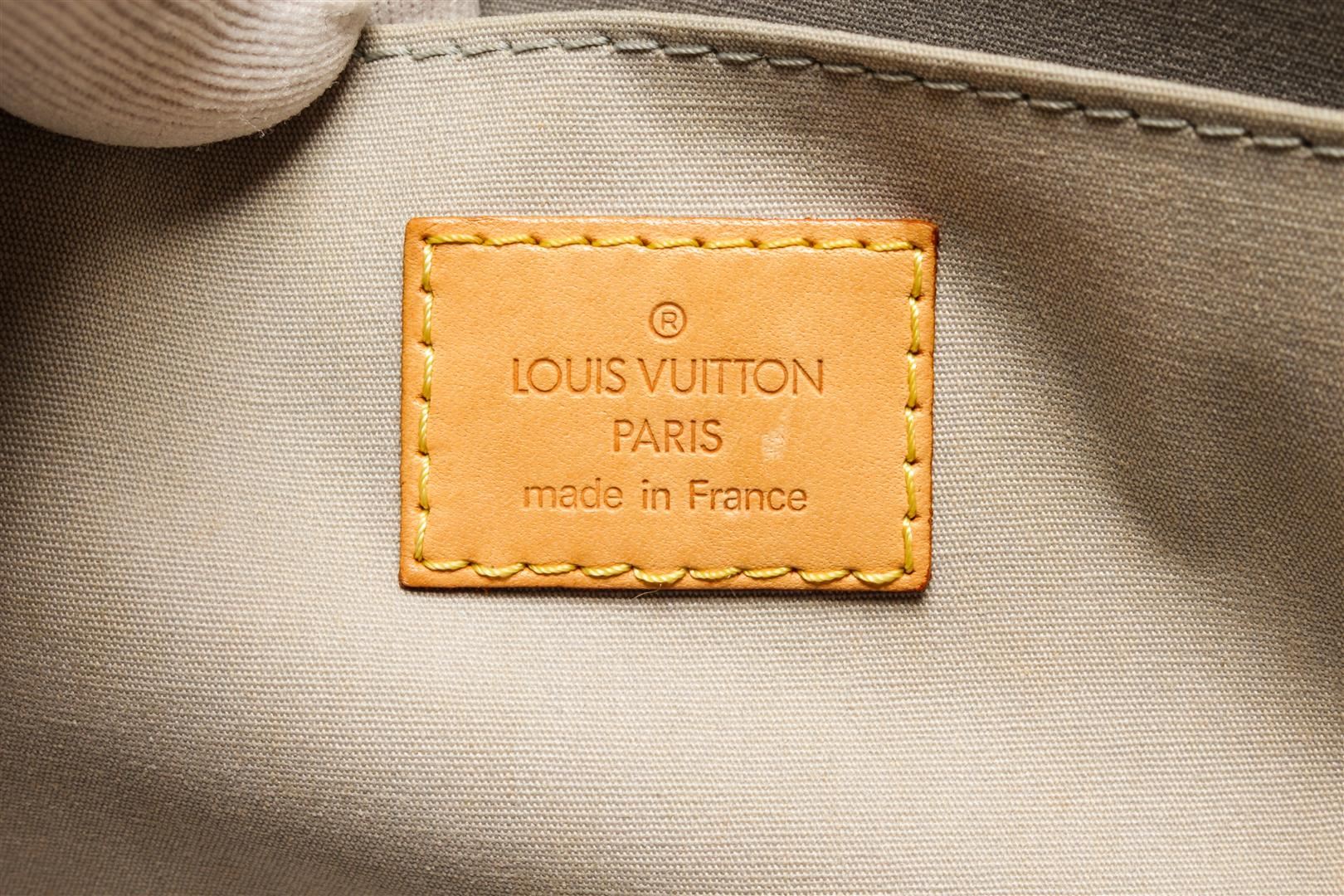 Louis Vuitton Beige Vernis Leather Roxbury Drive Handbag. All available information is listed in the description and shown in the photos. Louis Vuitton Beige Vernis Leather Roxbury Drive Handbag with gold tone hardware, tan leather trim, gray fabric lining, interior open pocket, and snap closure.
