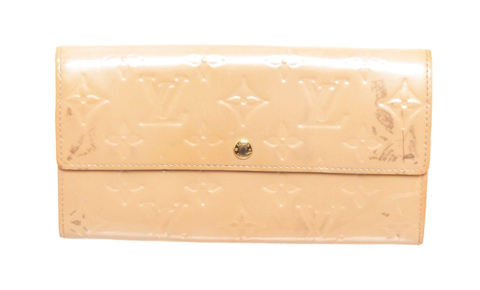 Louis Vuitton Beige Vernis Leather Sarah Wallet with gold-tone hardware, trim tan vachetta leather, interior three compartments pocket and zip snap closure. Measurements: Length: 0.75 in / 2 cm Width: 7.25 in / 18 cm 4 in / 10 cmCONDITION: Pre-Owned Good overall, please see photographs for detail.