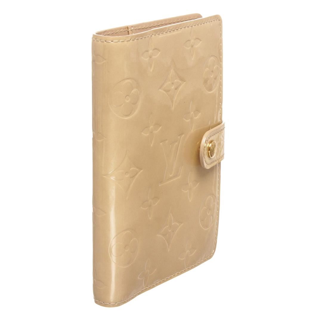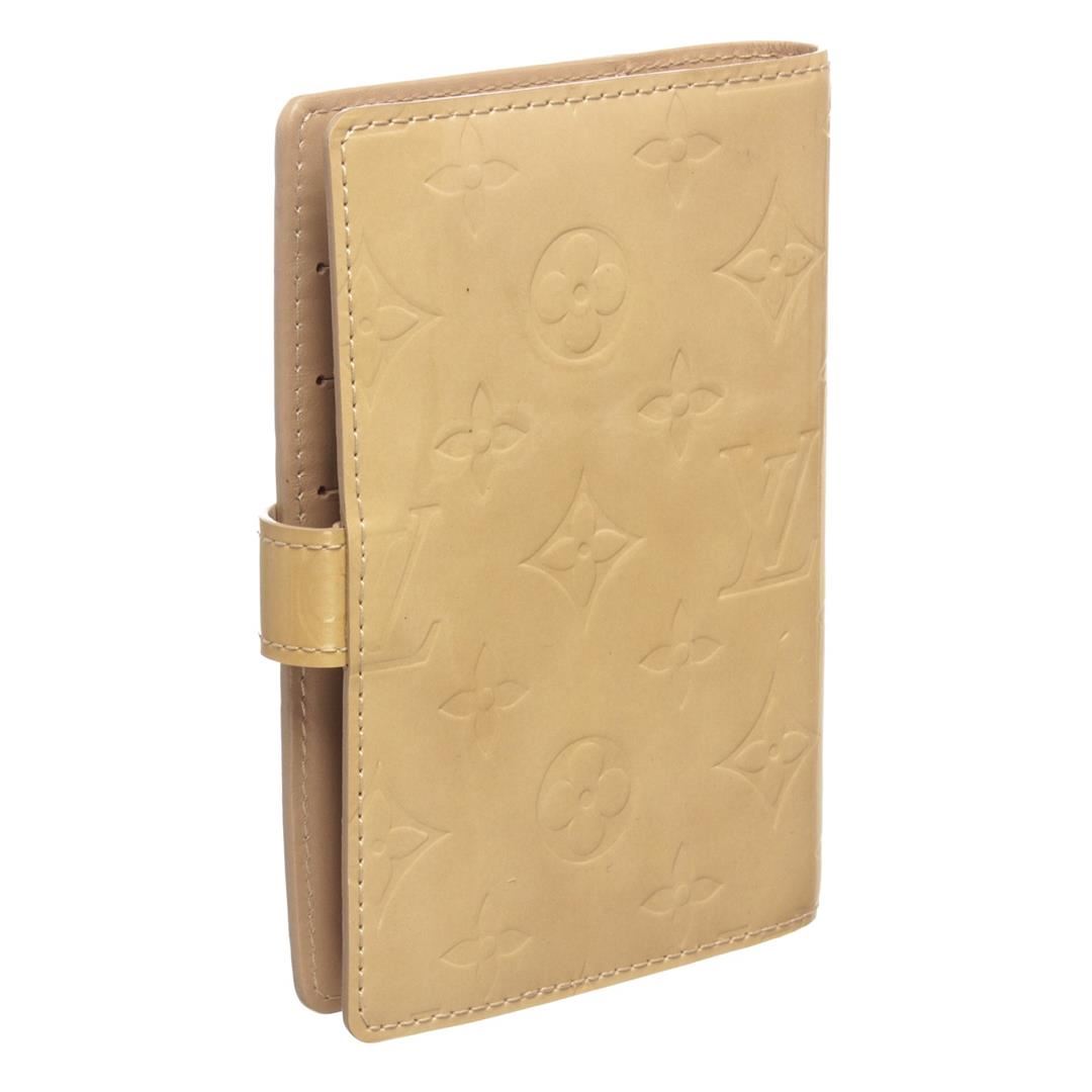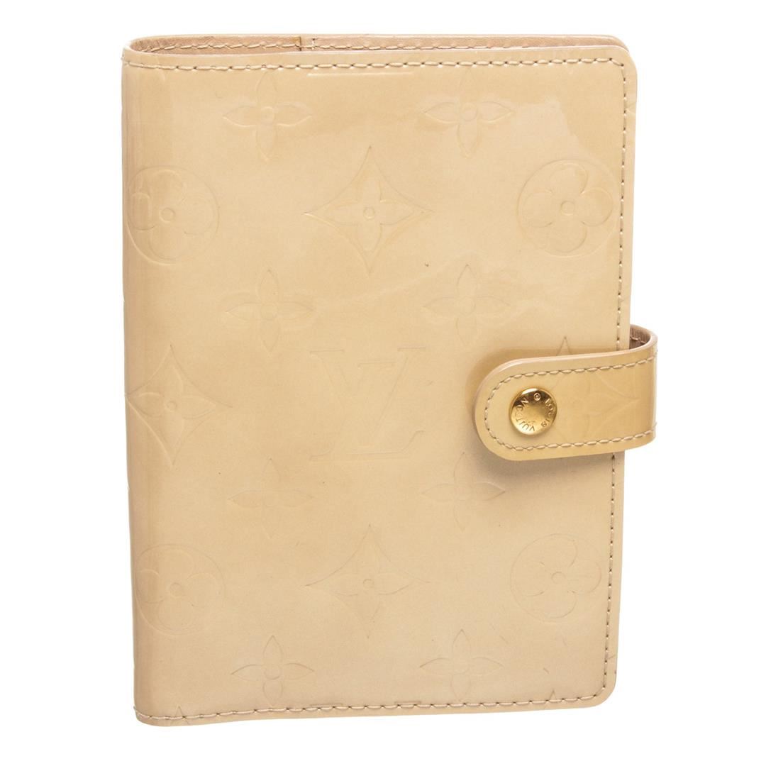 Vernis leather Louis Vuitton Small Agenda Cover with gold-tone hardware, tonal leather lining, three card slots at interior wall and snap closure at front. Inserts includes ruler, blank lined paper, and bank address book.