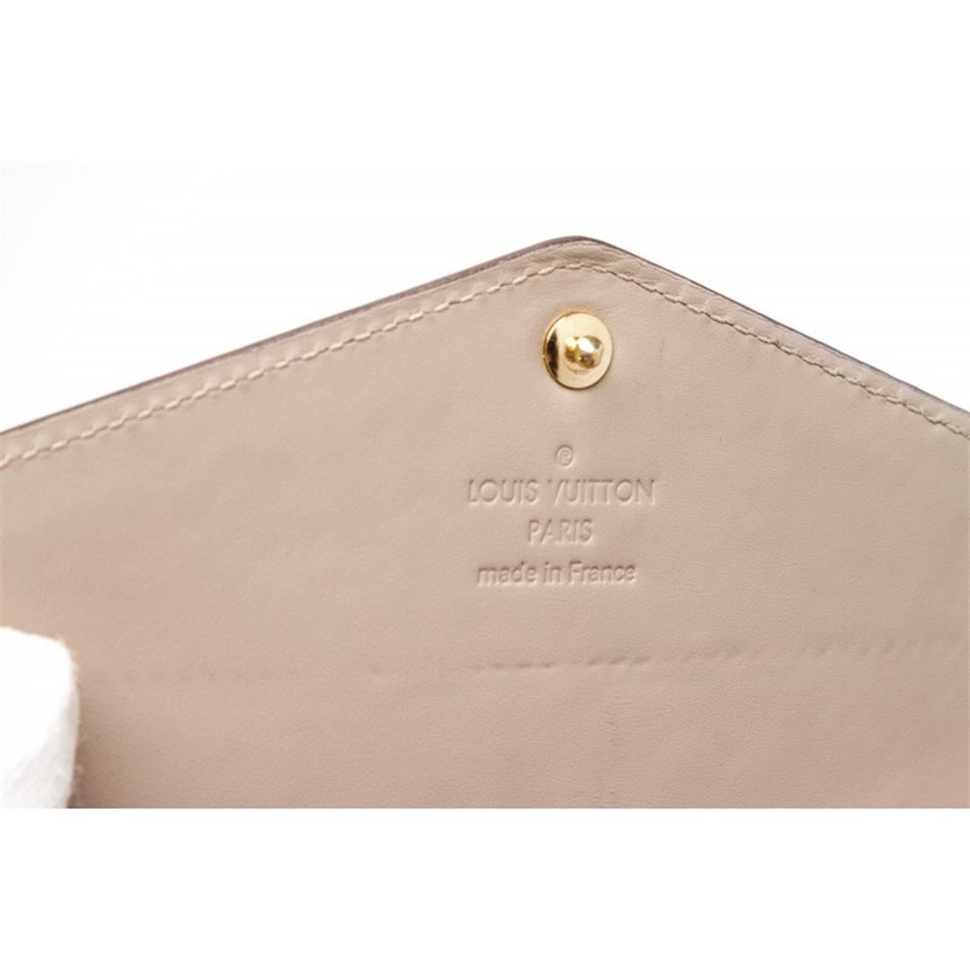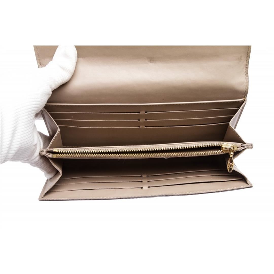 Monogram Vernis leather Louis Vuitton Sarah wallet with brass hardware, dual slip pockets at flap underside, tonal leather lining, dual interior pockets; one with zip closure, six card slots at interior wall and snap closure at front flap. Item is pre-owned.