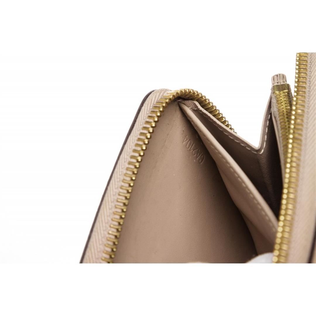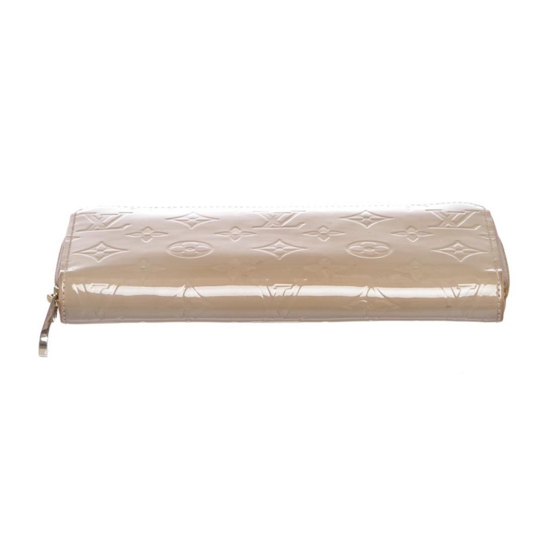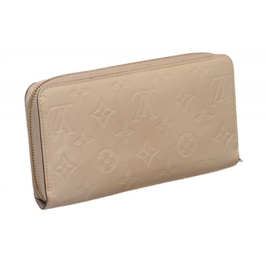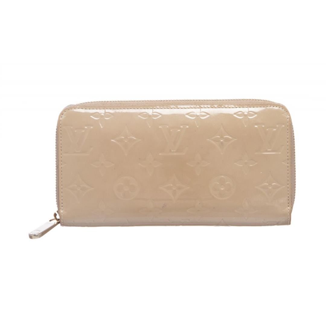 Monogram Vernis leather Louis Vuitton Zippy wallet with brass hardware, tonal leather lining, four interior compartments; one with zip closure, three bill compartments, eight card slots and zip-around closure. Item is pre-owned.