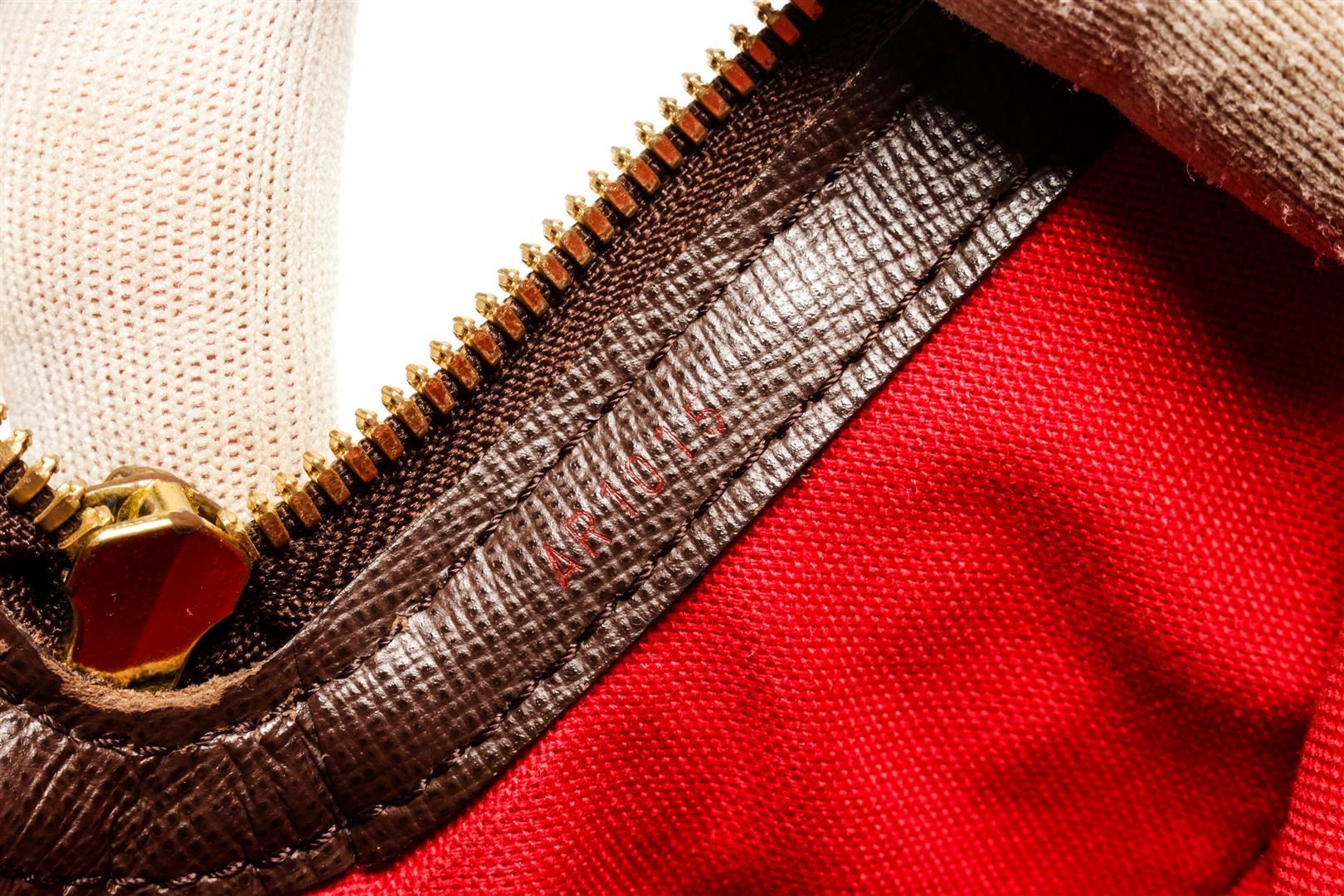 One Louis Vuitton Belem Damier Ebene MM. Item is sold AS-IS. All available information is listed in the description and shown in the photo. Louis Vuitton Belem Damier Ebene MM with brown top handle, red fabric lining, one slip interior pocket, and gold-tone hardware. 7679