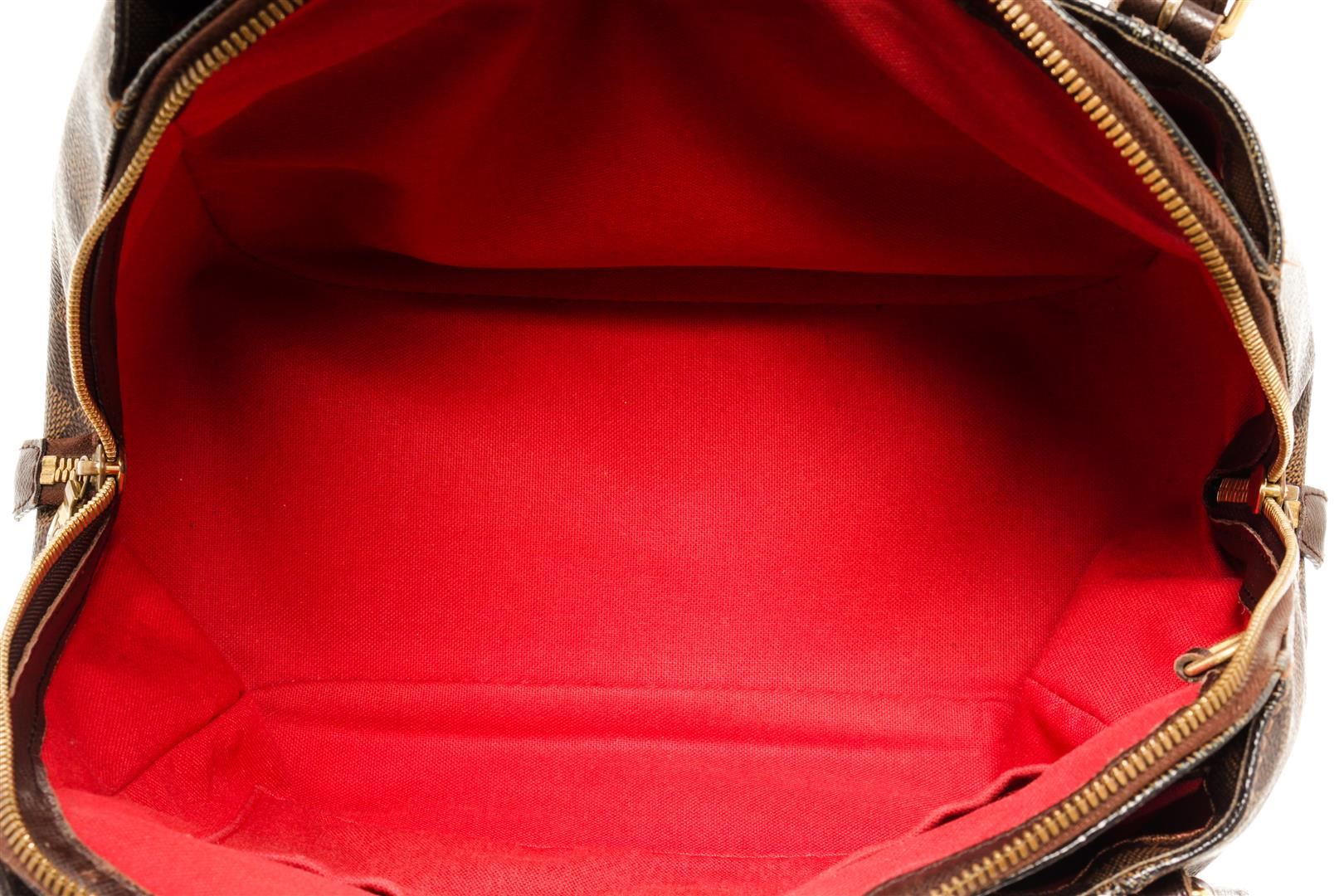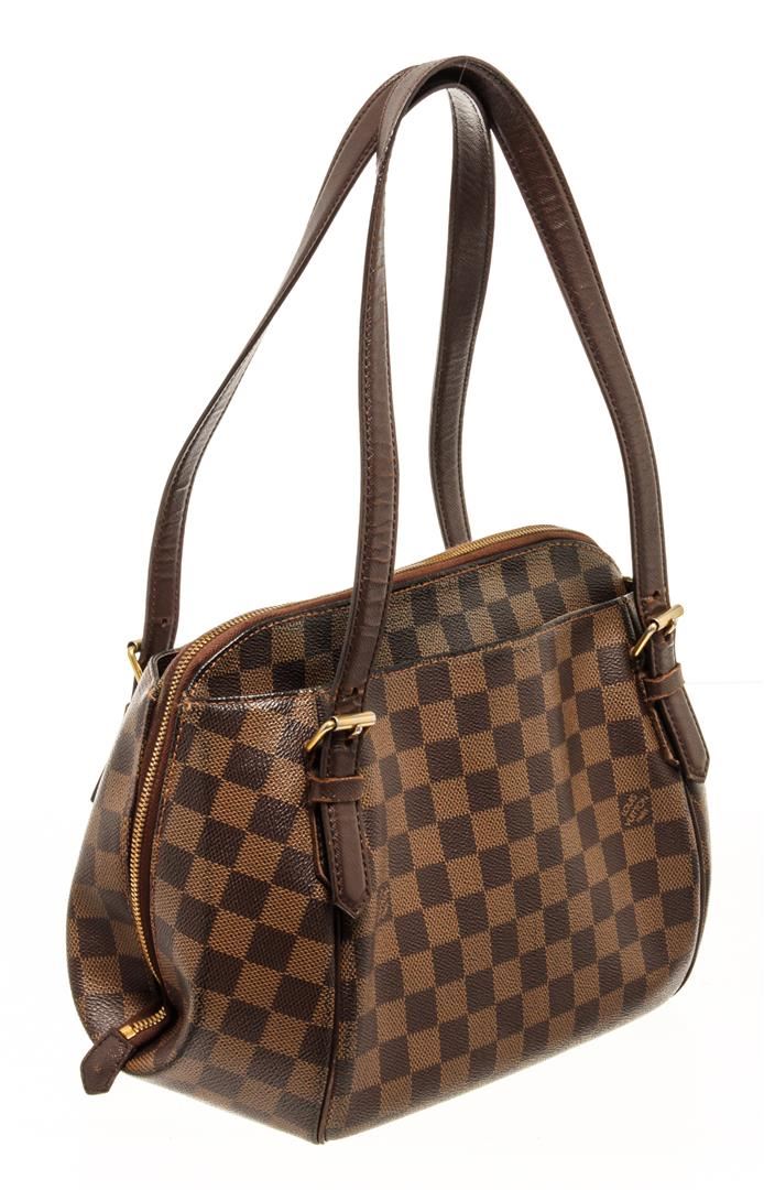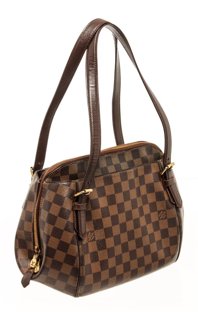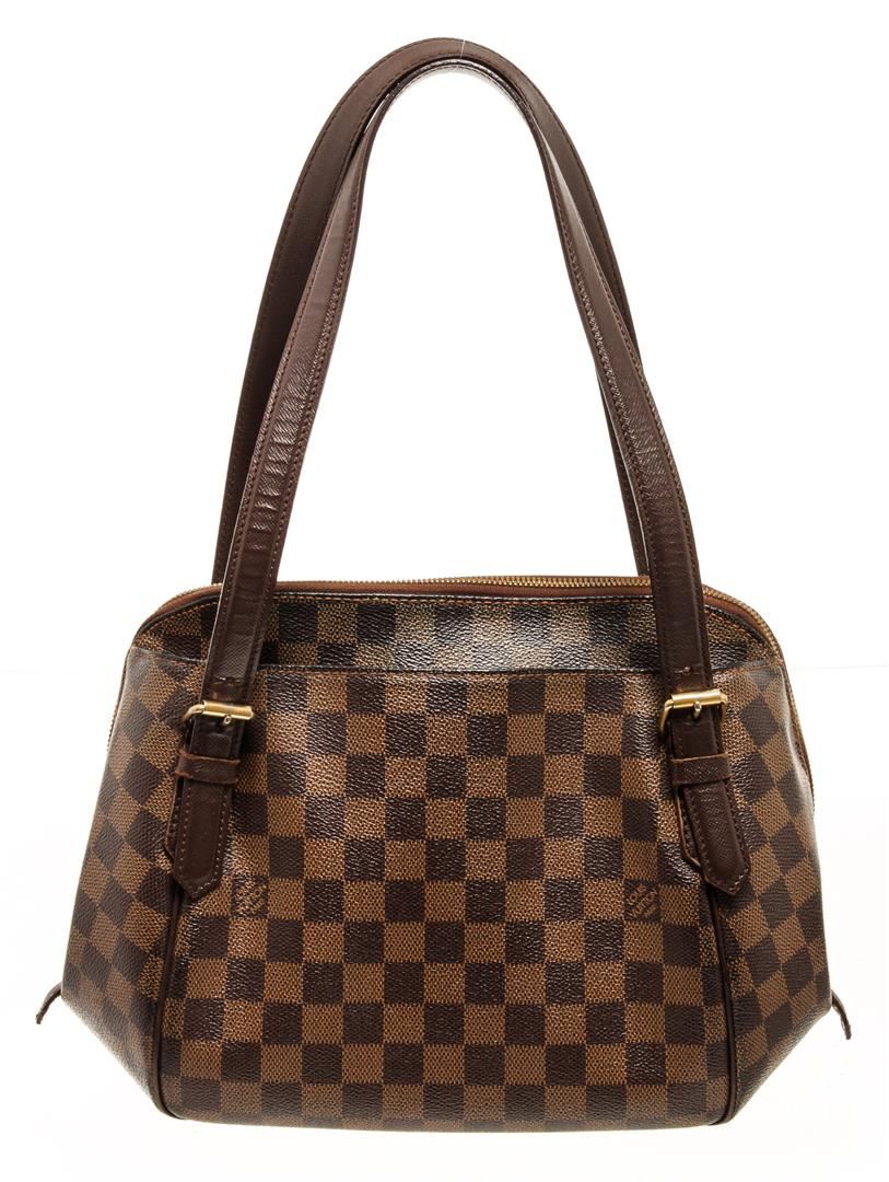One Louis Vuitton Belem Damier Ebene MM. Item is sold AS-IS. All available information is listed in the description and shown in the photo. Louis Vuitton Belem Damier Ebene MM with brown top handle, red fabric lining, one slip interior pocket, and gold-tone hardware. 7679