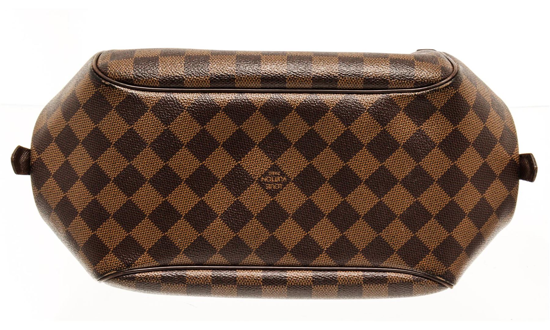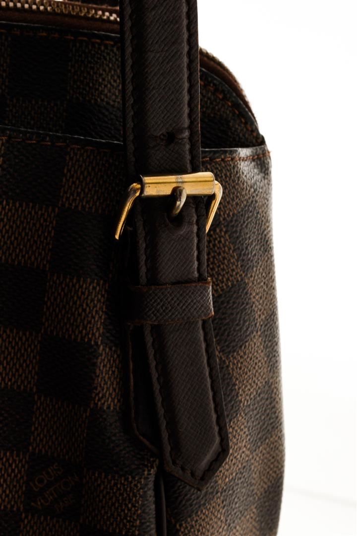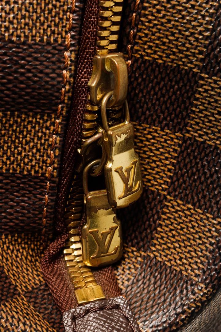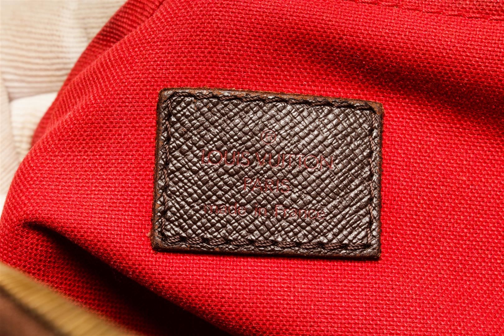 One Louis Vuitton Belem Damier Ebene MM. Item is sold AS-IS. All available information is listed in the description and shown in the photo. Louis Vuitton Belem Damier Ebene MM with brown top handle, red fabric lining, one slip interior pocket, and gold-tone hardware. 7679