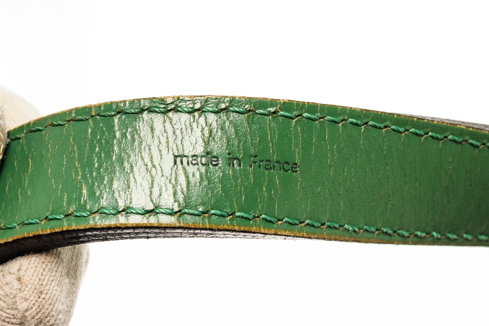 One Louis Vuitton Bi-Colored Epi Leather Noe Shoulder Bag. Item is sold AS-IS. All available information is listed in the description and shown in the photo. Louis Vuitton bi-colored epi leather Noe shoulder bag with blue epi leather exterior with green epi leather adjustable shoulder strap and trims, blue suede lining, gold-tone hardware, drawstring closure, and one main compartment.