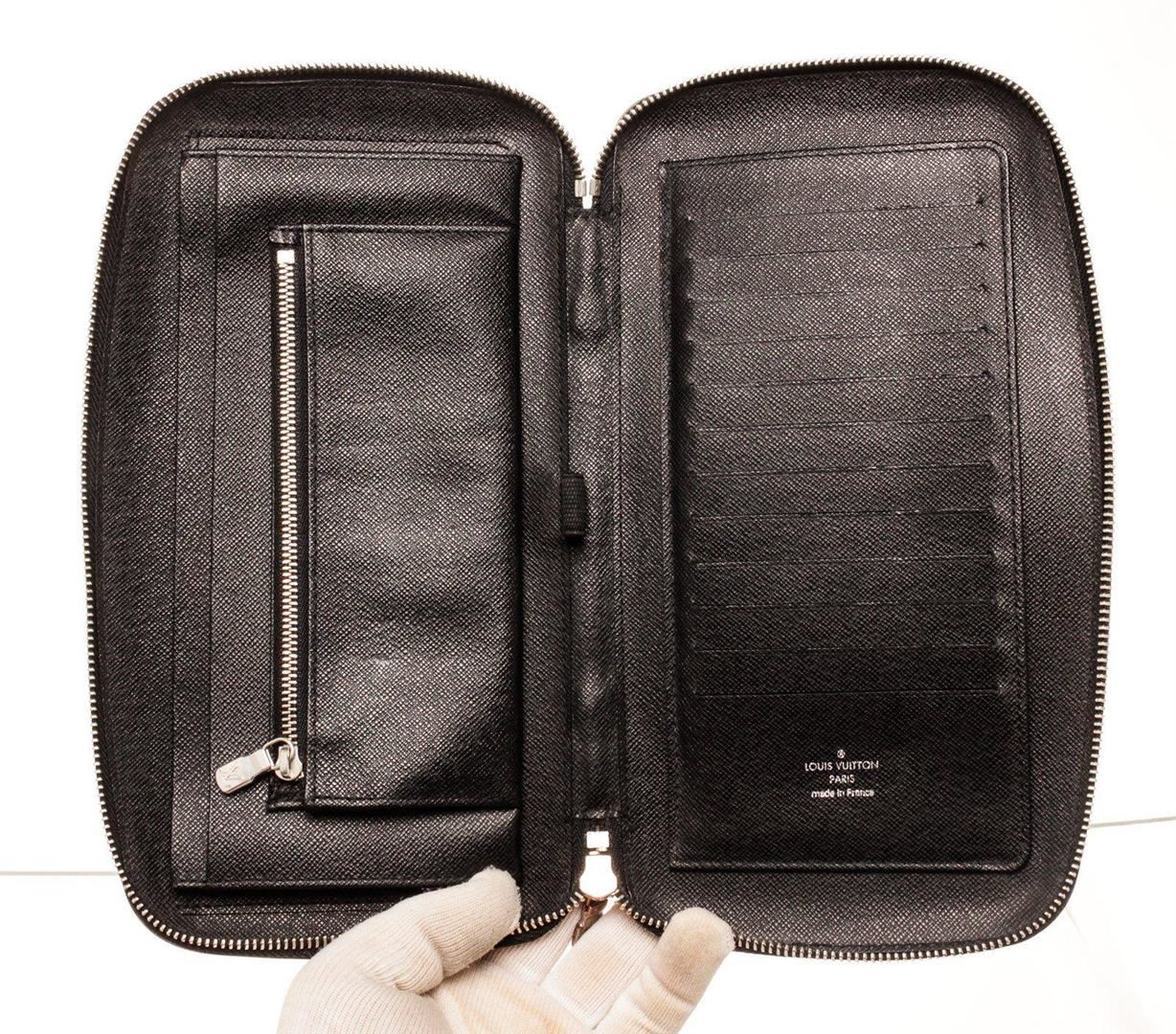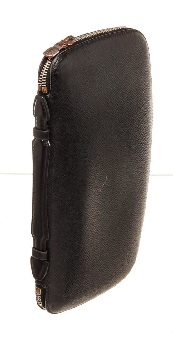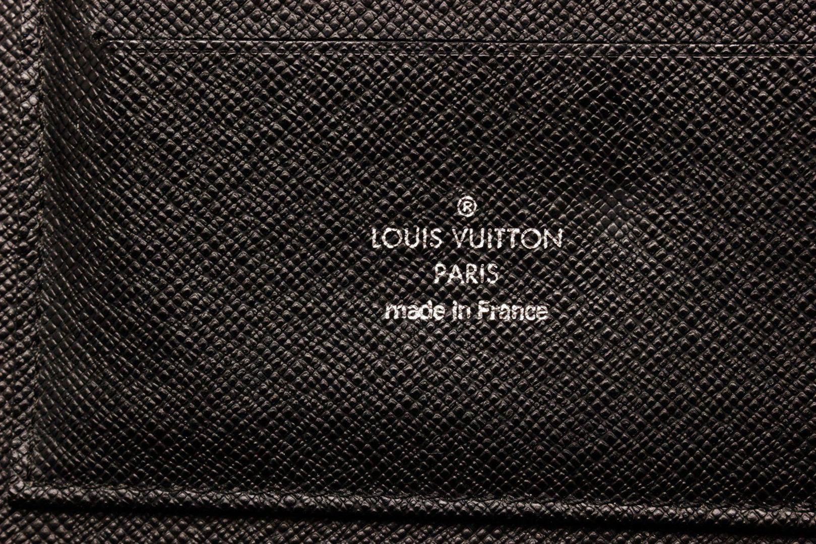 Louis Vuitton Black Atoll Organizer Wallet with leather, gold-tone hardware, trim tan vachetta, interior cardholder pocket and zipper closure.