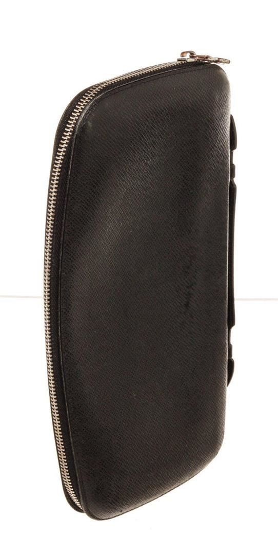 Louis Vuitton Black Atoll Organizer Wallet with leather, gold-tone hardware, trim tan vachetta, interior cardholder pocket and zipper closure.