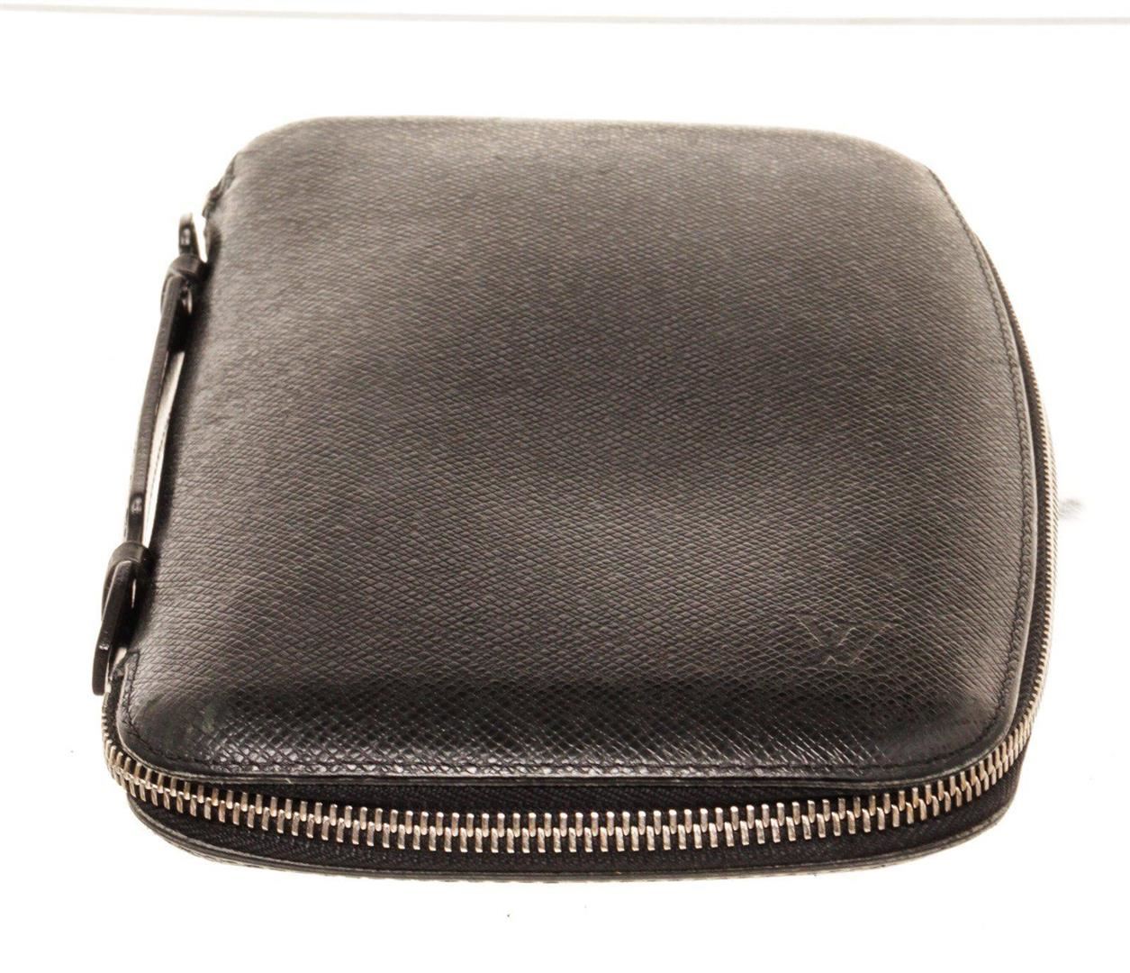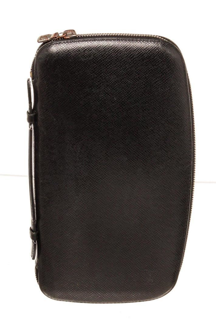 Louis Vuitton Black Atoll Organizer Wallet with leather, gold-tone hardware, trim tan vachetta, interior cardholder pocket and zipper closure.
