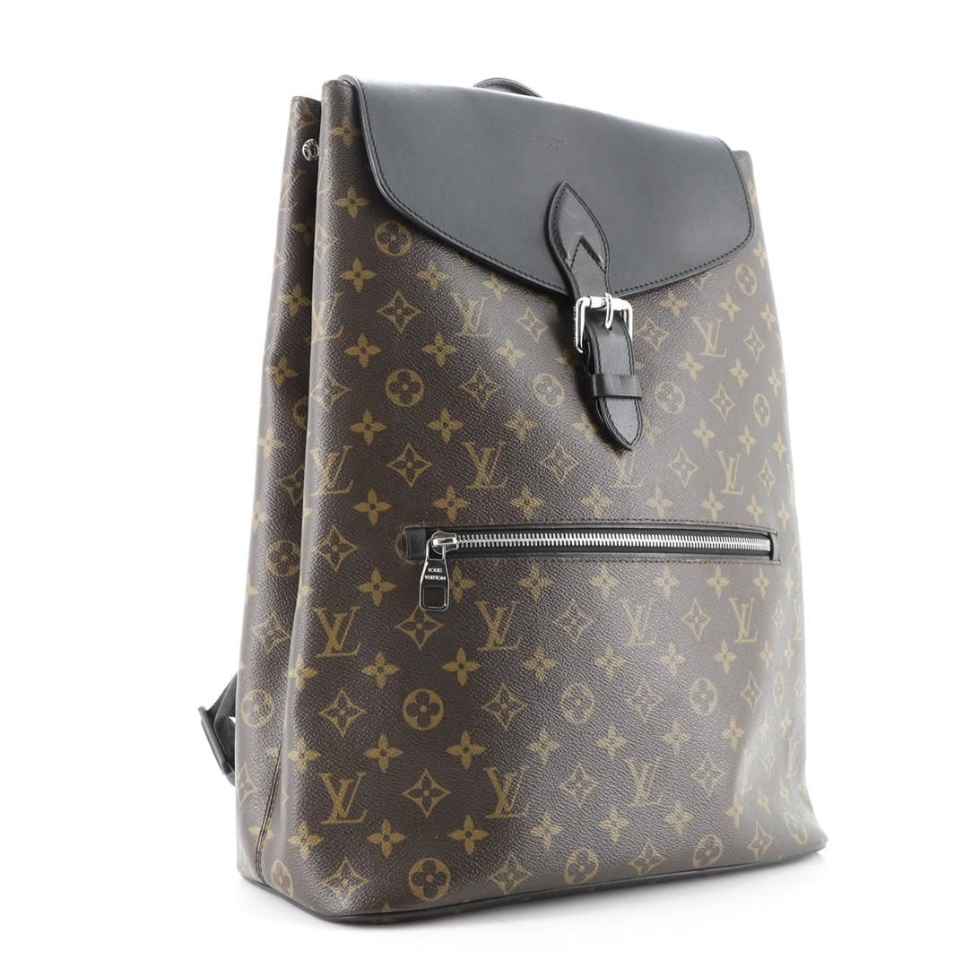 Brown and tan monogram coated canvas Louis Vuitton Macassar Palk backpack with silver-tone hardware, single leather top handle, dual flat shoulder straps, zip pocket at front, black leather trim, plum canvas lining, single laptop compartment, slit pocket