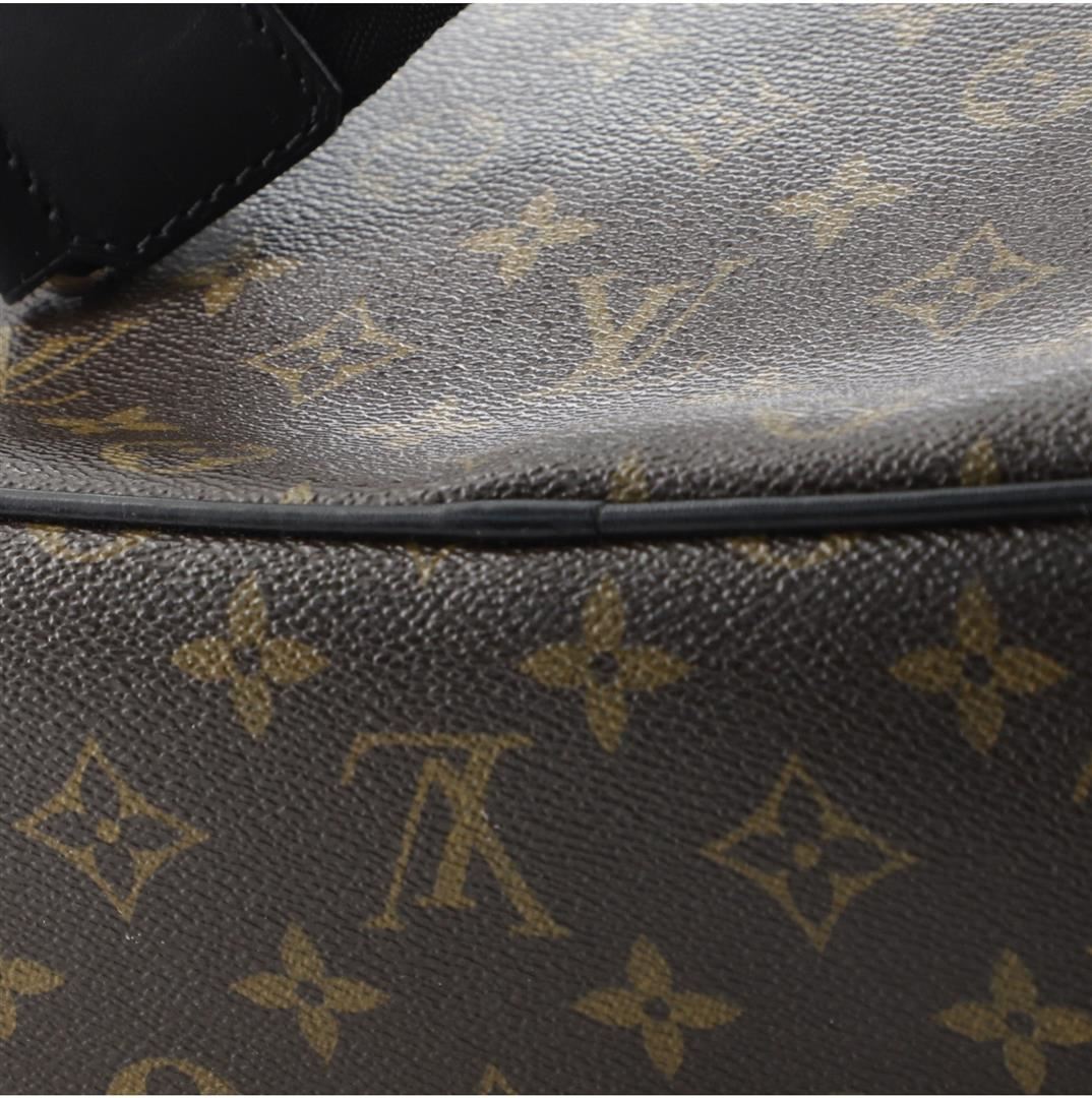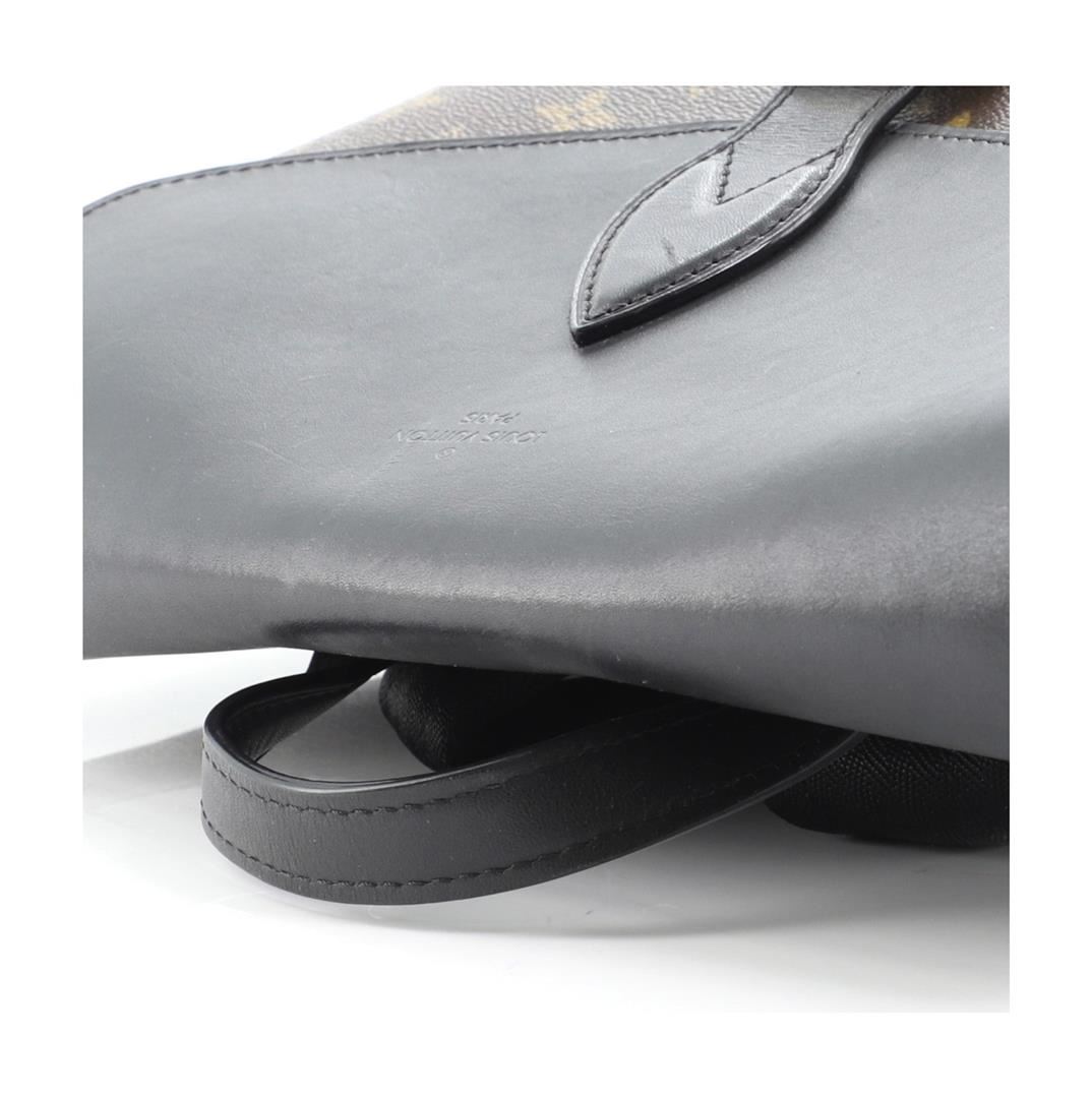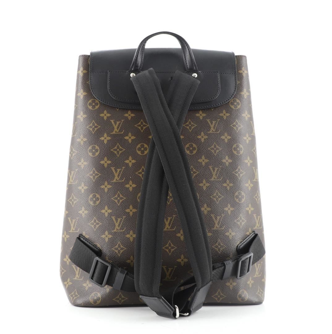 Brown and tan monogram coated canvas Louis Vuitton Macassar Palk backpack with silver-tone hardware, single leather top handle, dual flat shoulder straps, zip pocket at front, black leather trim, plum canvas lining, single laptop compartment, slit pocket