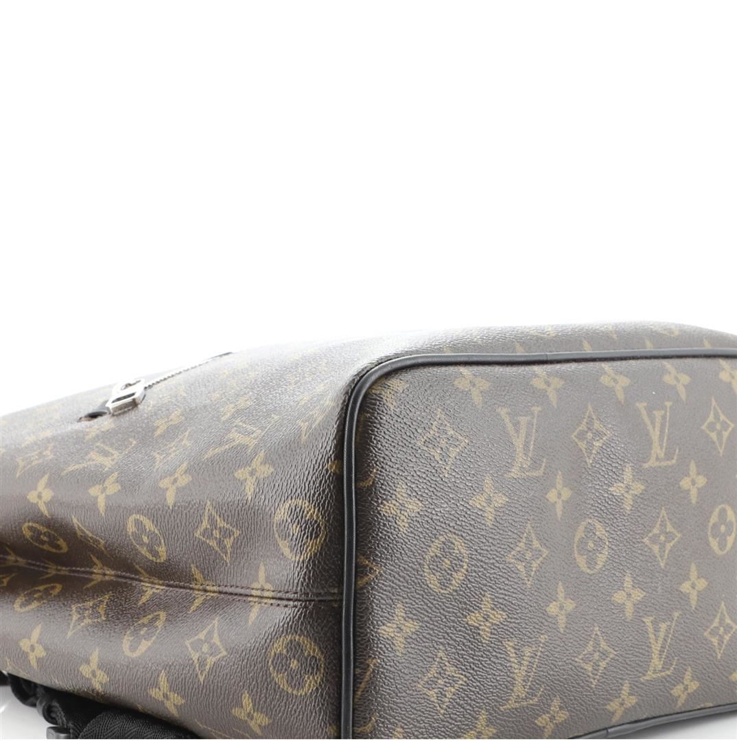Brown and tan monogram coated canvas Louis Vuitton Macassar Palk backpack with silver-tone hardware, single leather top handle, dual flat shoulder straps, zip pocket at front, black leather trim, plum canvas lining, single laptop compartment, slit pocket