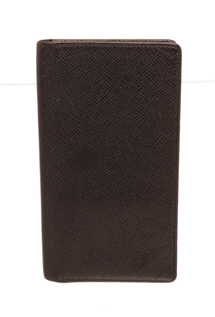 Louis Vuitton Black Canvas Leather Long Card Wallet with tonal stitching, cinnamon leather lining, three bill slots, six card slots and bifold closure.