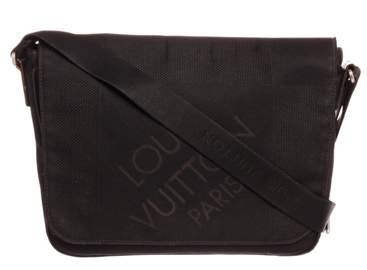 Black damier Louis Vuitton Geant Petit Messenger bag with silver-tone hardware, single flat shoulder strap, black leather trim, single exterior pocket at back, brown nylon lining, dual pockets at interior wall, dual pen holsters and dual snap closures at front flap.