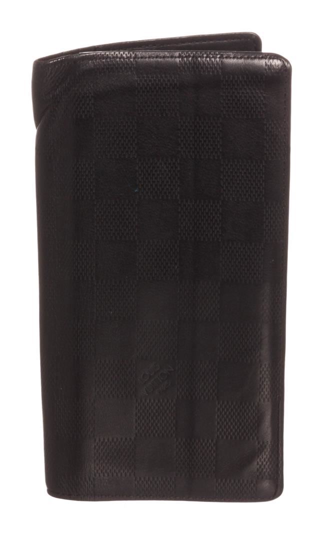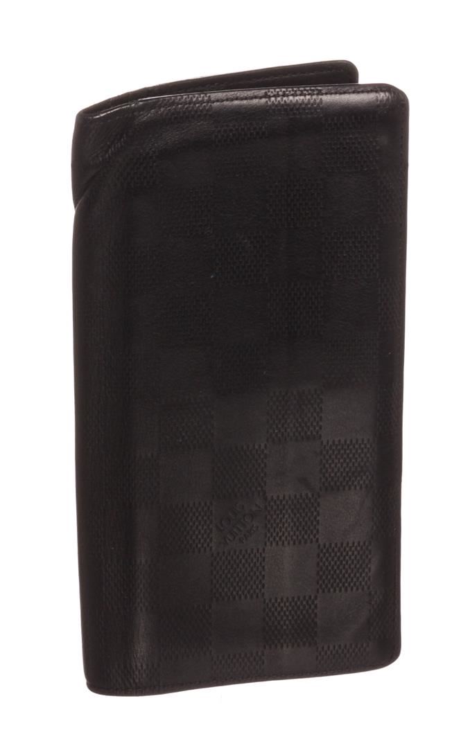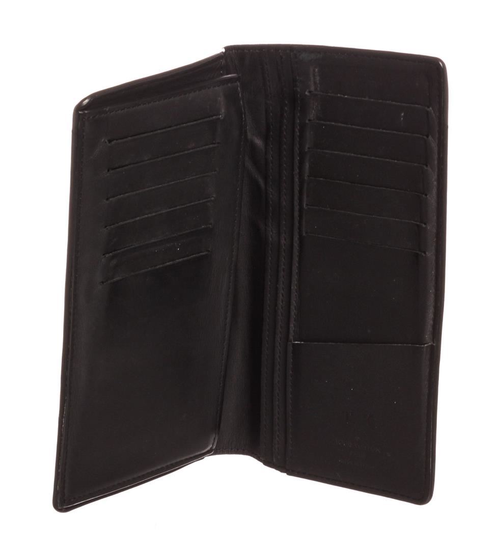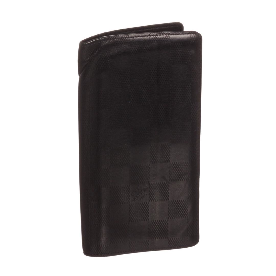 Black Damier Infini leather Louis Vuitton Brazza wallet with silver-tone hardware, black textured leather lining, 12 card slots, five bill compartments, zip coin compartment and flap closure.