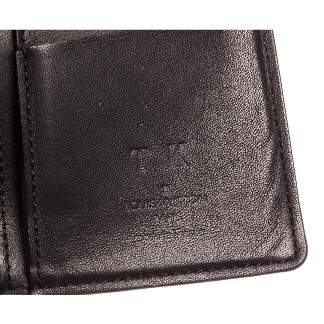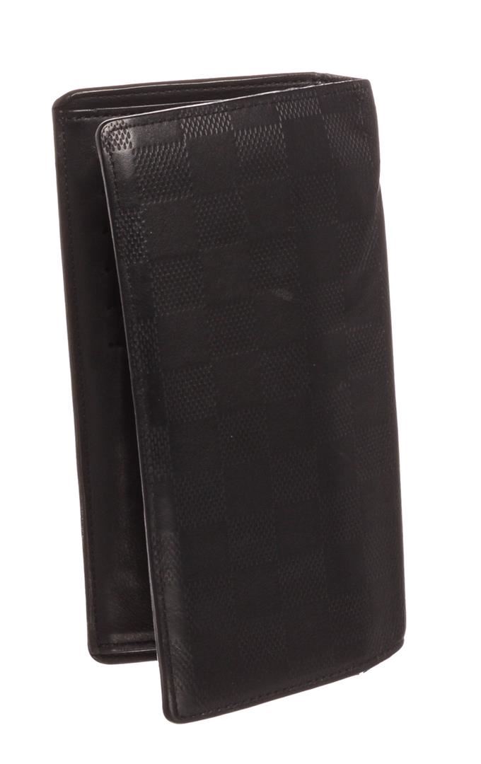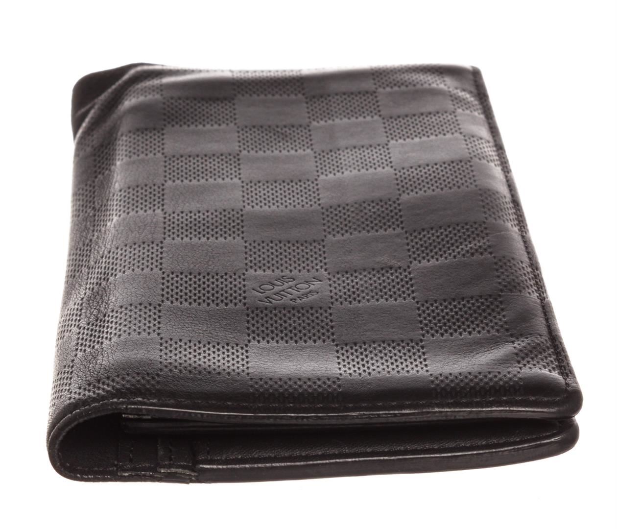 Black Damier Infini leather Louis Vuitton Brazza wallet with silver-tone hardware, black textured leather lining, 12 card slots, five bill compartments, zip coin compartment and flap closure.