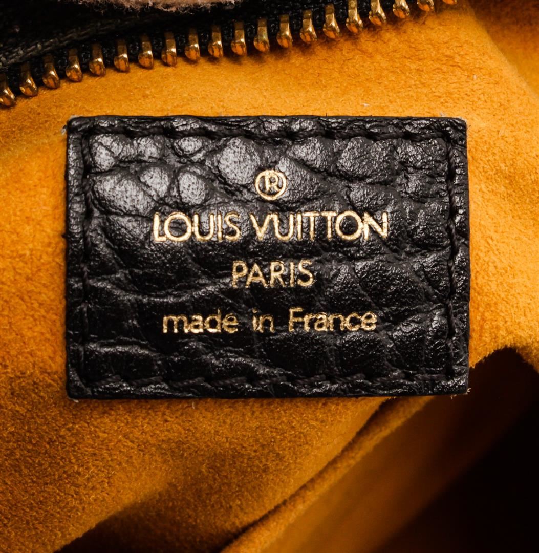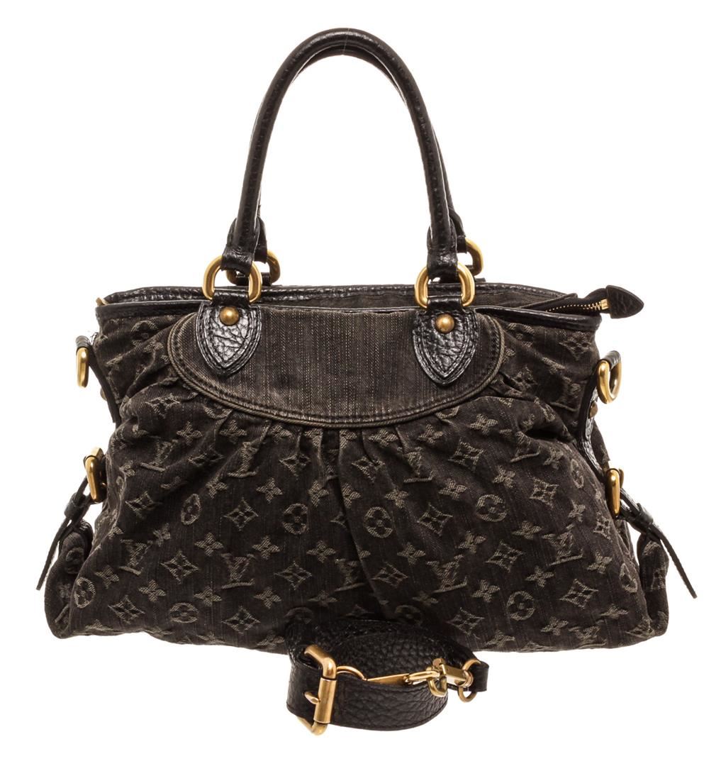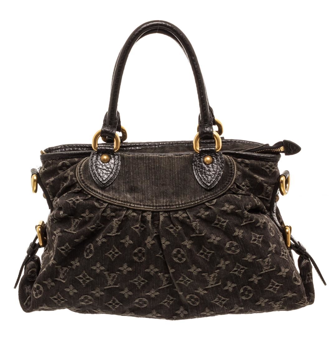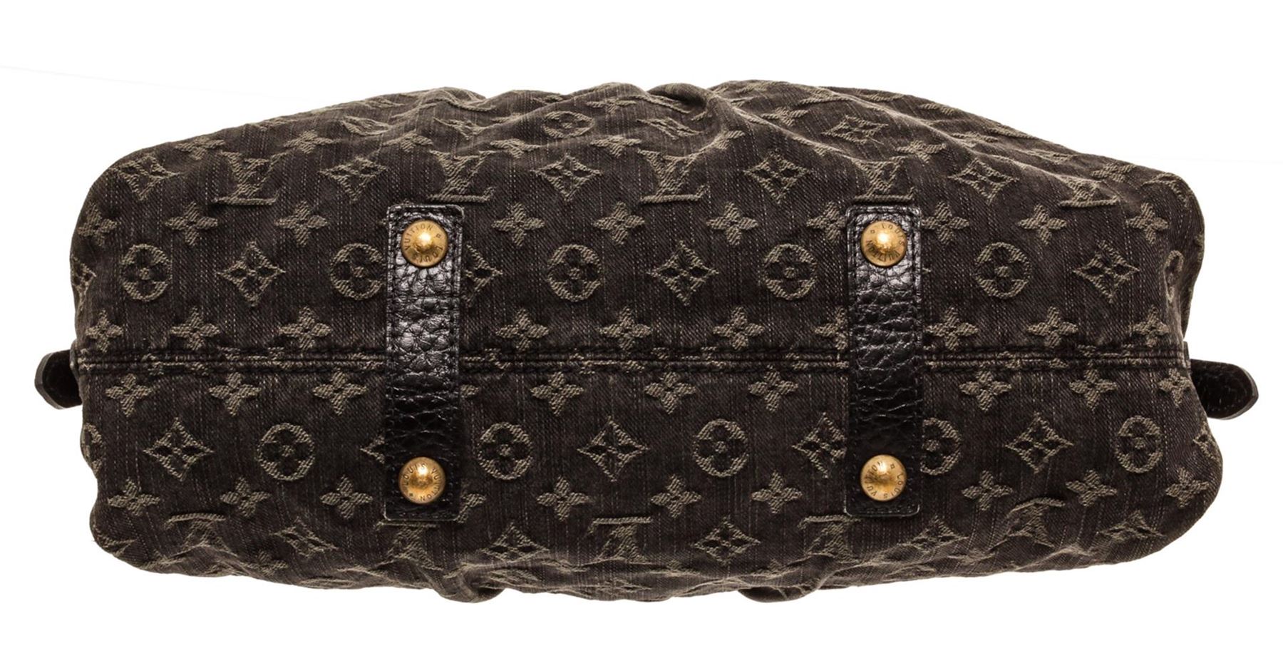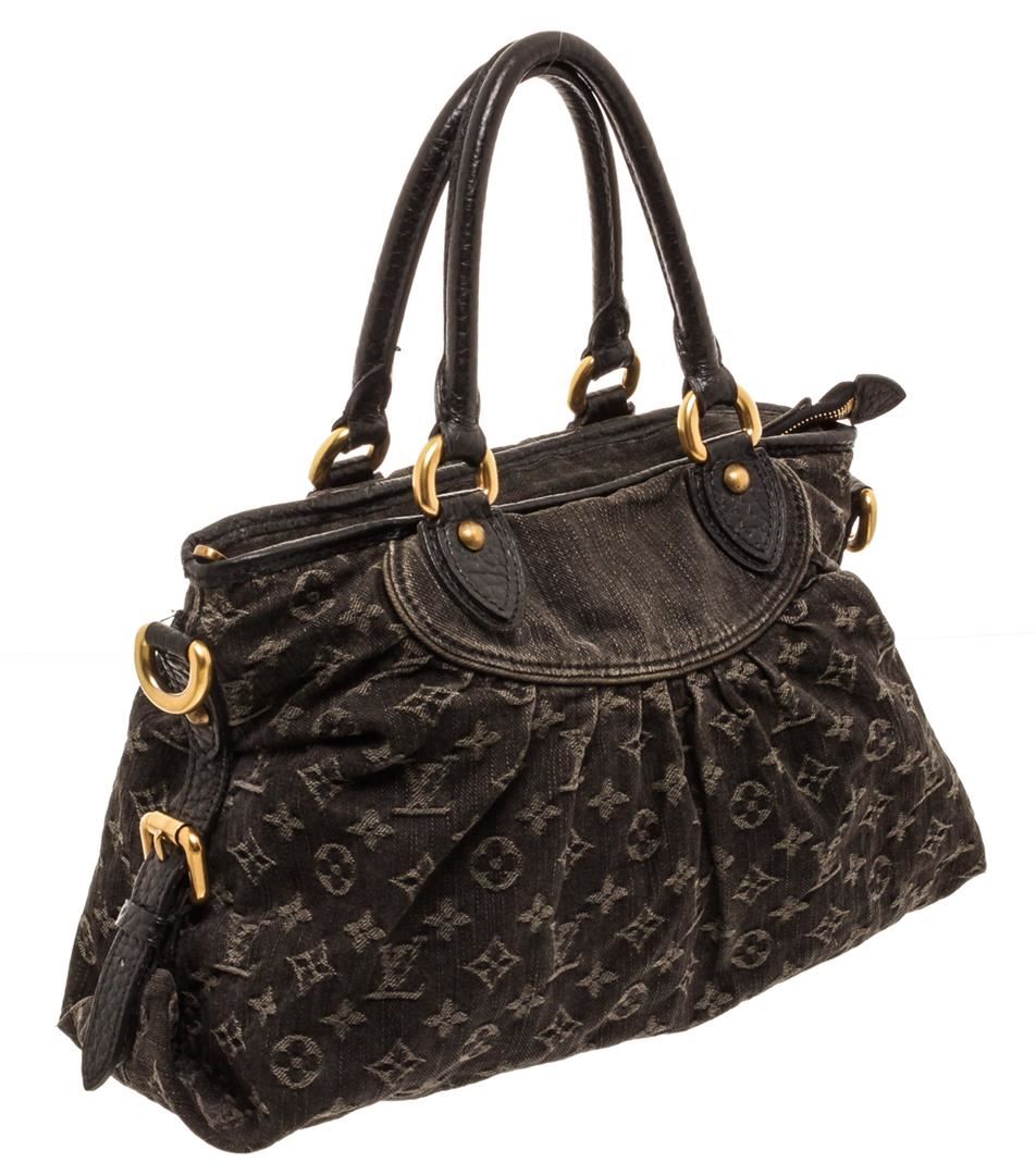 One Louis Vuitton Black Denim Monogram Neo Cabby MM Bag. Black monogram denim Louis Vuitton Denim Neo Cabby MM with brass hardware, dual rolled top handles, detachable flat shoulder strap with buckle adjustment, tonal leather trim, marigold Alcantara lining, dual slip pockets at interior wall and zip closure at top.          MKX