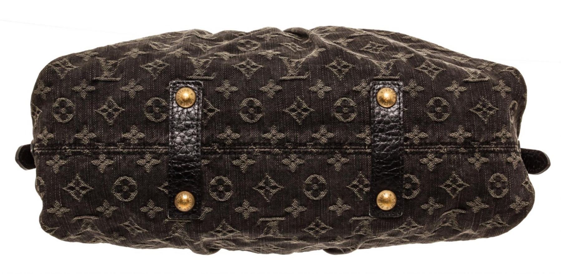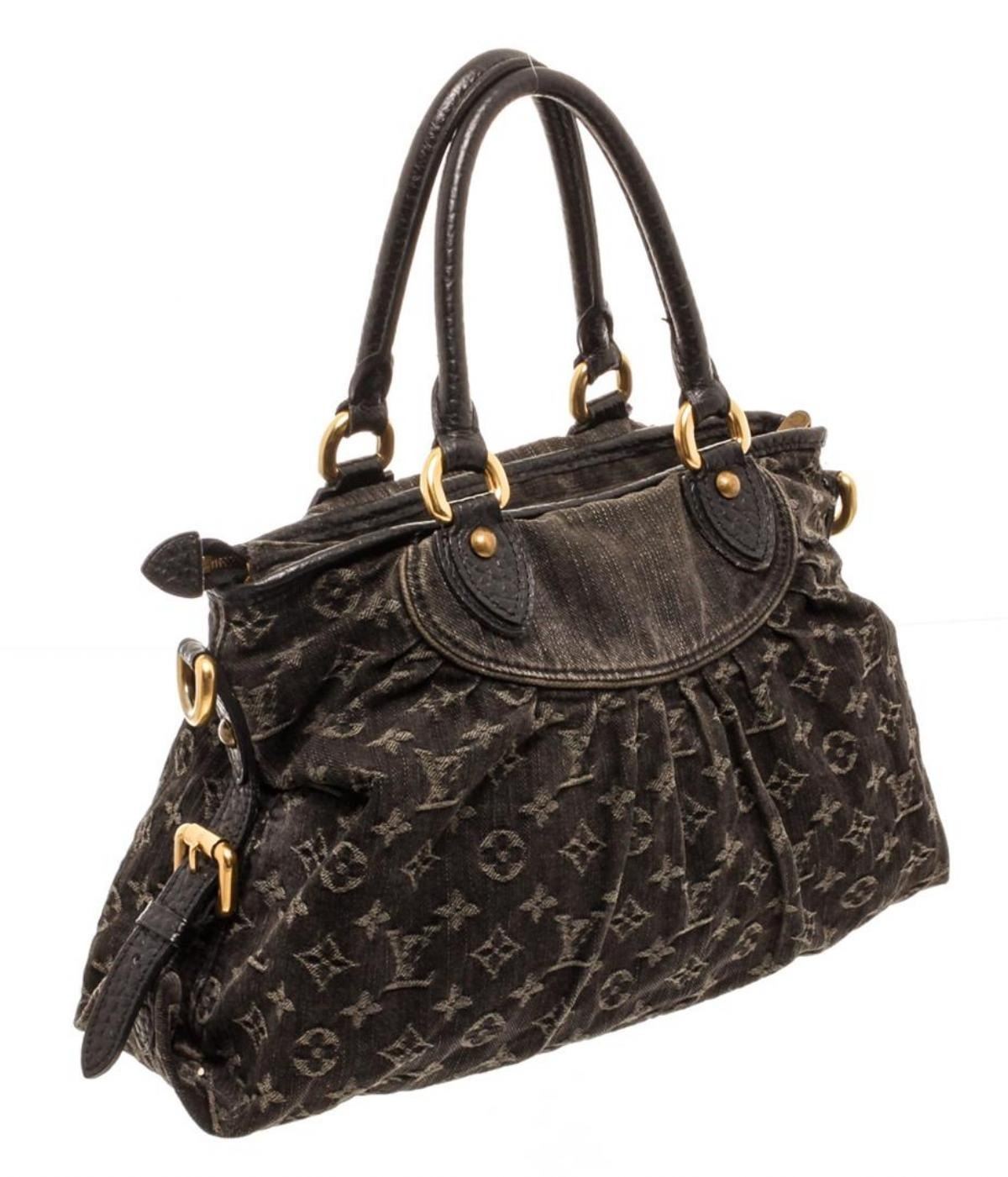 One Louis Vuitton Black Denim Monogram Neo Cabby MM Bag. Black monogram denim Louis Vuitton Denim Neo Cabby MM with brass hardware, dual rolled top handles, detachable flat shoulder strap with buckle adjustment, tonal leather trim, marigold Alcantara lining, dual slip pockets at interior wall and zip closure at top. MKX