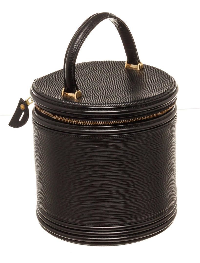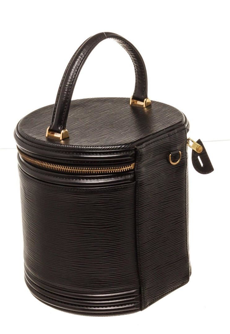 Louis Vuitton Black Epi Cannes Case Bucket Bag with material epi leather, gold-tone hardware, trim tan vachetta leather, interior slip pocket, top handle and zipper closure.