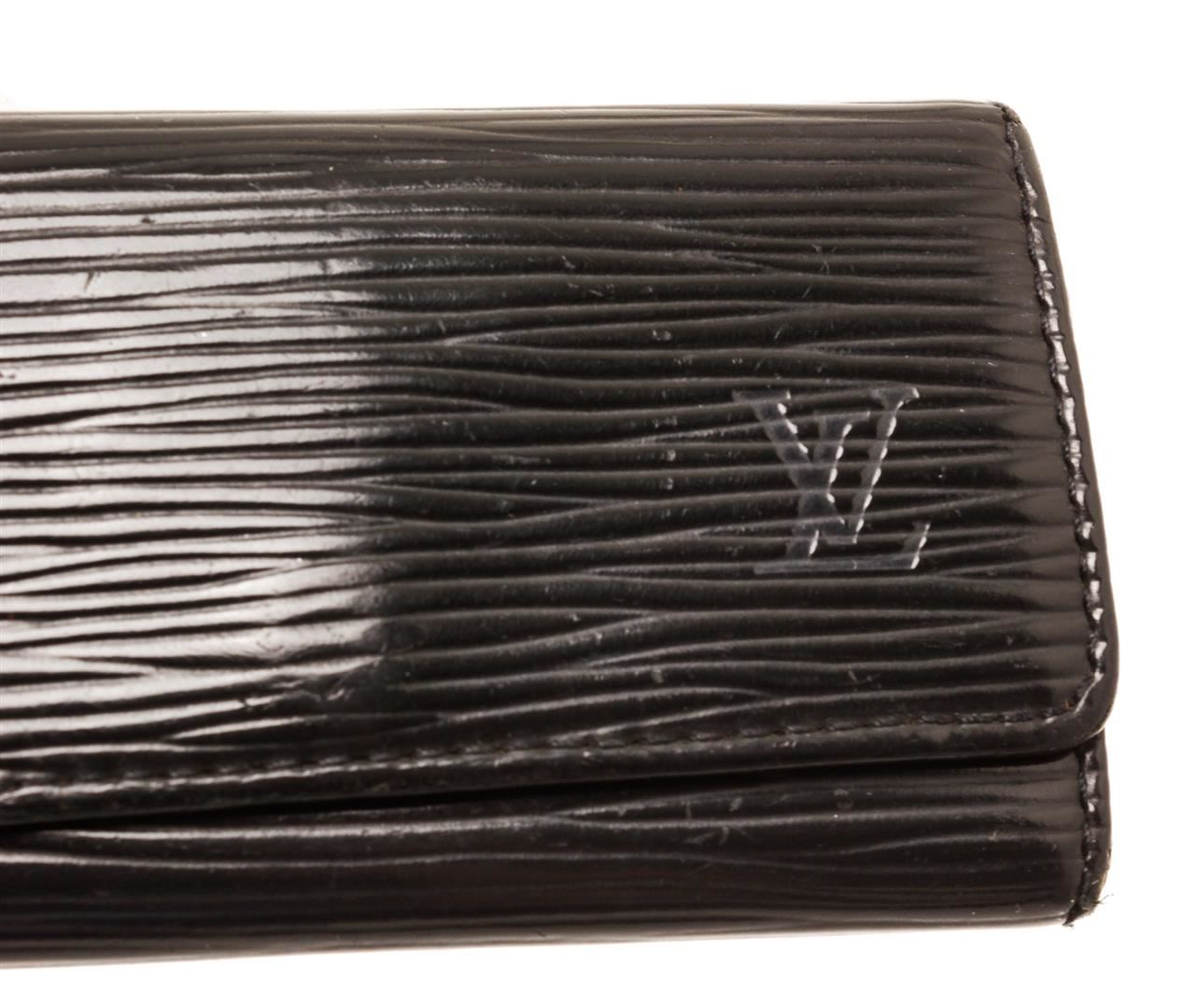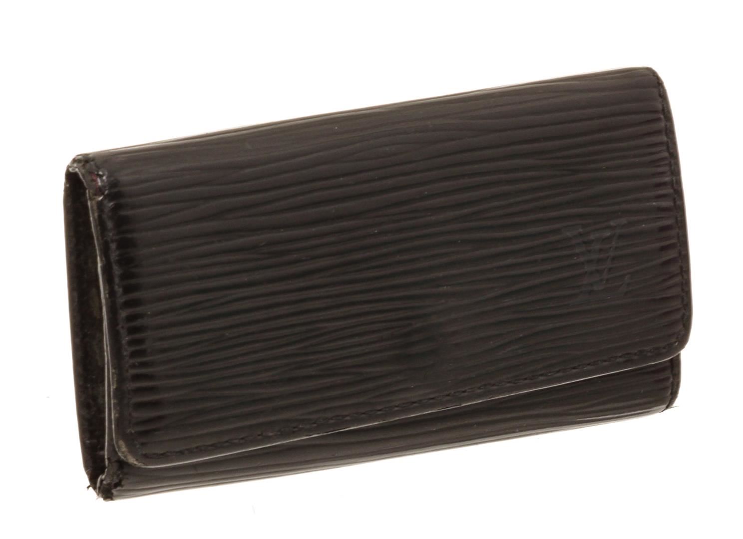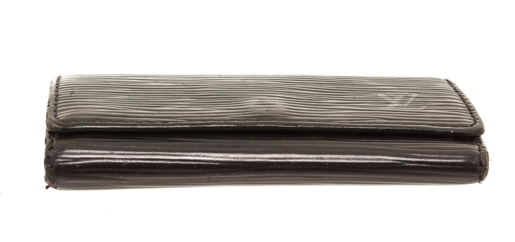 One Louis Vuitton Black Epi Leather 4 Key Holder. Epi leather Louis Vuitton key holder with gold-tone hardware, debossed logo at front, tonal leather interior, four key clasps and snap closure at front flap. MKX
