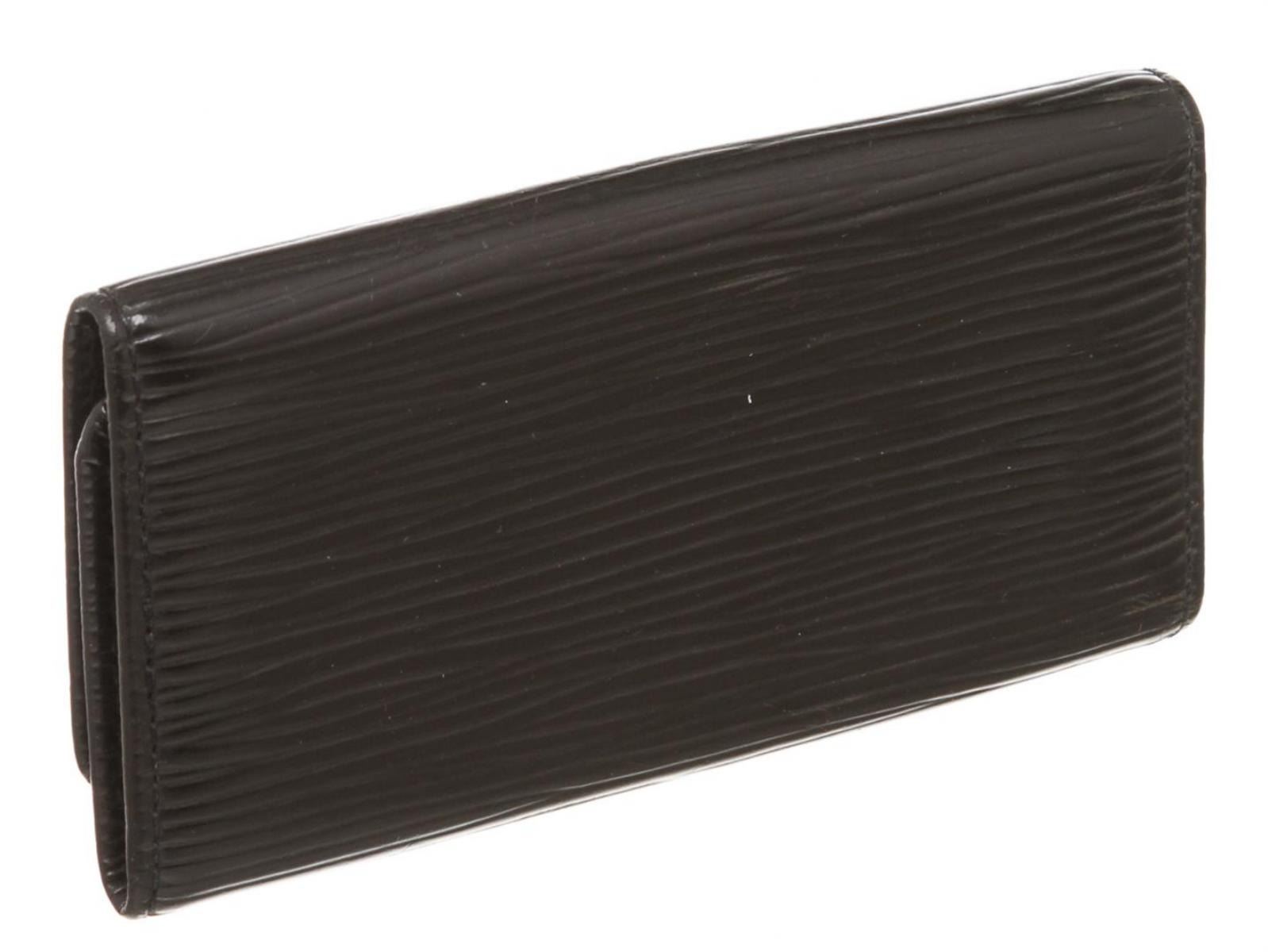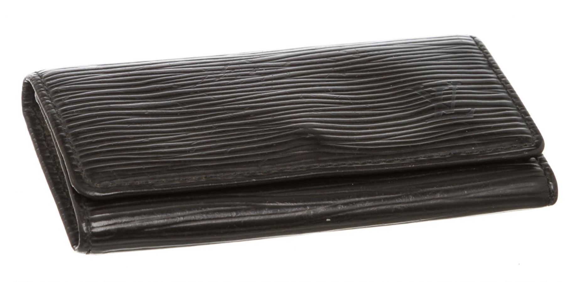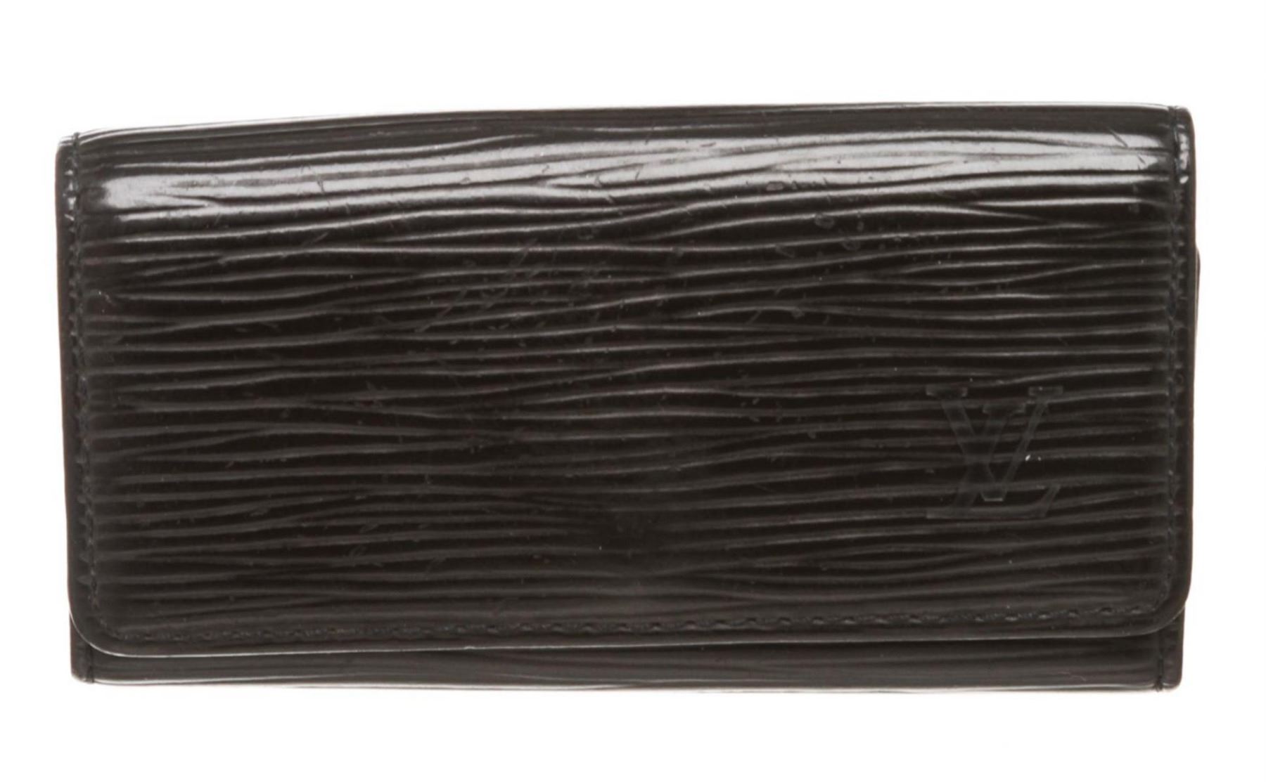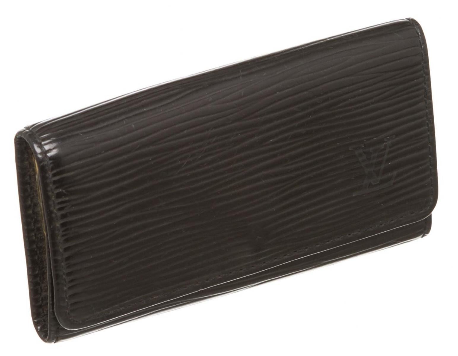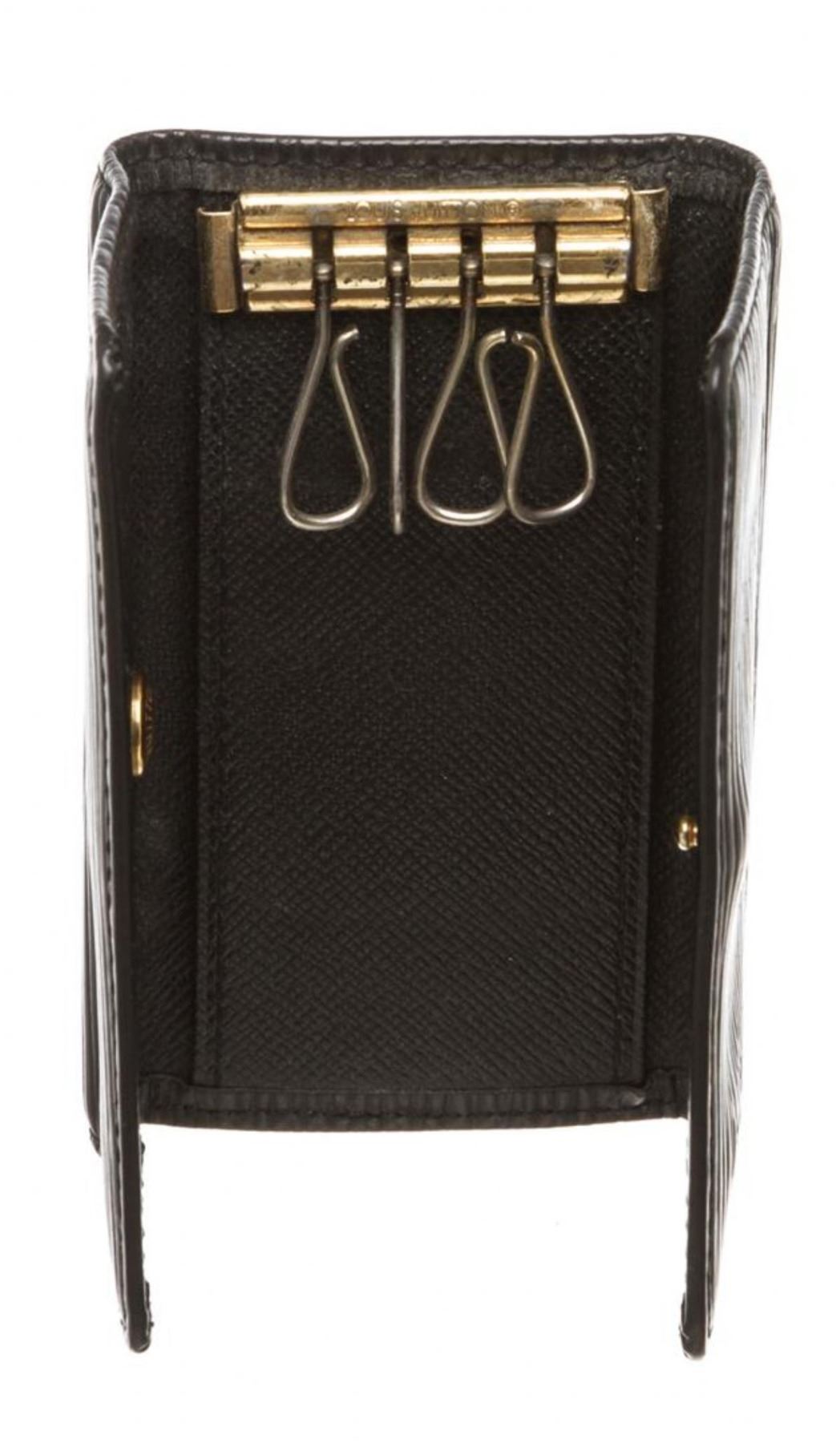 Epi leather Louis Vuitton 4 key holder with gold-tone hardware, debossed logo at front, tonal leather interior, four key clasps and snap closure at front flap.
