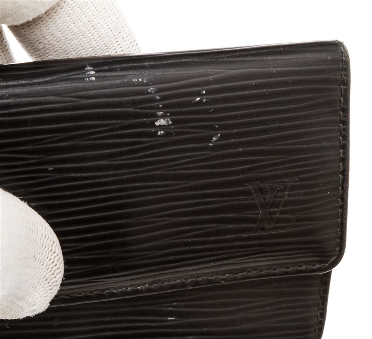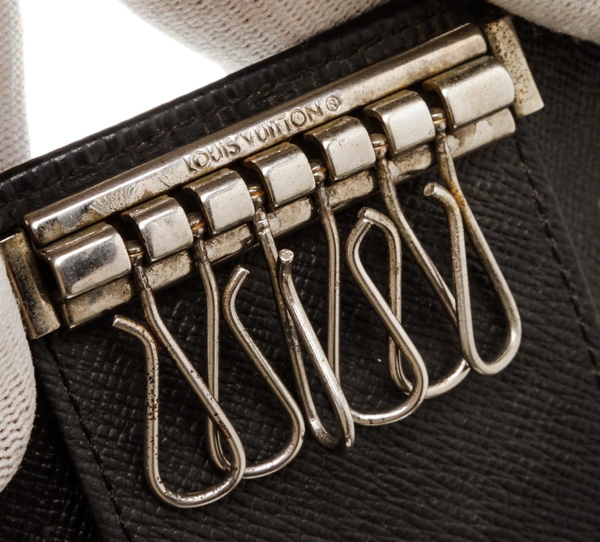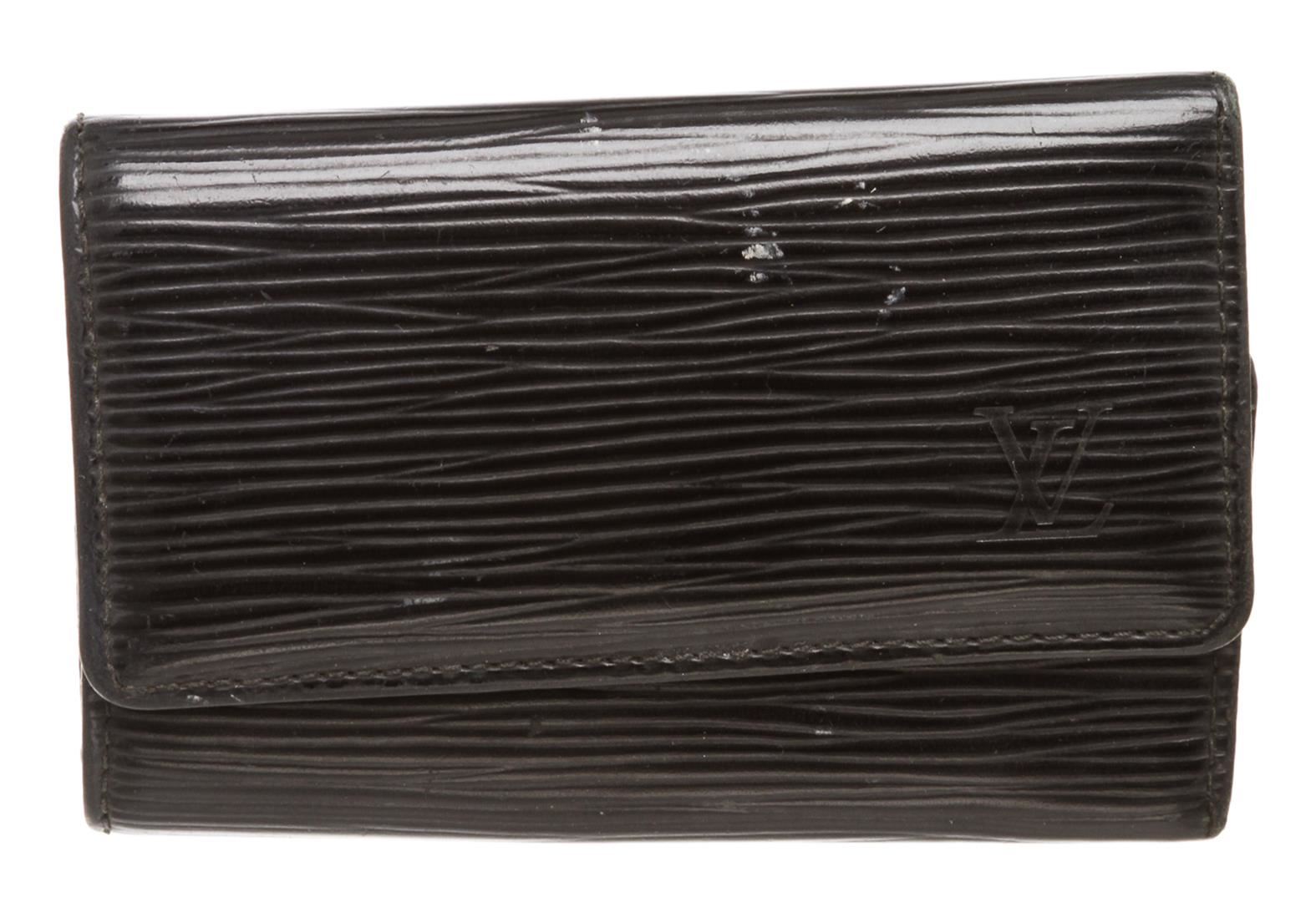 One Louis Vuitton Black Epi Leather 6 Key Holder. Black Epi leather Louis Vuitton key holder with gold-tone hardware, debossed logo at front, tonal leather interior, key clasps and snap closure at front flap. MKX