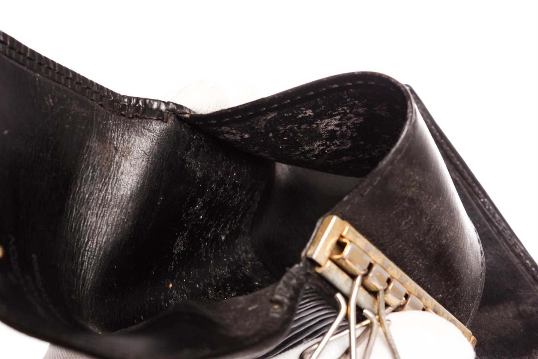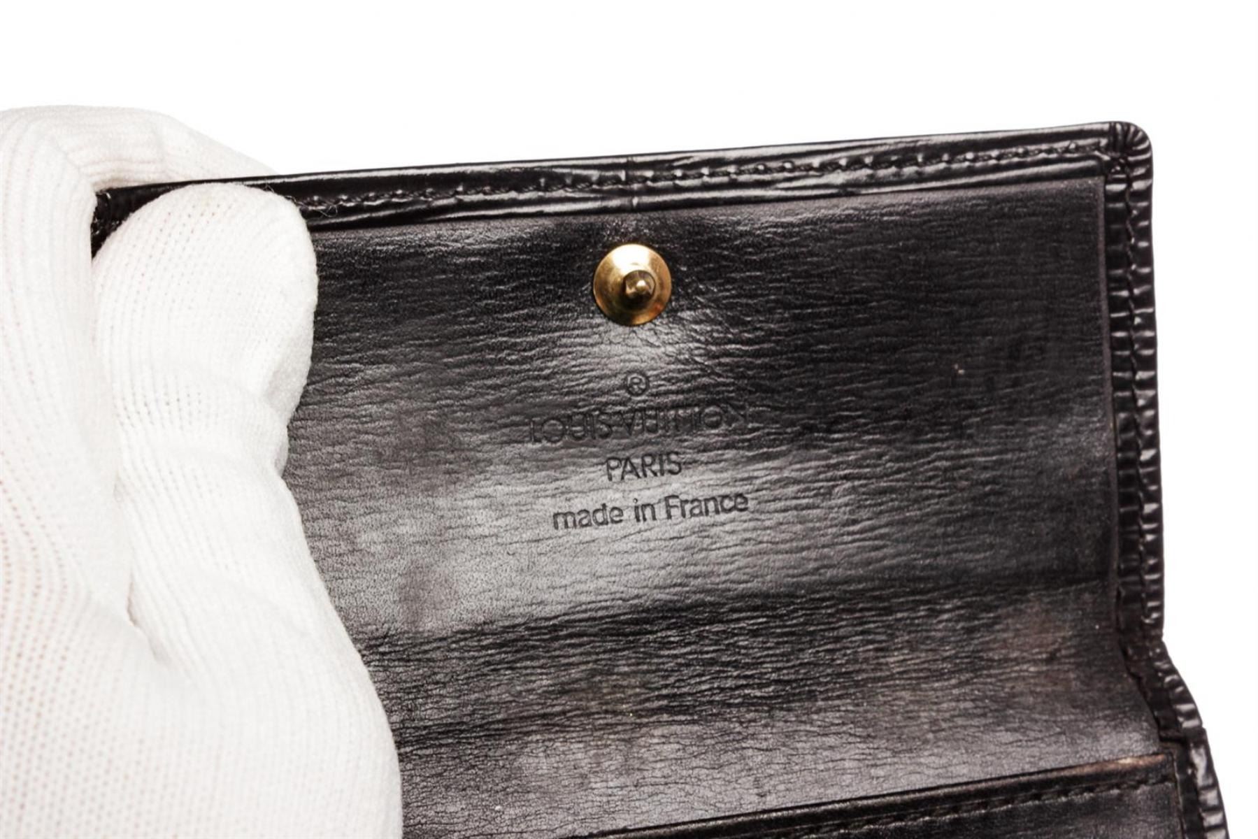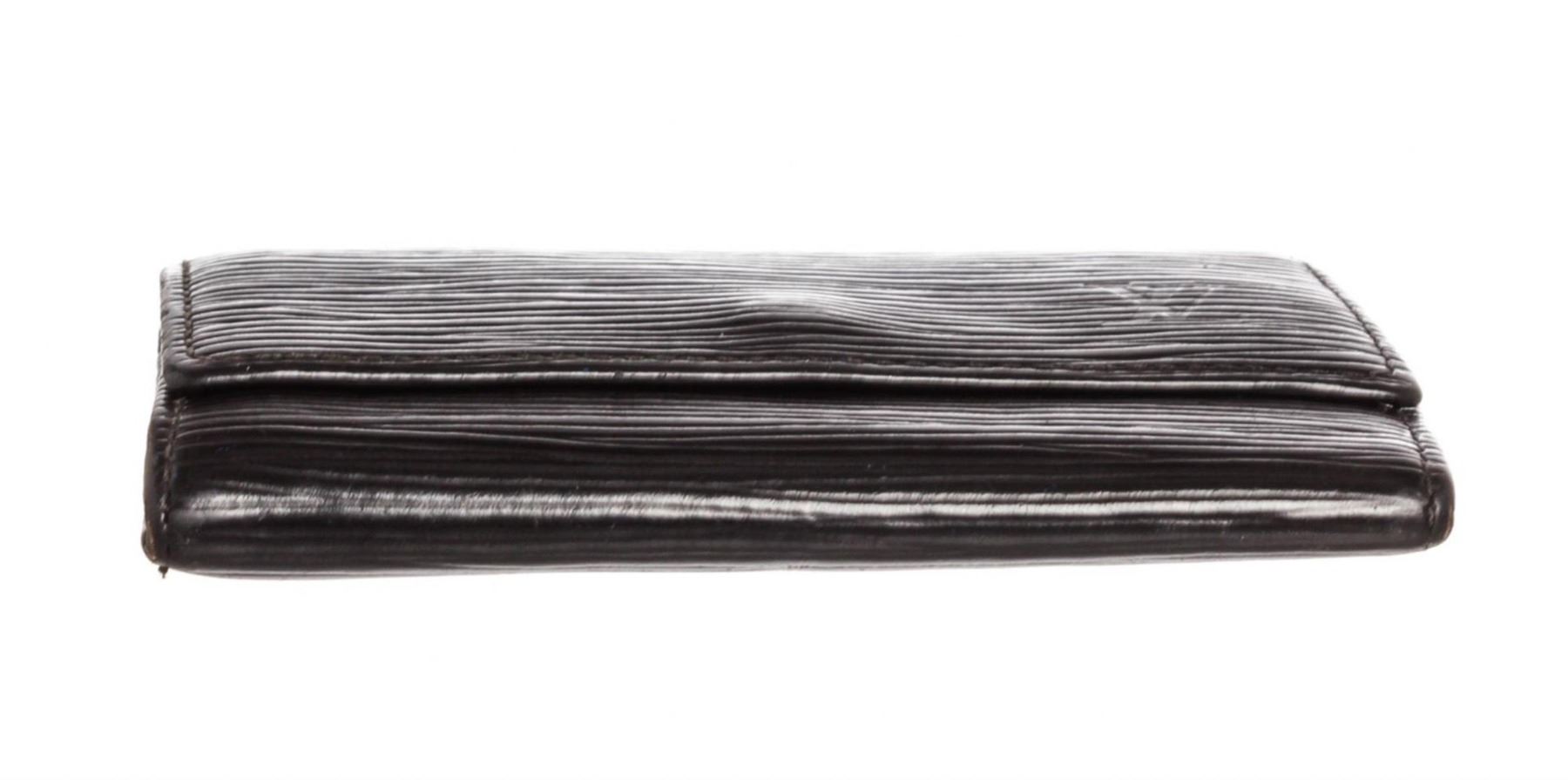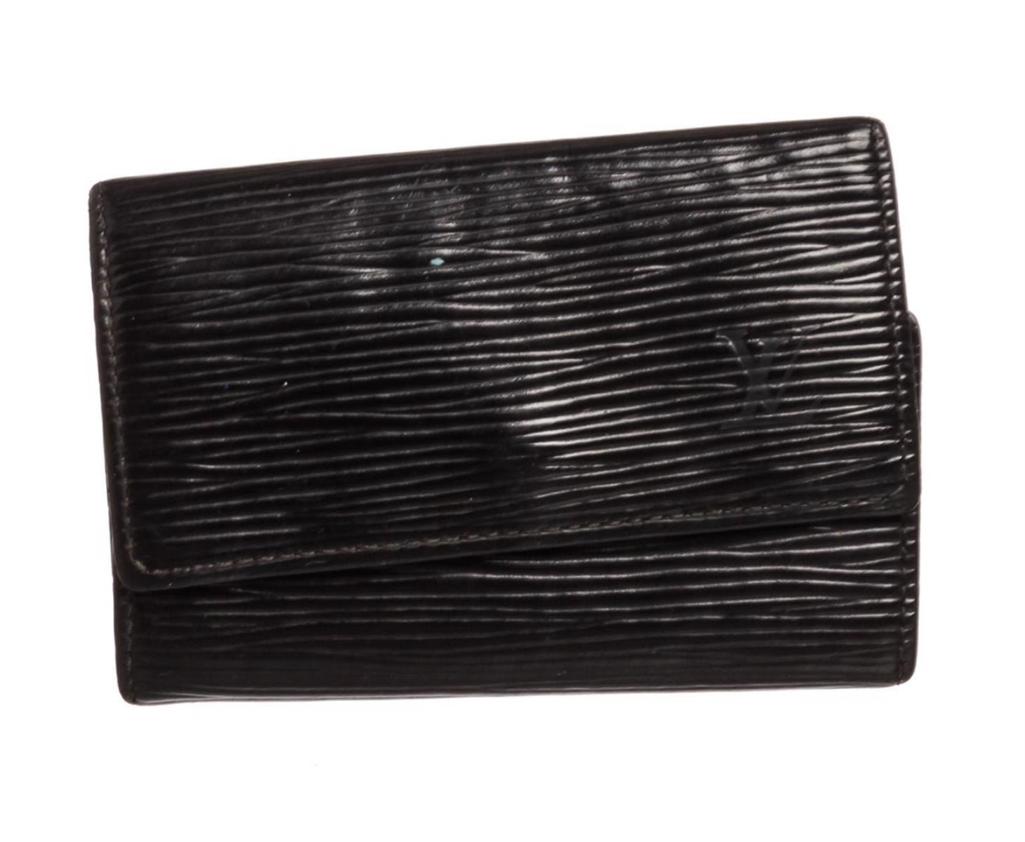One Louis Vuitton Black Epi Leather 6 Key Holder. Black Epi leather Louis Vuitton key holder with gold-tone hardware, debossed logo at front, tonal leather interior, six key clasps and snap closure at front flap.