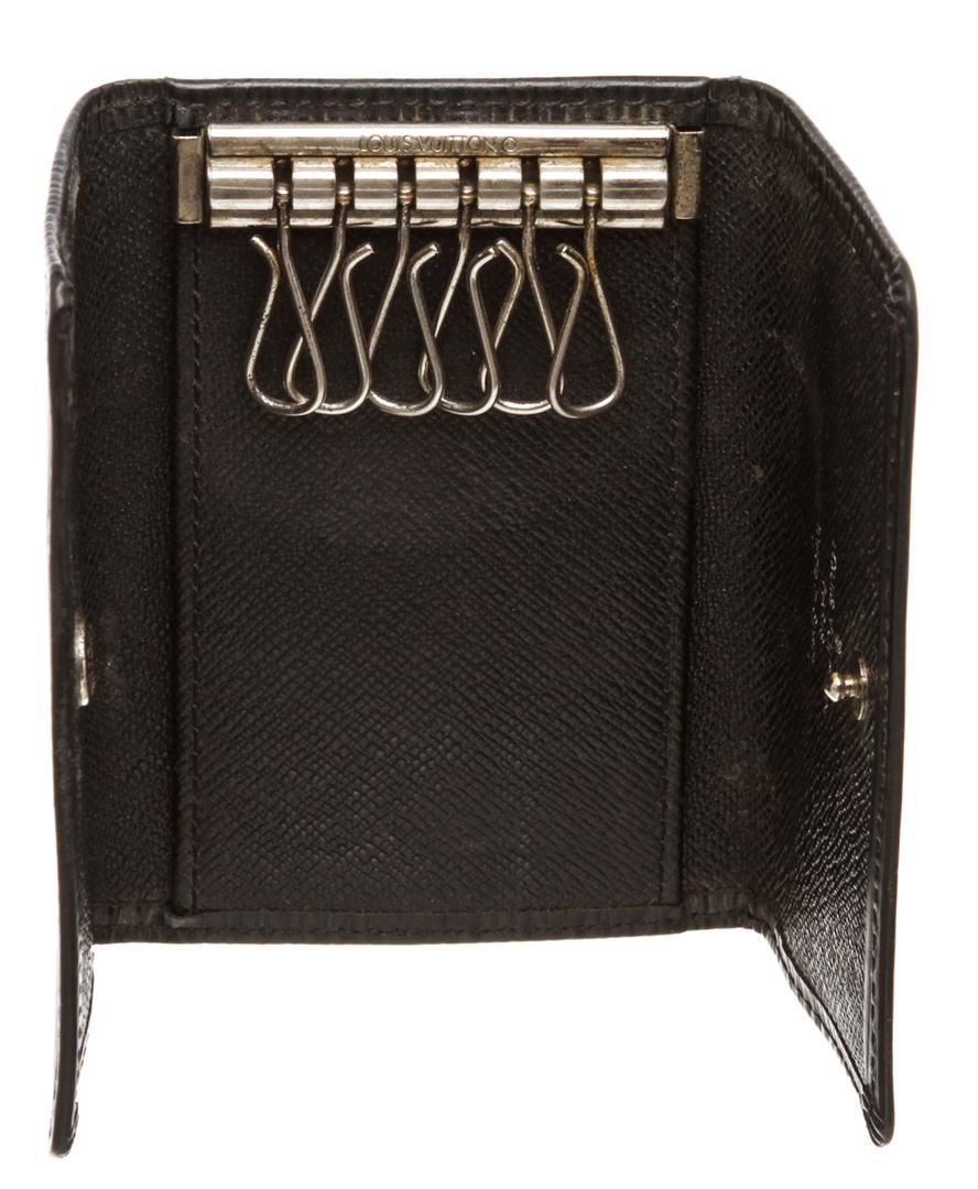 One Louis Vuitton Black Epi Leather 6 Key Holder. Black Epi leather Louis Vuitton key holder with gold-tone hardware, debossed logo at front, tonal leather interior, key clasps and snap closure at front flap. MKX