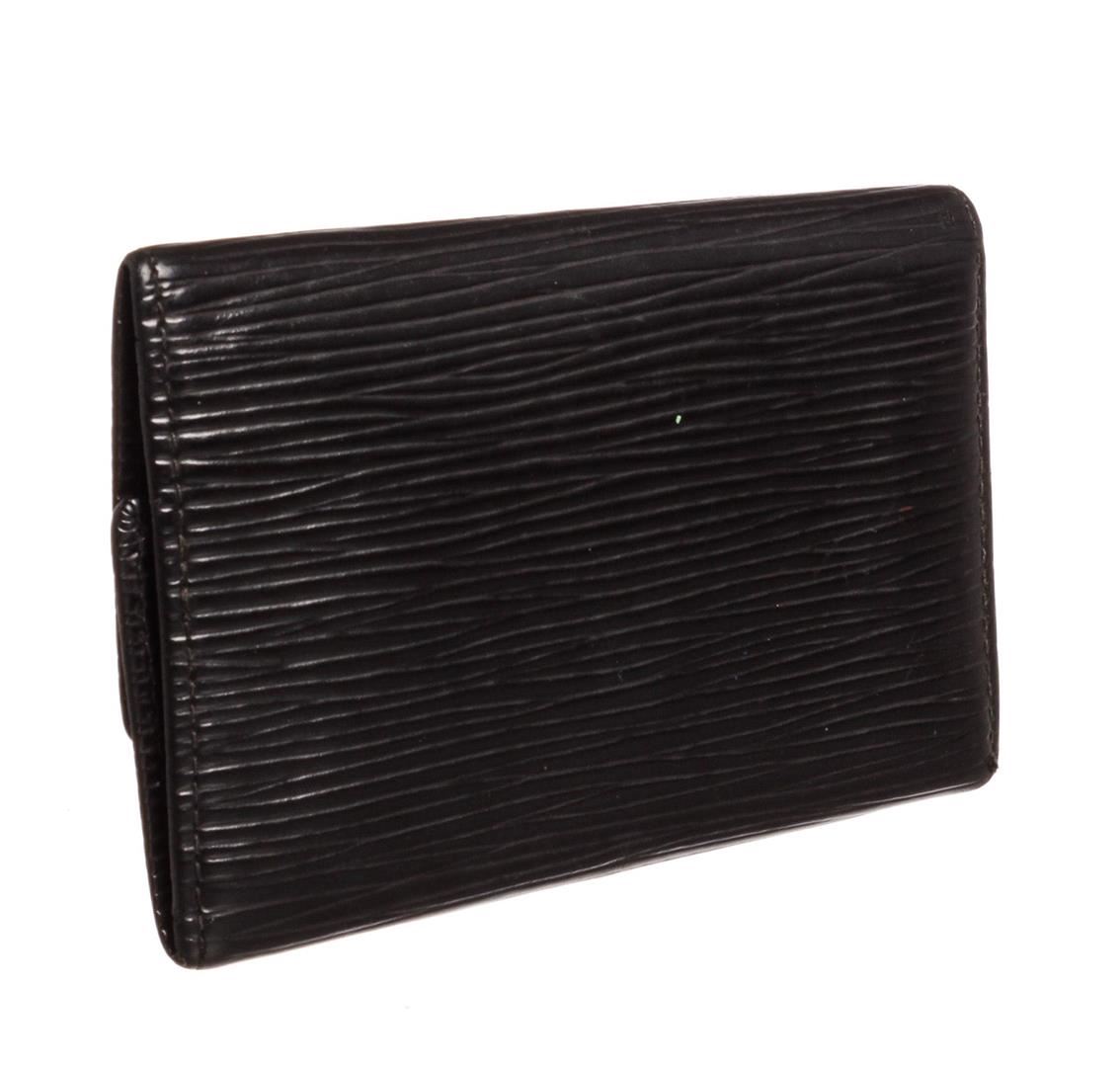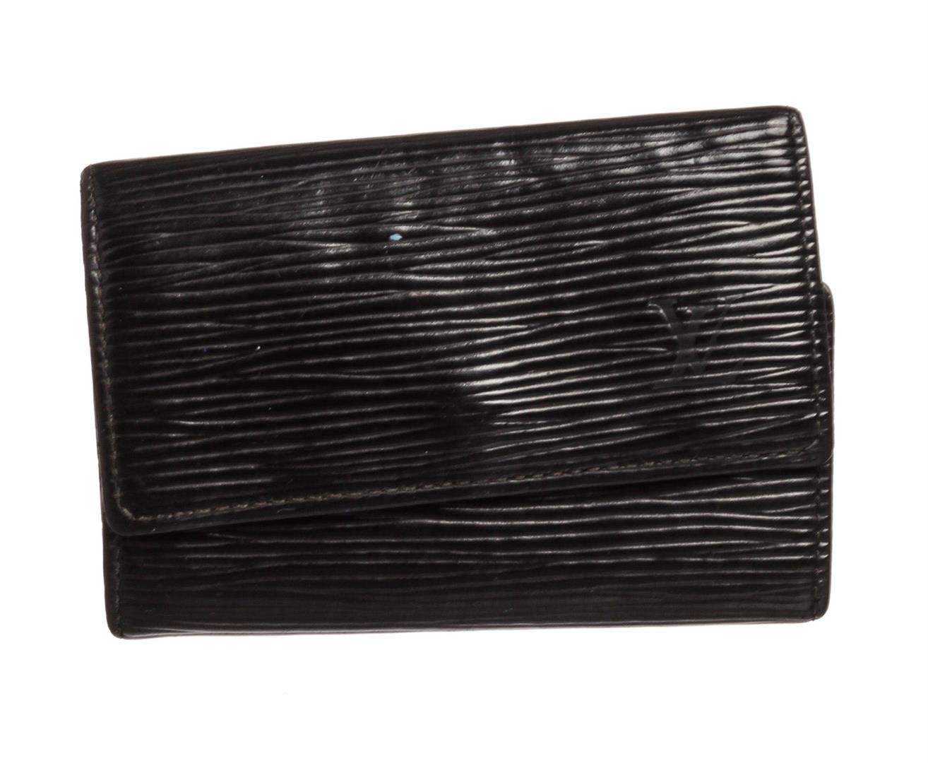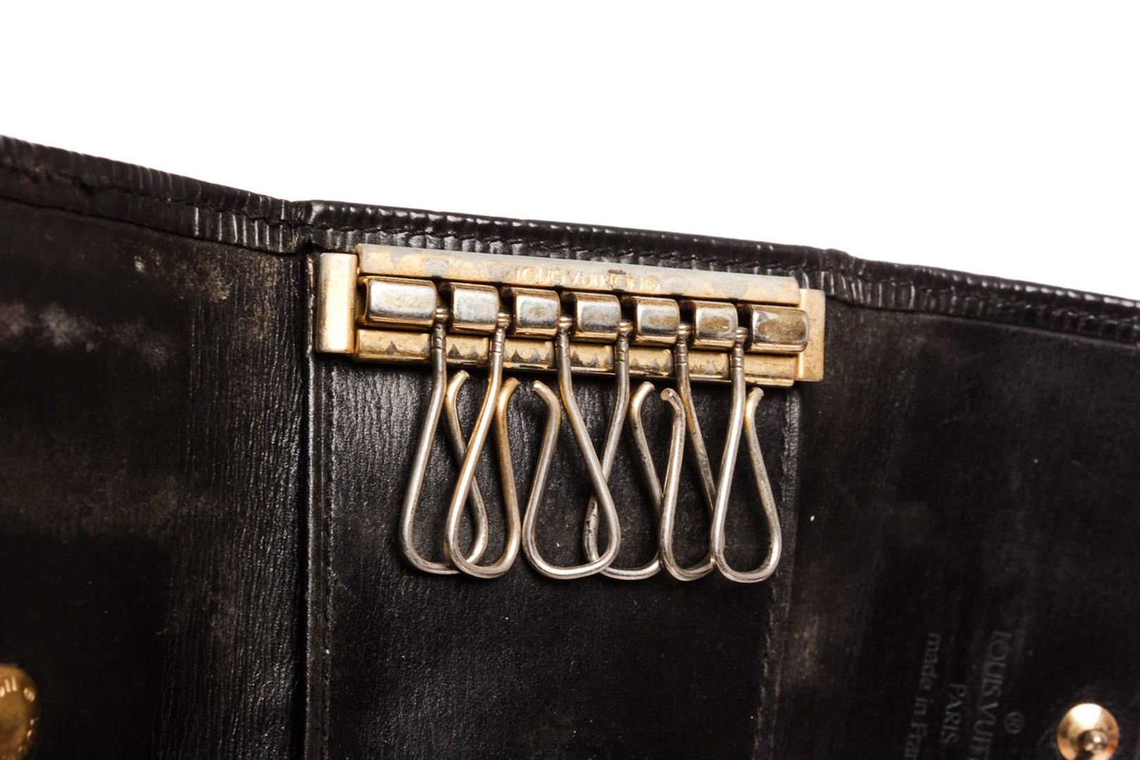 Black Epi leather Louis Vuitton key holder with gold-tone hardware, debossed logo at front, tonal leather interior, six key clasps and snap closure at front flap.