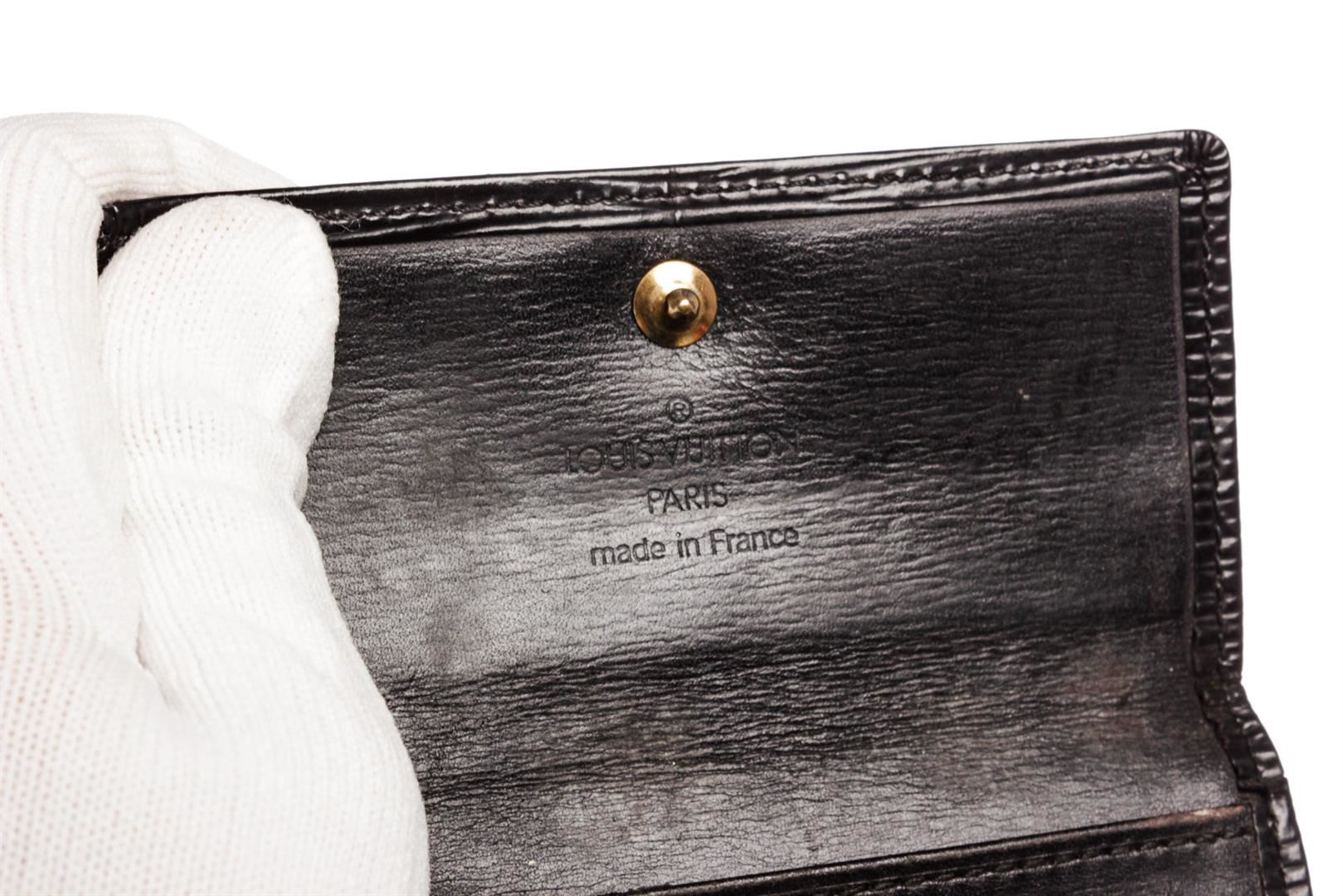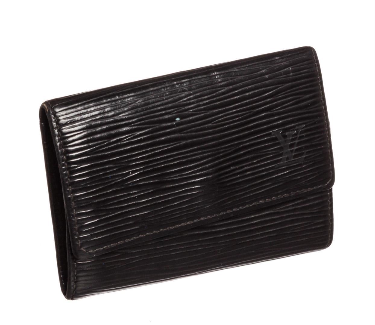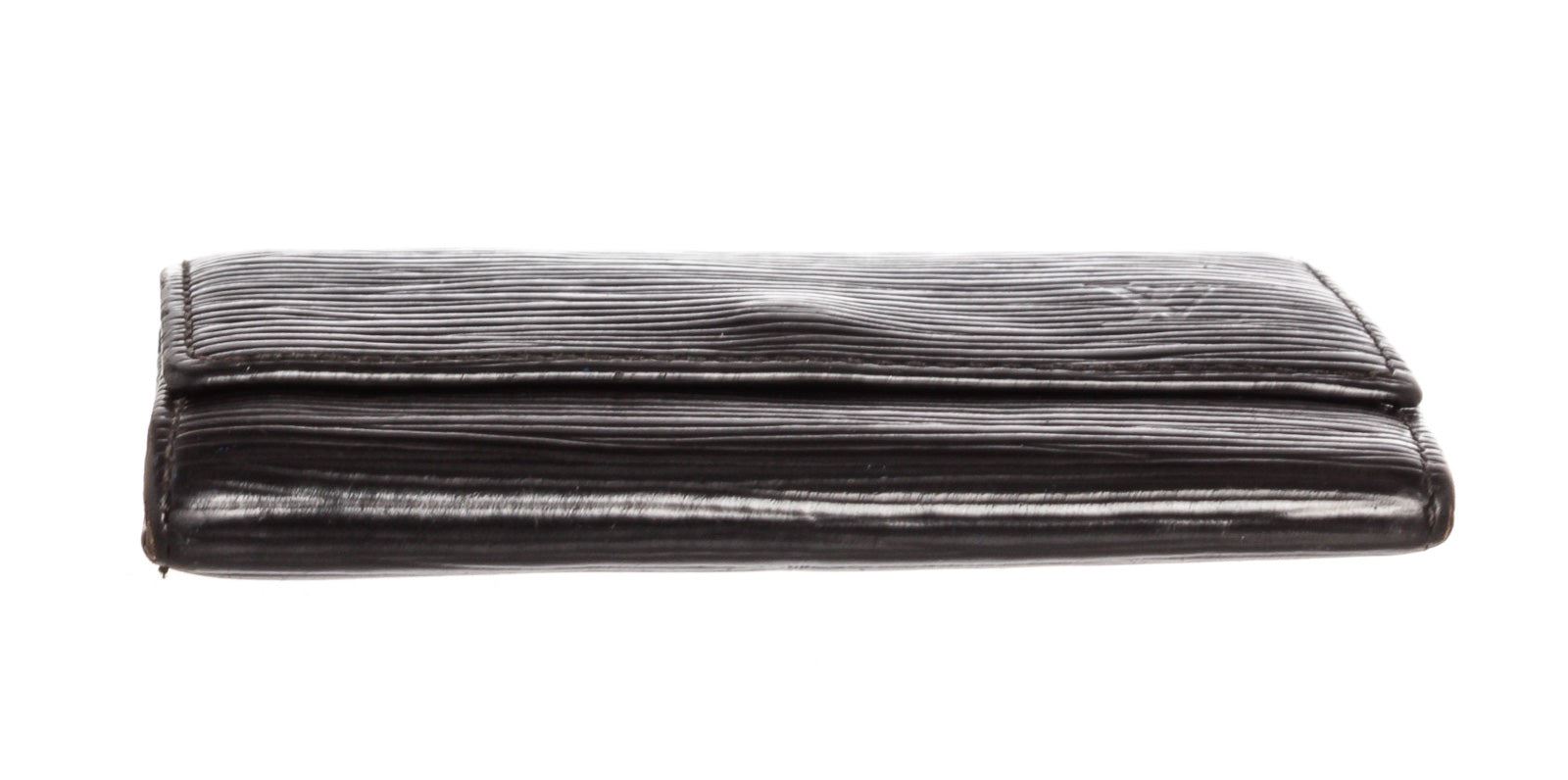 Black Epi leather Louis Vuitton key holder with gold-tone hardware, debossed logo at front, tonal leather interior, six key clasps and snap closure at front flap.