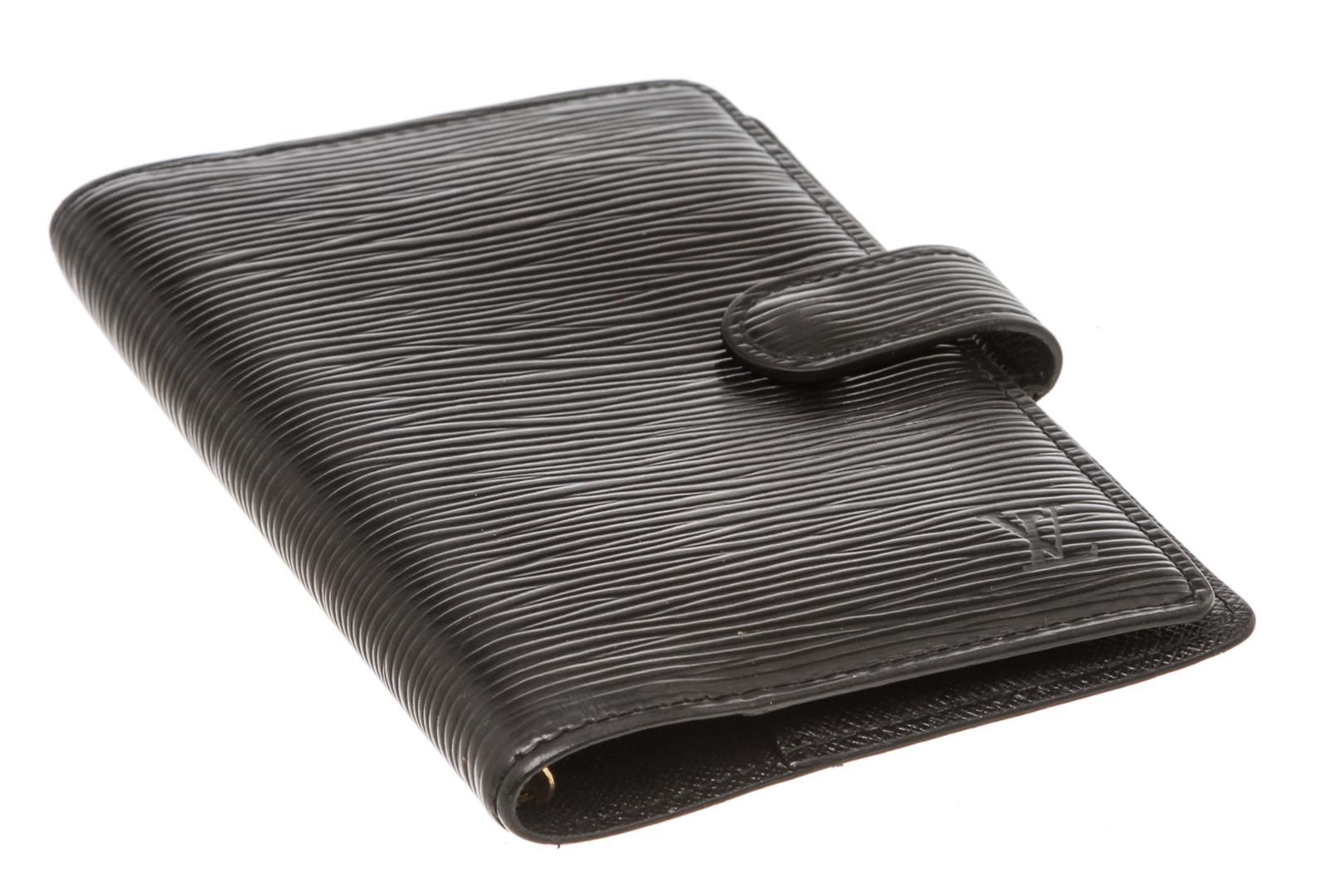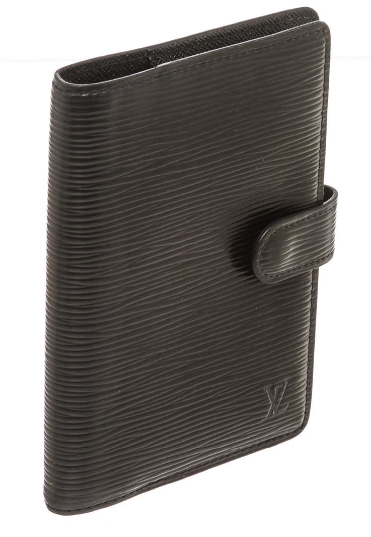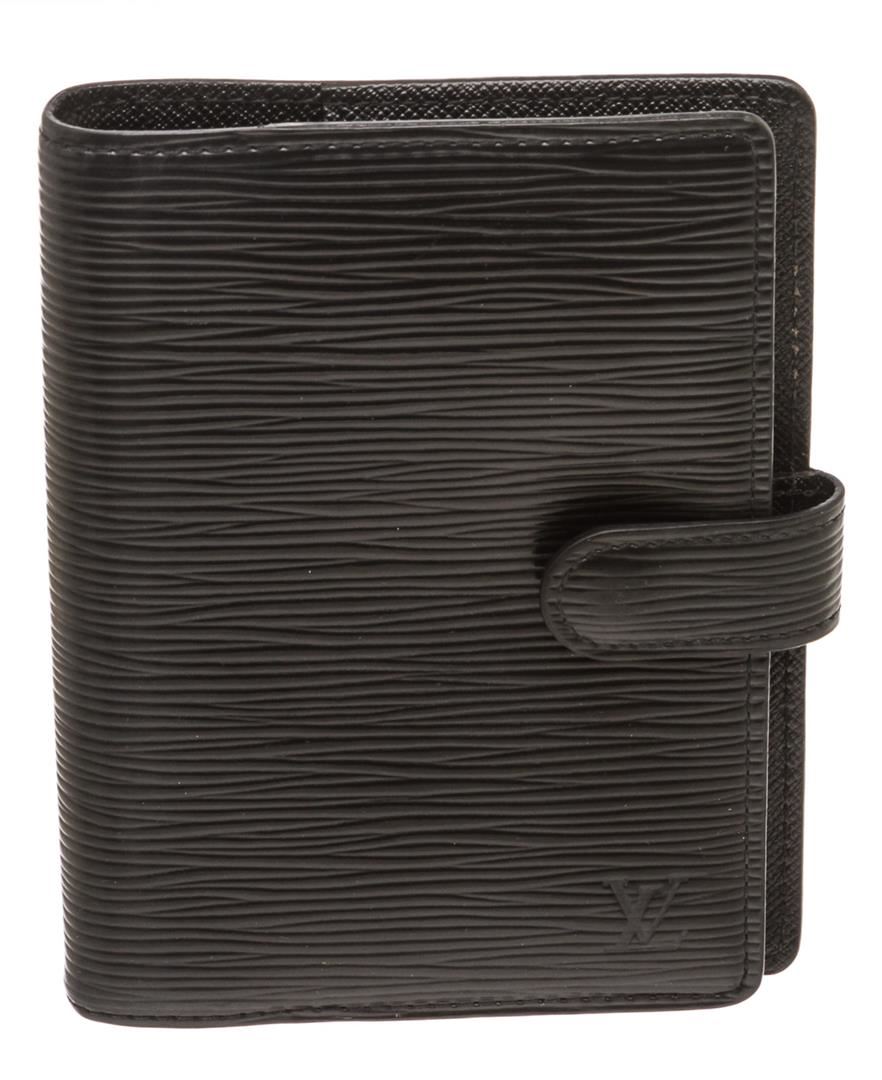 One Louis Vuitton Black Epi Leather Agenda PM Cover. Black Epi leather Louis Vuitton small ring agenda cover PM with silver-tone hardware, embossed logo accent at front corner, tonal leather lining, card slots and dual slit pockets at interior with snap closure at front flap.