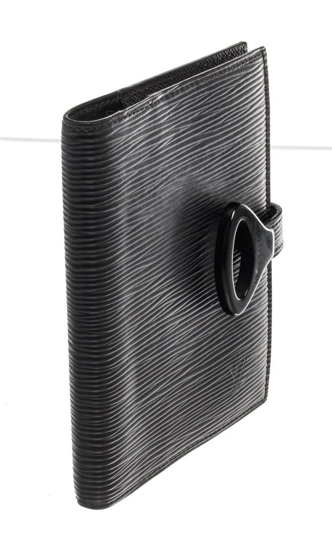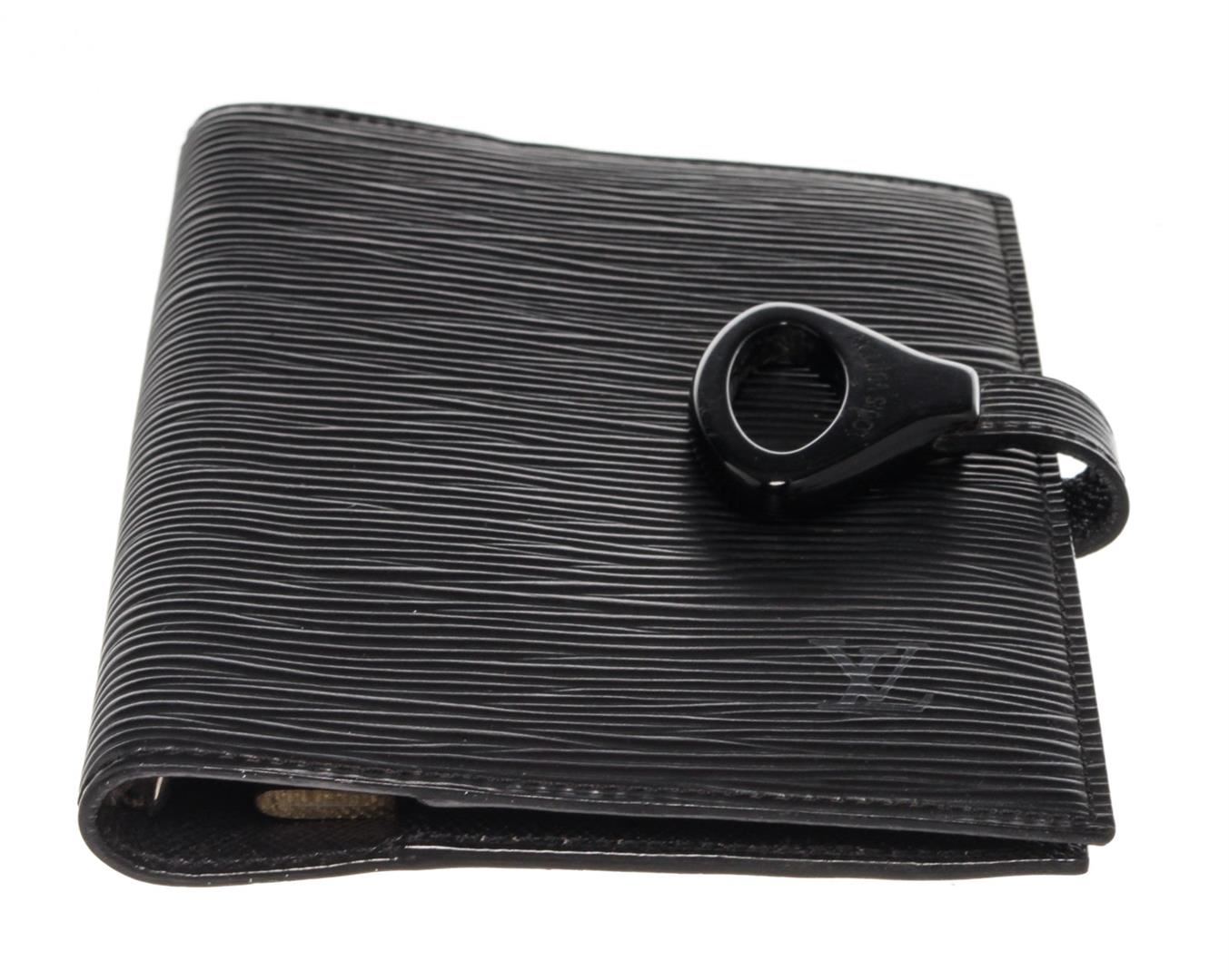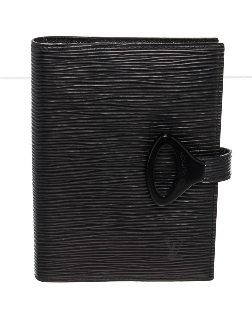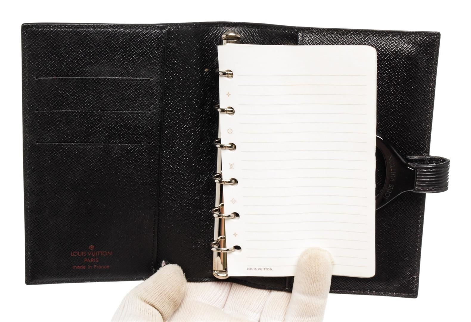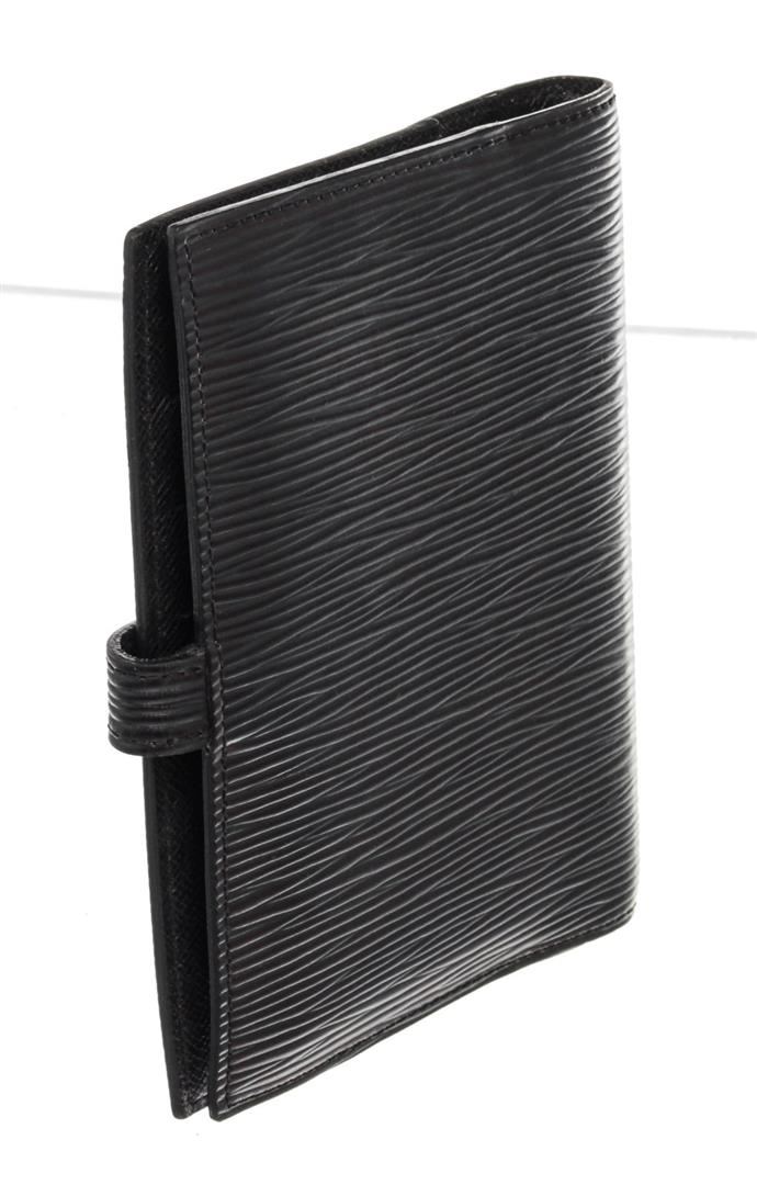 Louis Vuitton Black Epi Leather Agenda Z PM Wallet with epi leather, silver-tone hardware, monogram material, tan vachetta leather trim, and zipper closure.