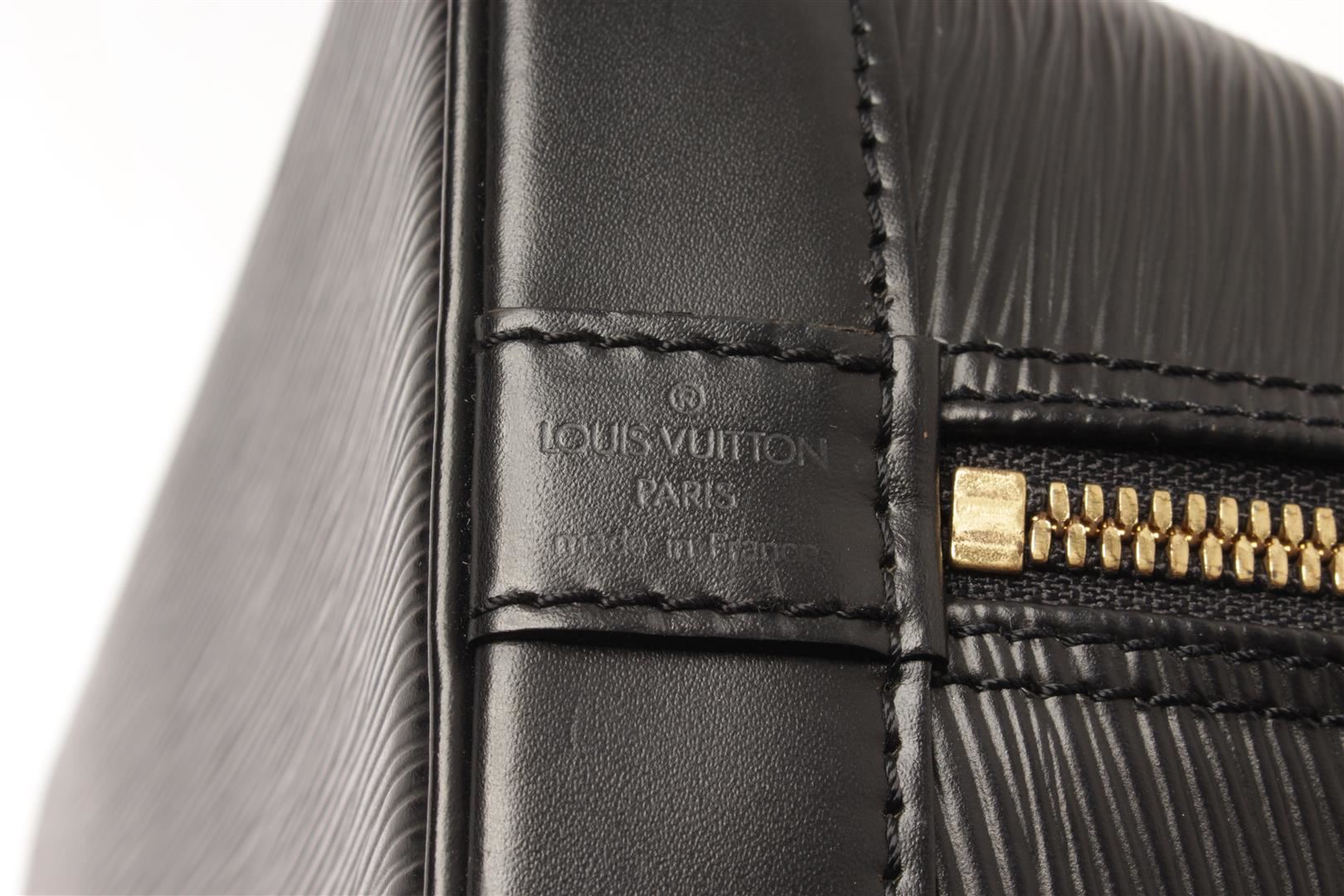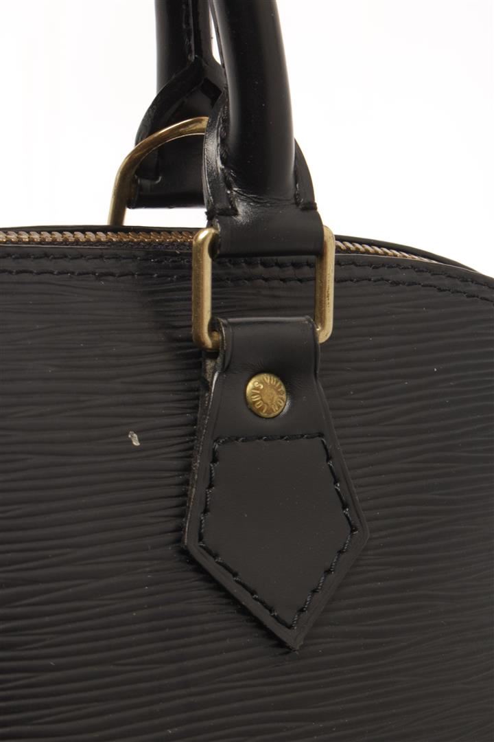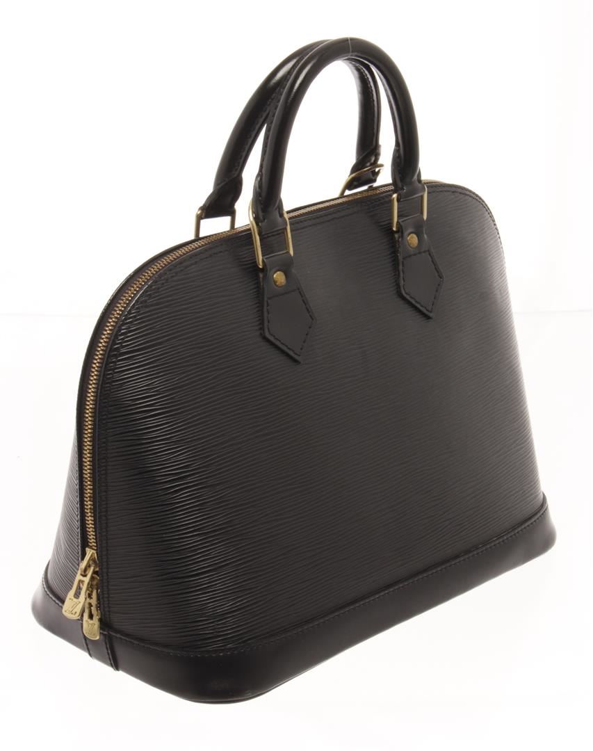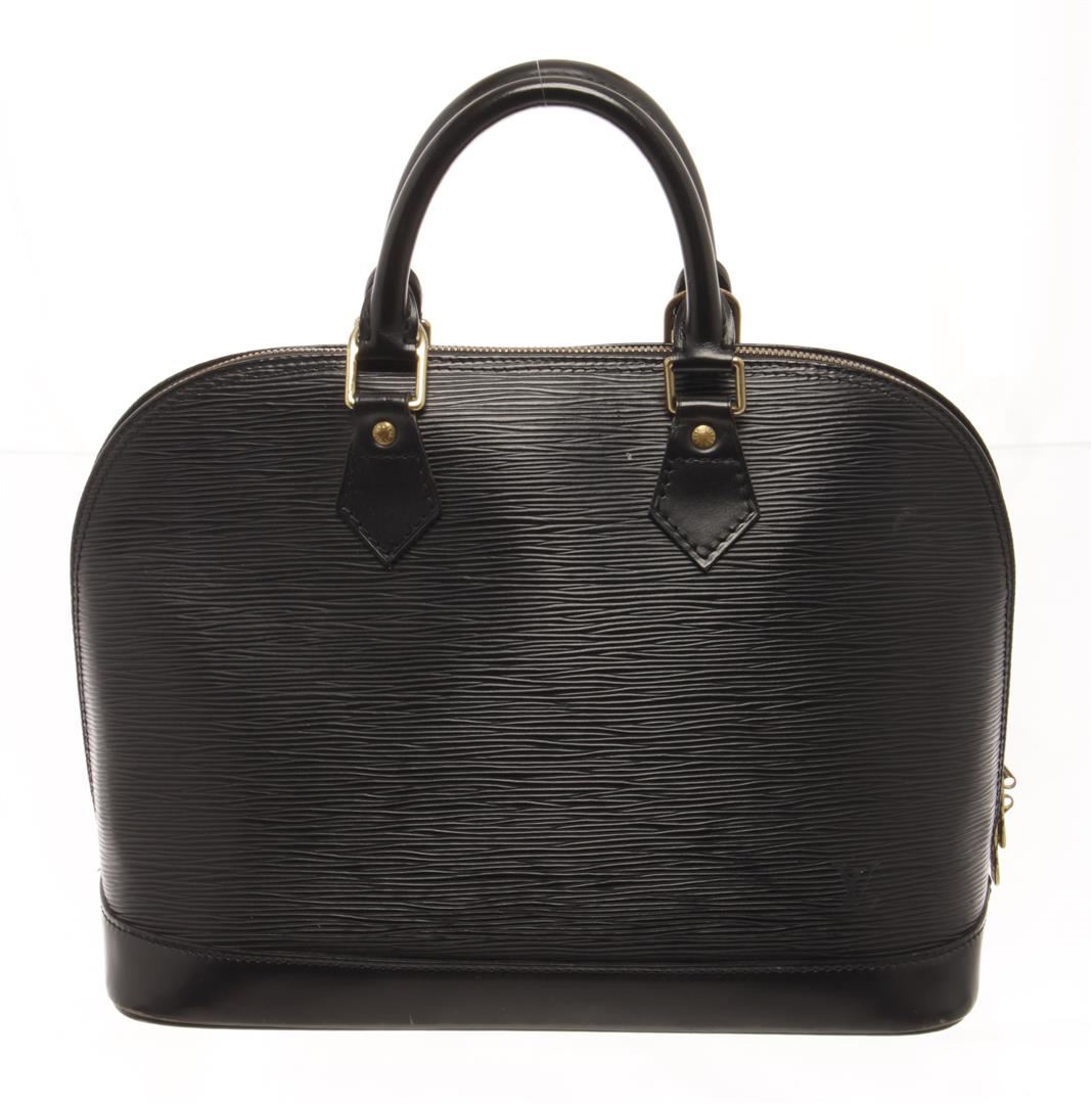 One Louis Vuitton Black Epi Leather Alma PM Satchel Bag. Item is sold AS-IS. All available information is listed in the description and shown in the photo. louis vuitton black epi leather alma pm satchel bag with gold-tone hardware, epi leather body, rolled handles, a top zip closure, and an interior slip pocket. 9.1" L x 12.8" W x 6.3" D, 3.1" drop / 23.11 x 32.51 x 16.00, cm 7.87 drop cm