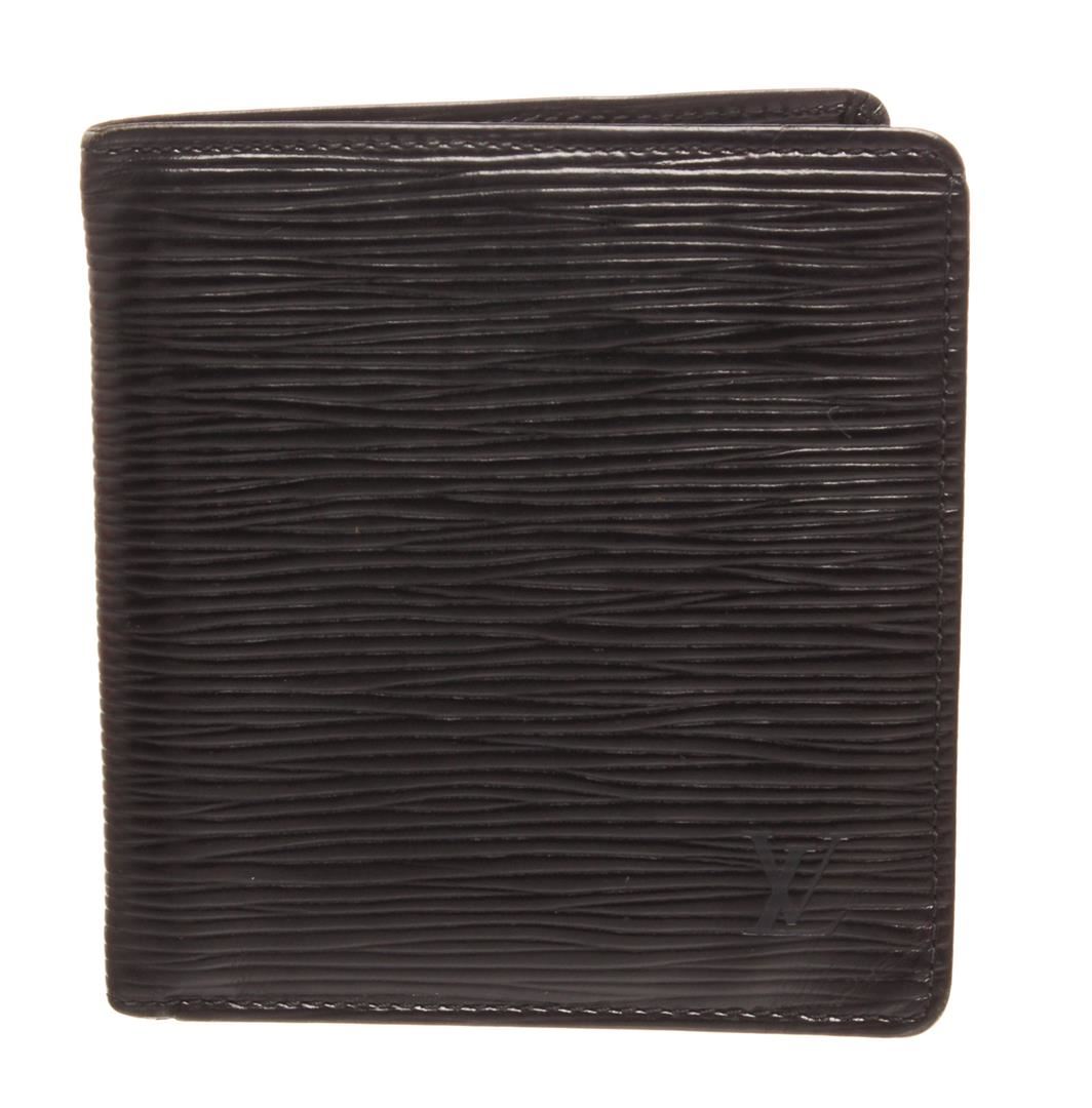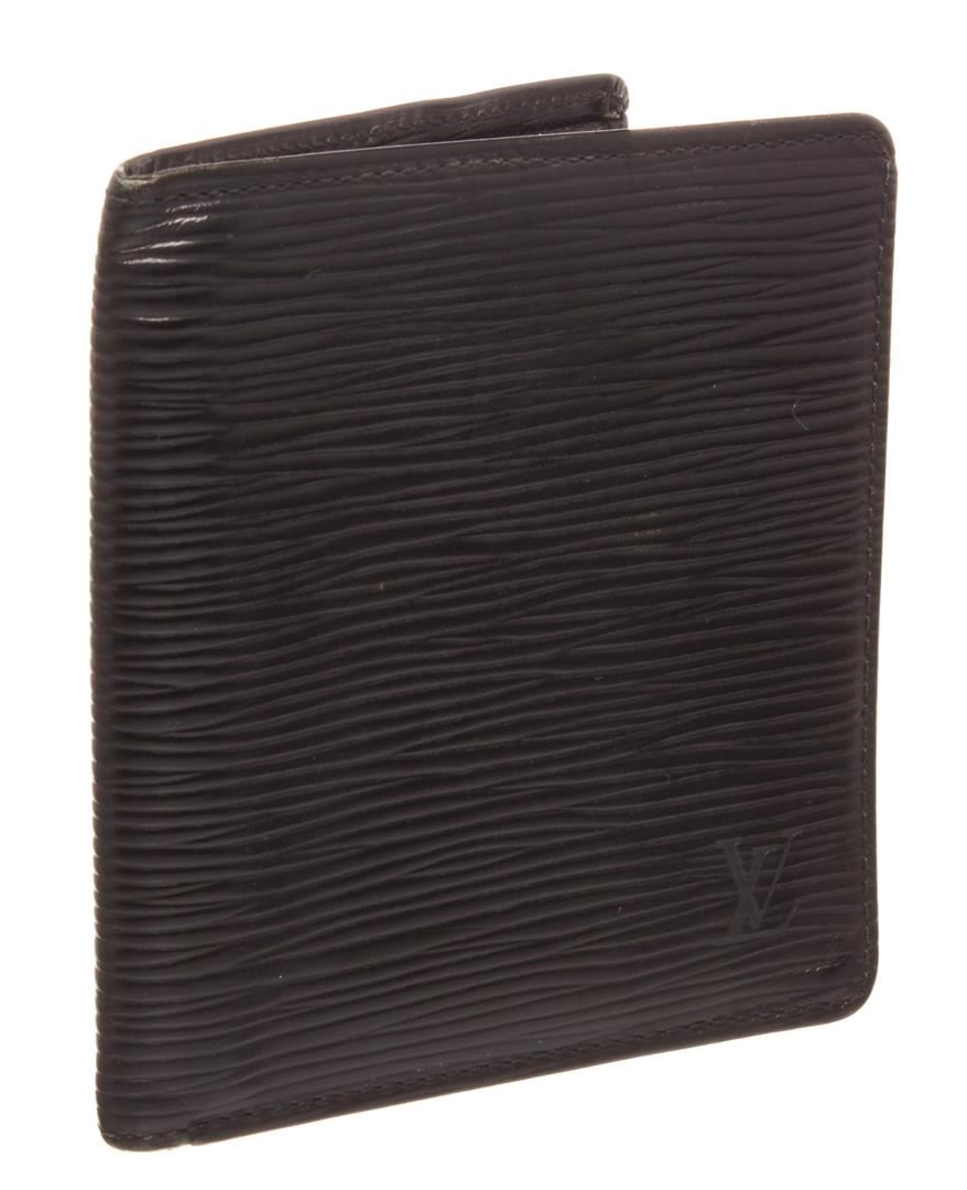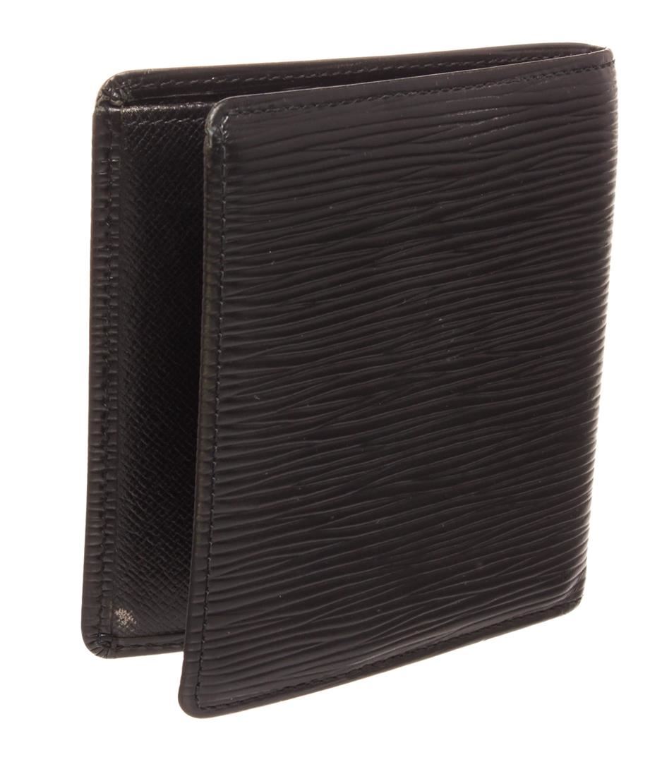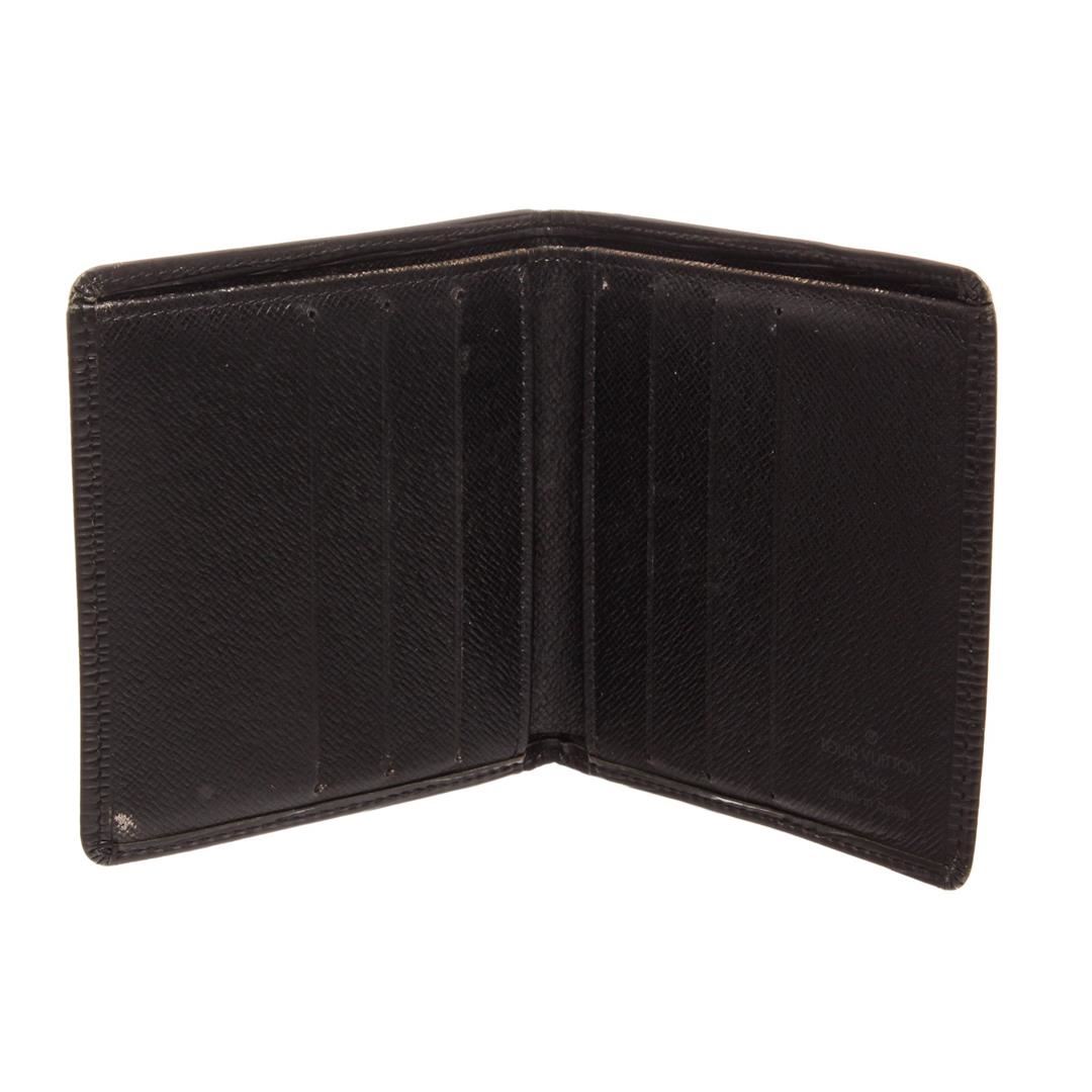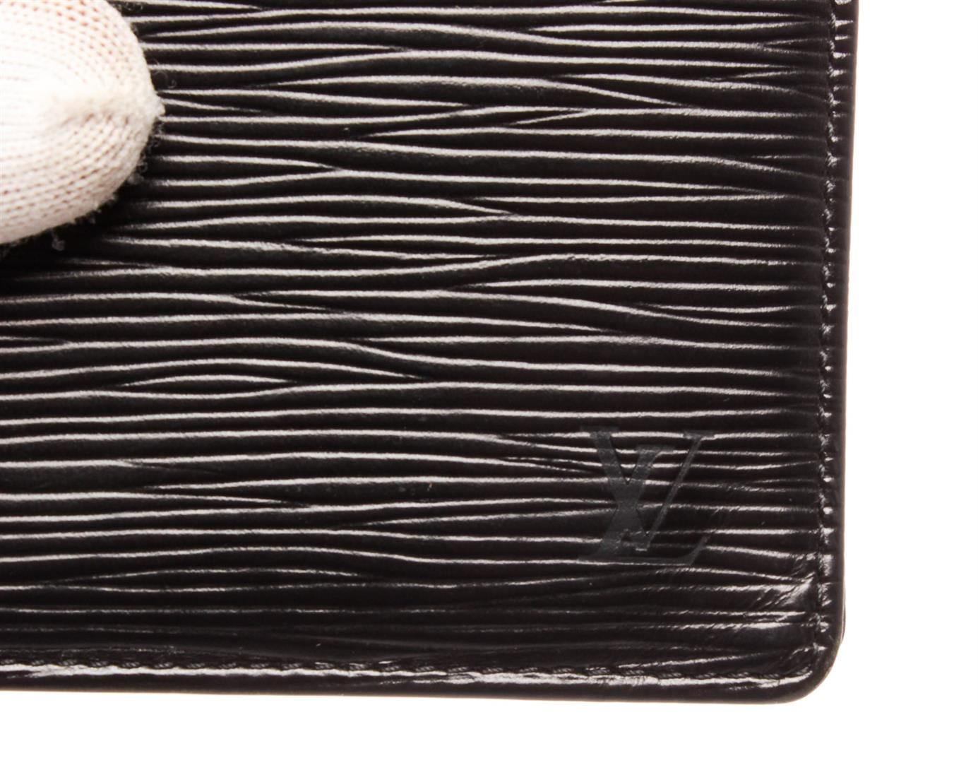 Louis Vuitton black Epi leather bill fold wallet with six card slots, bill pocket, and two side pockets.