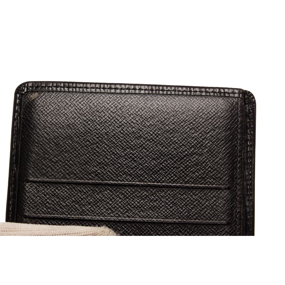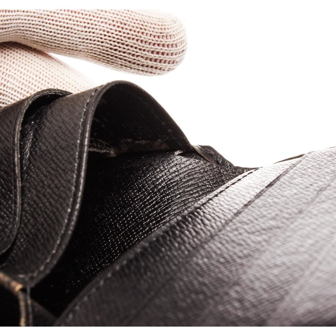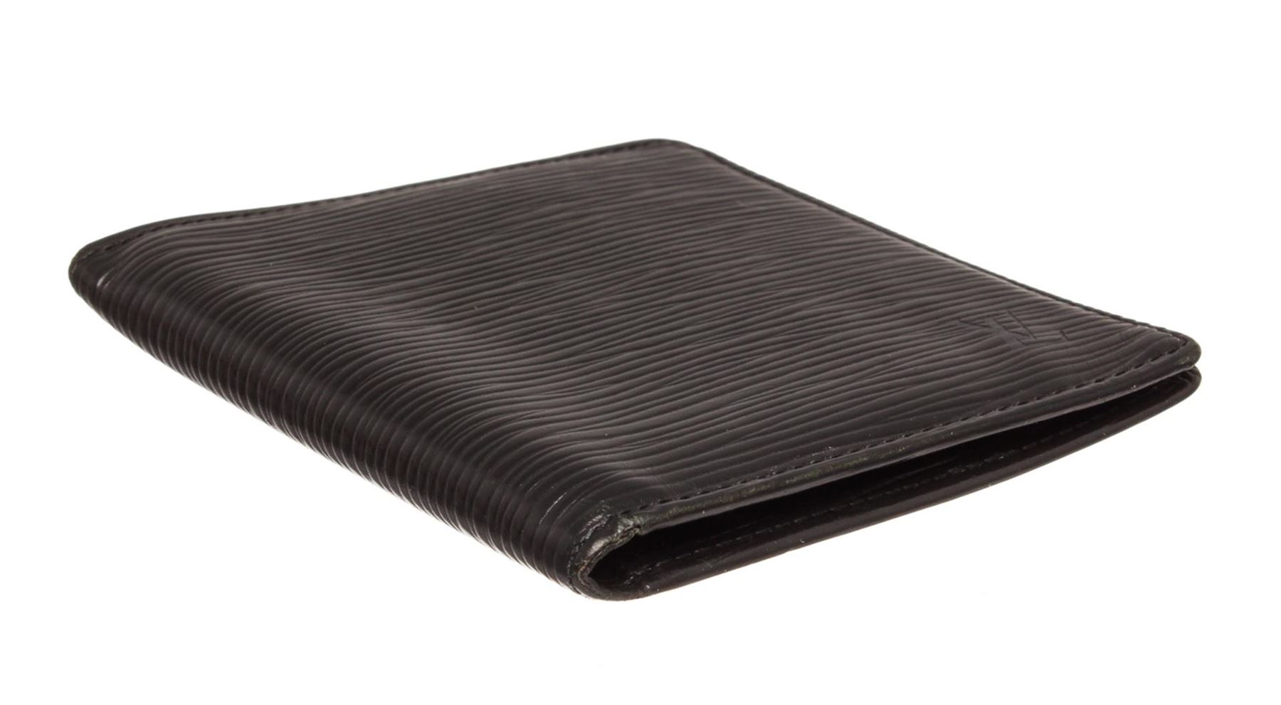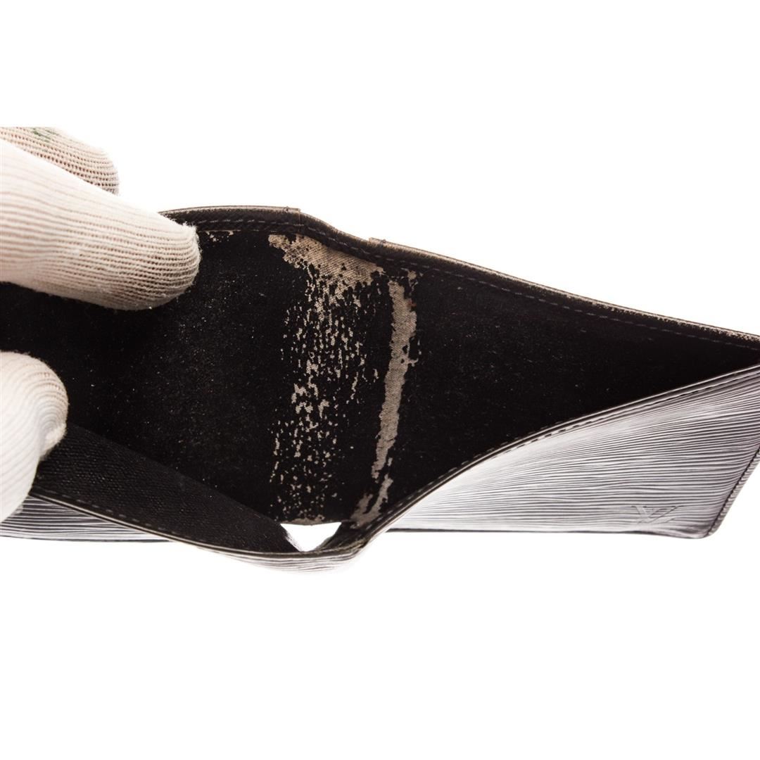 Louis Vuitton black Epi leather bill fold wallet with six card slots, bill pocket, and two side pockets.