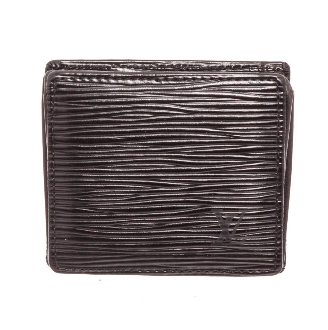 Louis Vuitton Black Epi Leather Boite Coin Case Wallet with silver-tone hardware, tonal taiga lining, one open coin compartment and overall snap button closure. Measurements: Length: 2.95 in / 7 cm Width: 5 in / 13 cm 3.34 in / 8 cmCONDITION: Pre-Owned Good overall, please see photographs for detail.