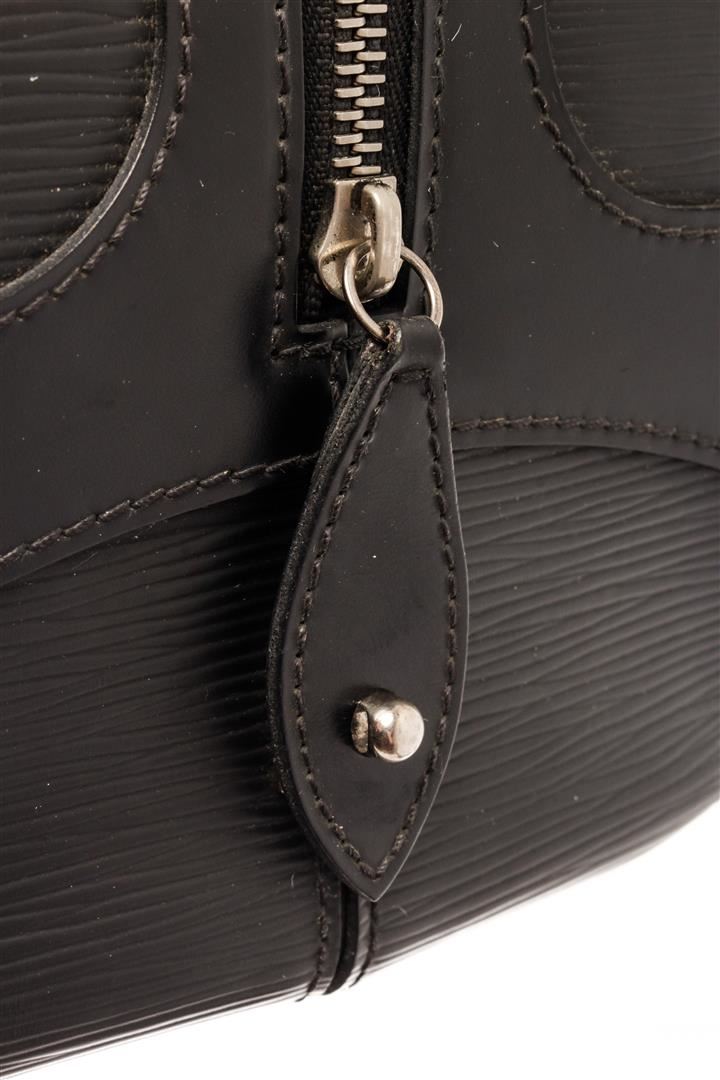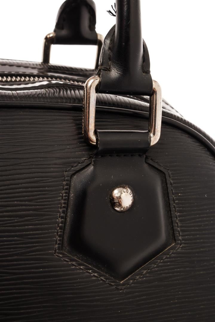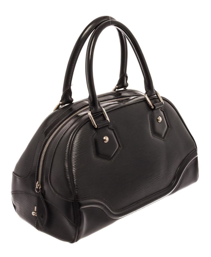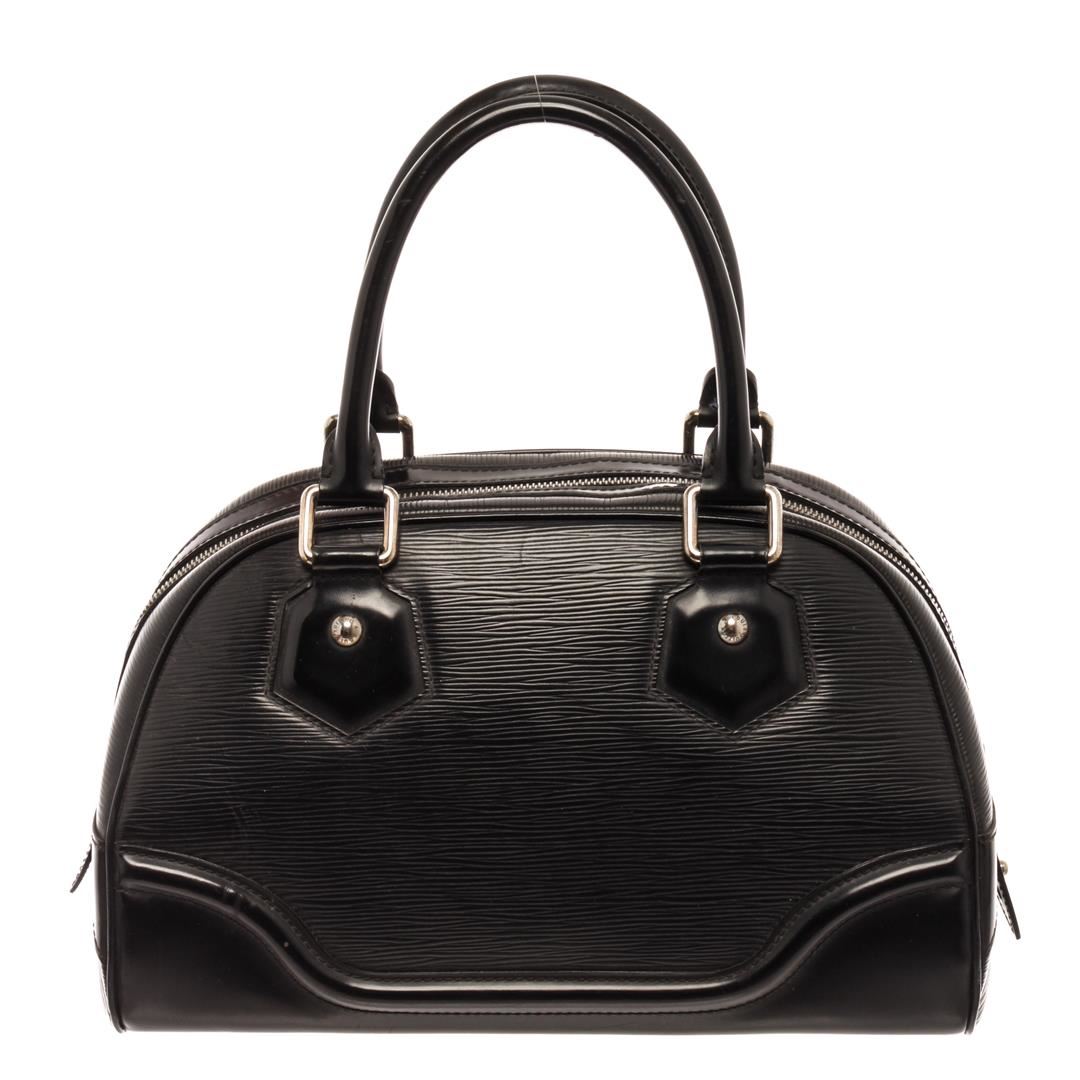 Louis Vuitton Black Epi Leather Bowling Montaigne PM Satchel Bag. All available information is listed in the description and shown in the photos. Louis Vuitton Black Epi Leather Bowling Montaigne PM Satchel Bag, silver-tone hardware, rolled handles, canvas lining & dual interior pockets, zip closure at top, protective feet at base, includes dust bag & lock. Condition Details: Some creasing and surface scratching. Minor scuffs on handles. Height: 8" Width: 13" Depth: 7.25", Handle Drop: 5" / 20.32 x 33.02 x 18.41 Cm